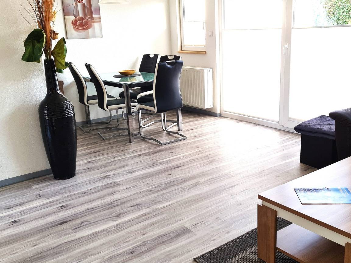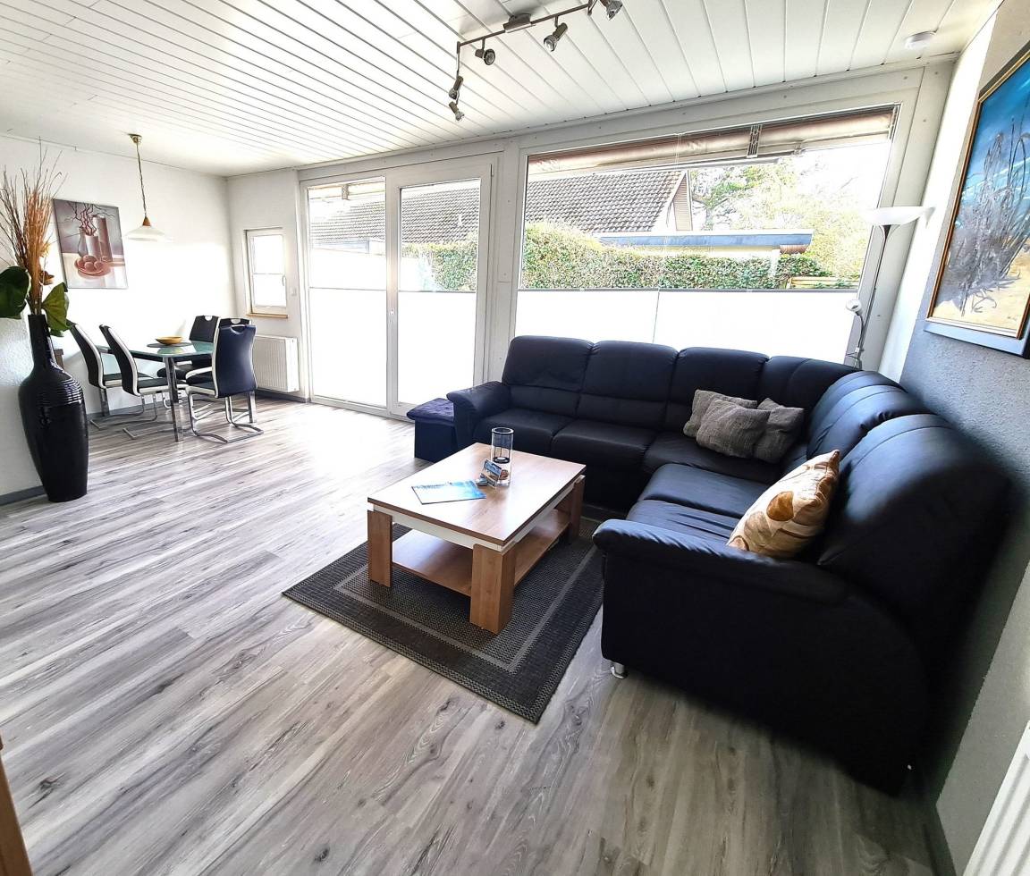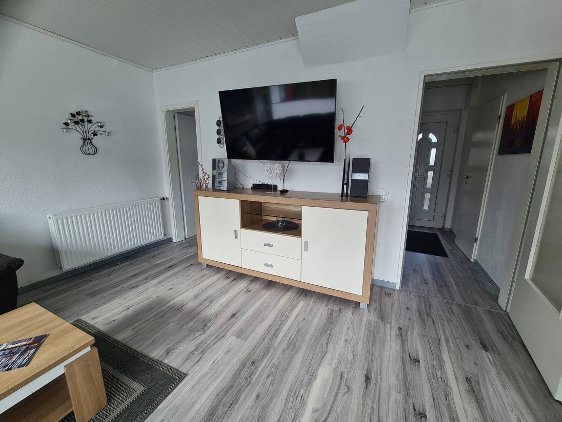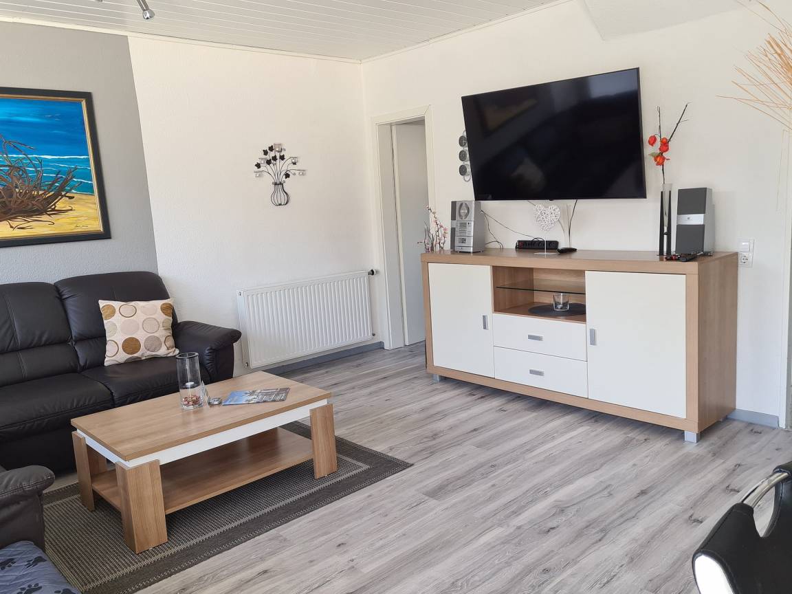 Das große, moderne Wohnzimmer (Vinylboden) ist mit Sat-TV und einem Radio ausgestattet und befindet sich im Erdgeschoss.