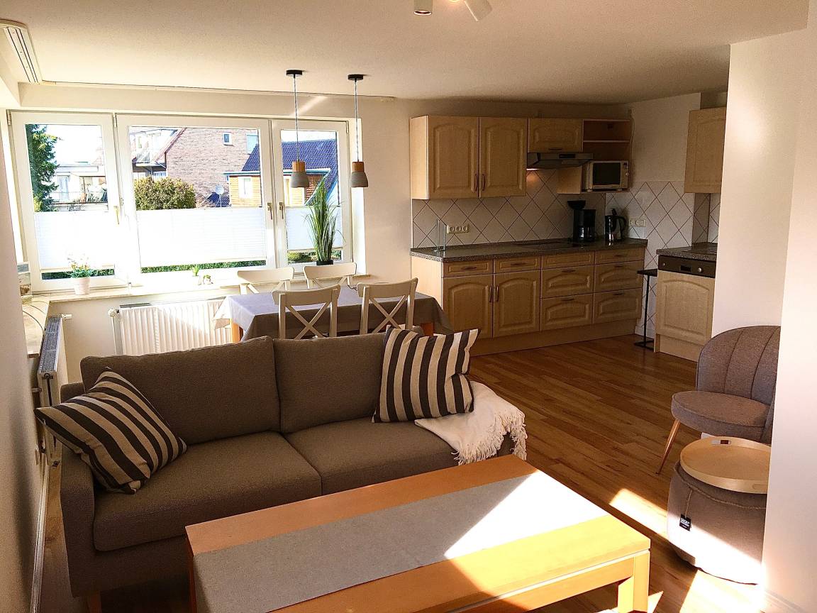 Im großen Wohnzimmer stehen ein Sofa mit Sessel und ein Beistelltisch sowie ein 32 Zoll großer HD Fernseher, zudem ein Radio CD Player und WLAN. Die Küchenzeile ist mit einem vier Platten Ceran-Kochfeld, Kühlschrank, Gefrierfach, Geschirrspülmaschine, Mikrowelle, Kaffeemaschine, Toaster und Wasserkocher ausgestattet. Geschirr, Töpfe, Pfannen und Gläser gehören auch dazu. Ein Esstisch mit vier Stühlen steht zur Verfügung.