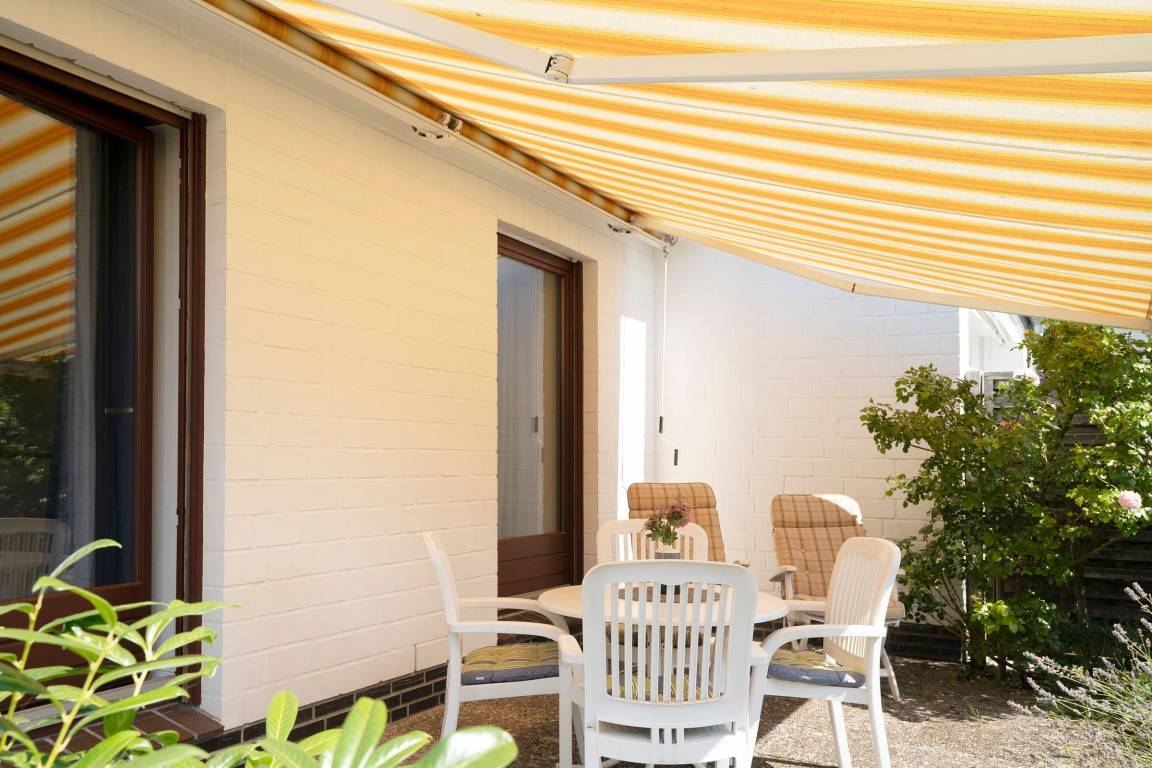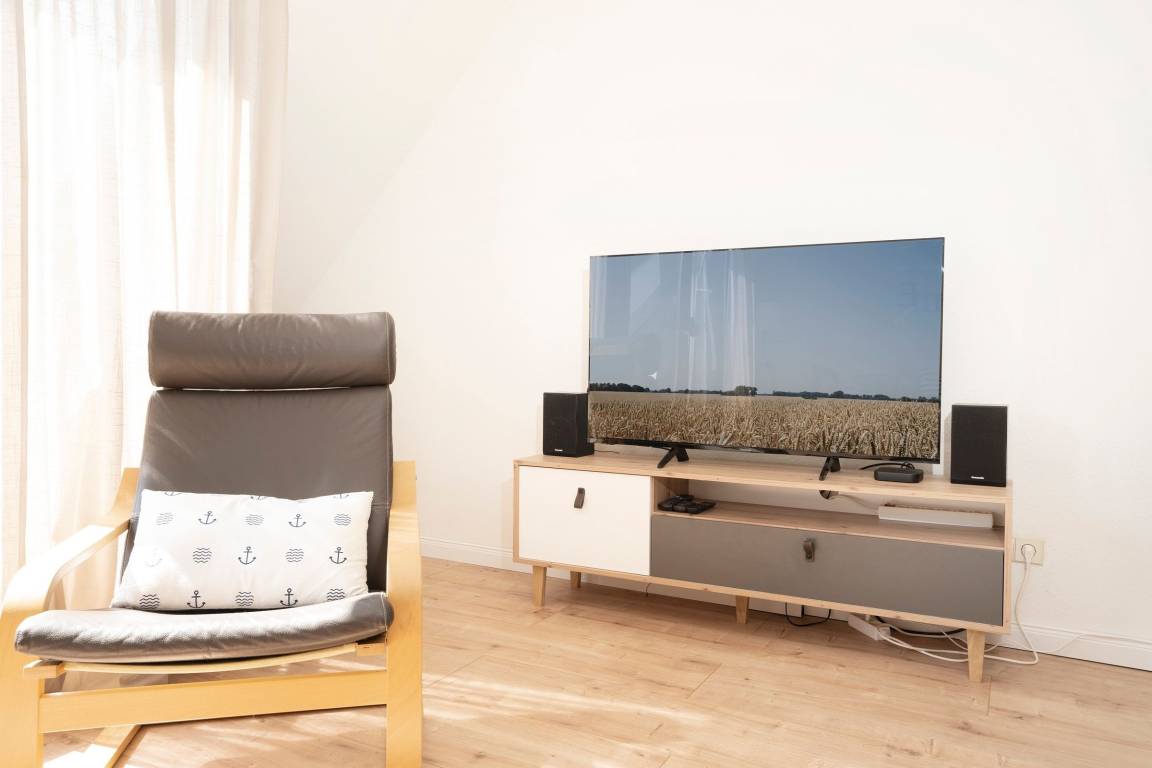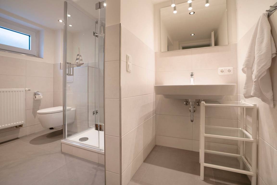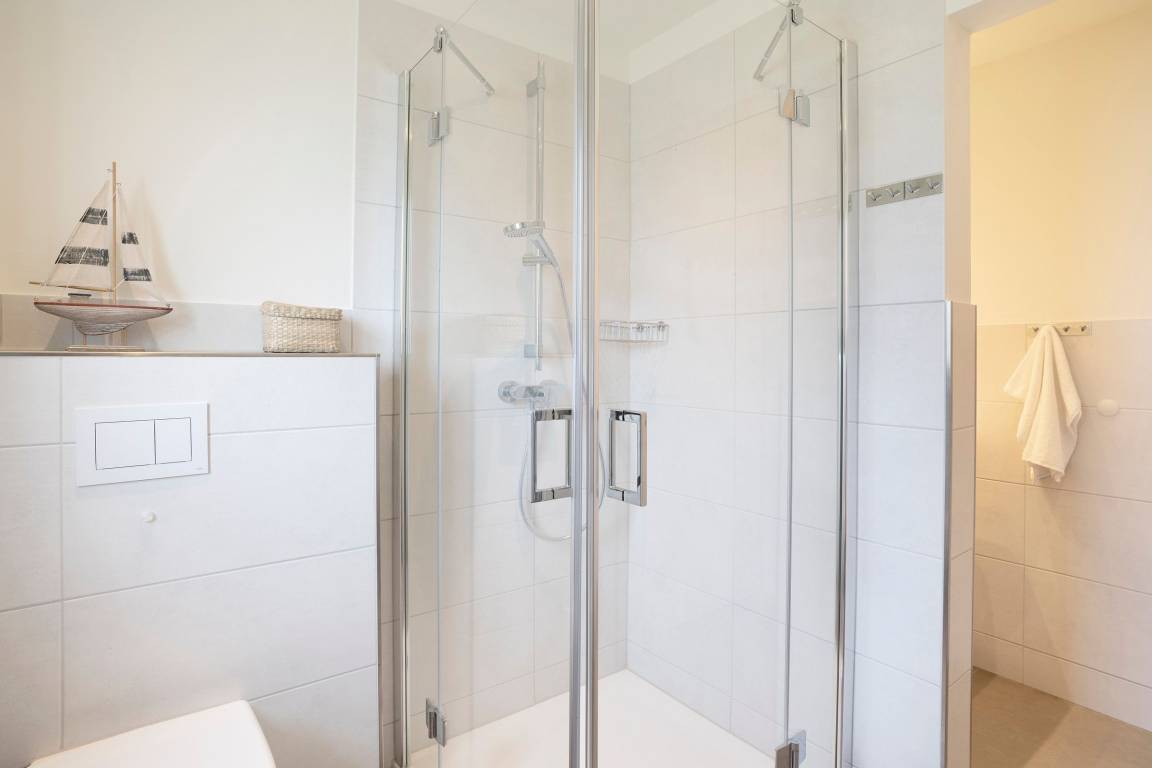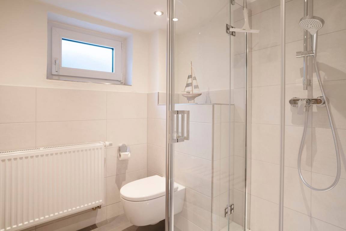 Vom Flur im Erdgeschoss aus gelangen Sie rechts in das erste der insgesamt drei Schlafzimmer. Ein hübsches Kinderzimmer mit einem Einzelbett (90x200 cm), 2 Kleiderschränken im maritimen Strandhütten-Stil und diverse Kinderbücher & Spiele begrüßen die kleinen Gäste. Eine Tür weiter befindet sich das zweite Schlafzimmer mit einem weiteren Einzelbett (90x200 cm) und einer Kommode. Von diesen beiden Zimmern führt jeweils ein direkter Zugang auf die möblierte Süd-Terrasse. Ein paar Schritte weiter den Flur entlang erreichen Sie das dritte Schlafzimmer: das bequeme Doppelbett (2x 90x200 cm) sorgt für gemütliche Nächte, im Kleiderschrank können Sie Ihre Urlaubsgarderobe perfekt verstauen. Alle Schlafräume lassen sich mit Außenjalousien angenehm verdunkeln. Starten Sie ausgeruht in den neuen Tag mit einer erfrischenden Dusche im hellen Tageslicht-Bad. Um Hektik am Morgen zu vermeiden, gibt es im Keller ein weiteres modernes Duschbad mit Fenster. Eine individuell steuerbare Fußbodenheizung sorgt für angenehme Temperaturen im ganzen Haus.