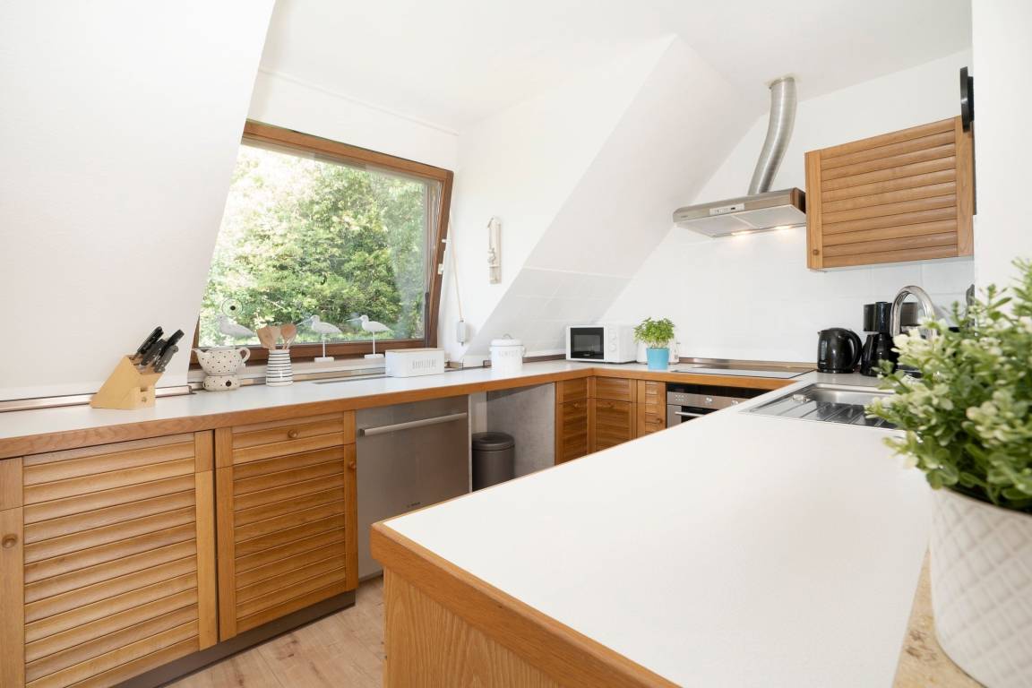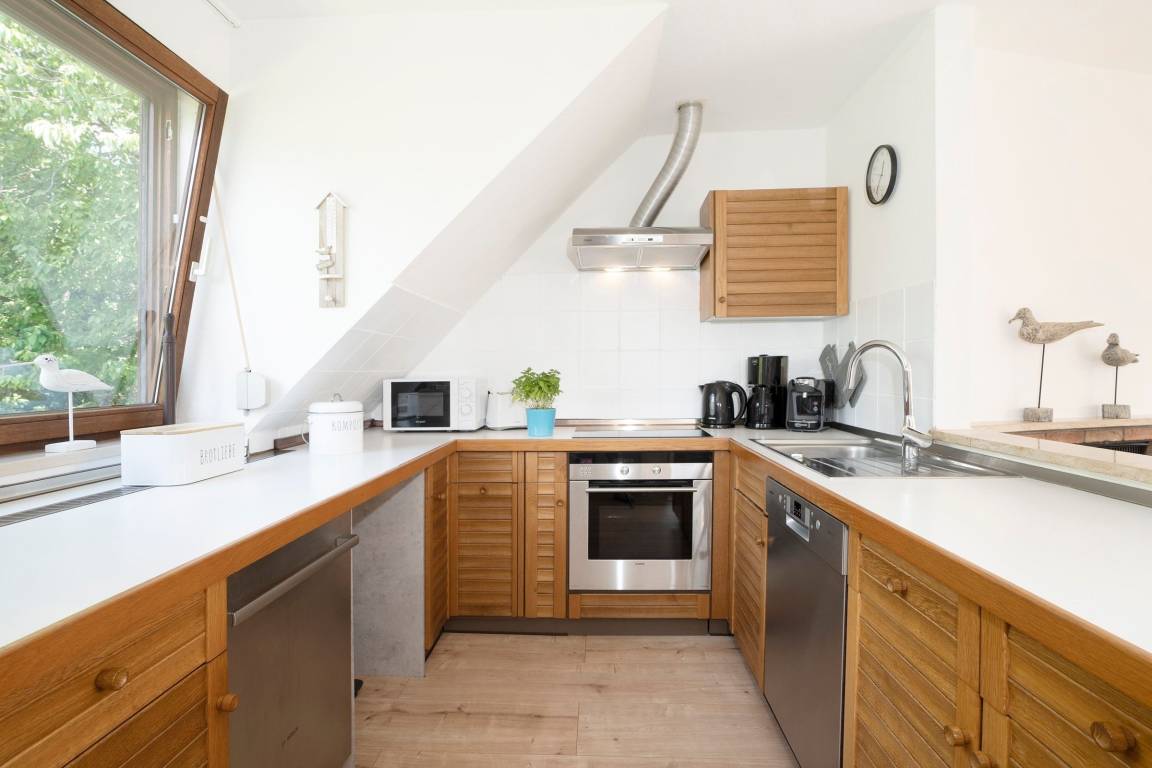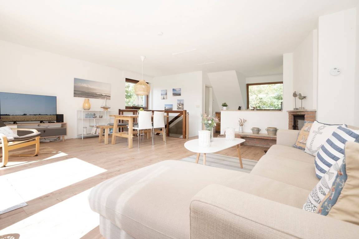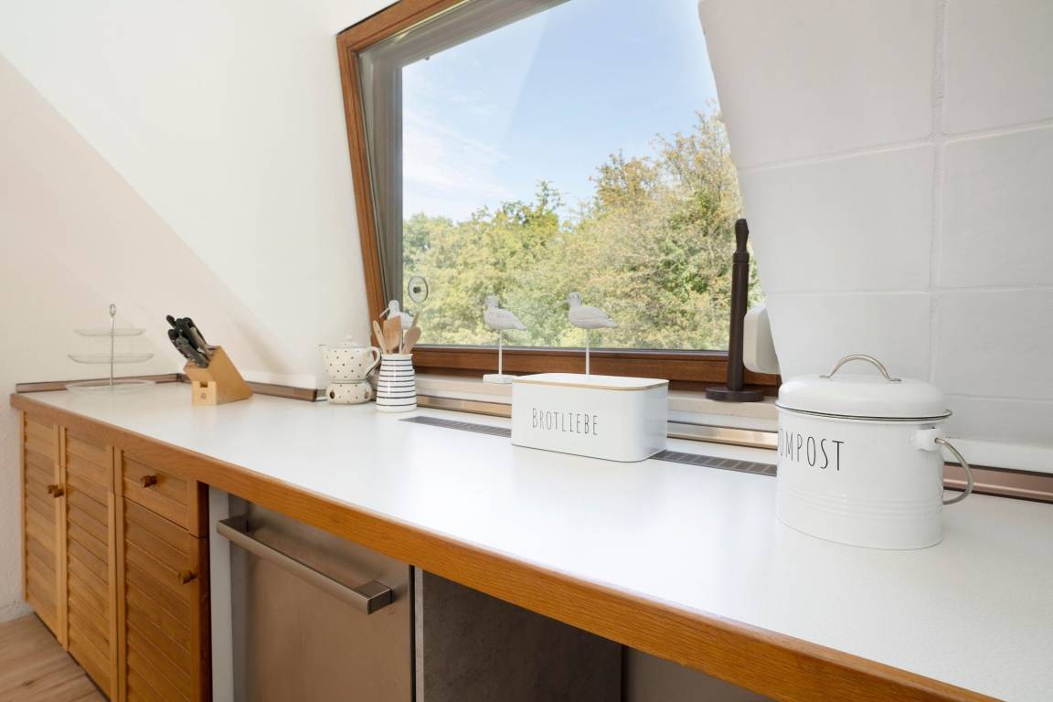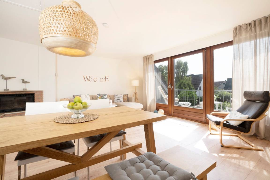Im offenen Galeriebereich im Obergeschoss befindet sich die offene Küche und der Wohnbereich - von hier aus erreichen Sie den Balkon mit Süd-Ausrichtung. Nehmen Sie Platz auf dem Ecksofa oder an dem großen Esstisch und genießen Sie das knisternde Feuer und die wohlige Wärme des Kamins.