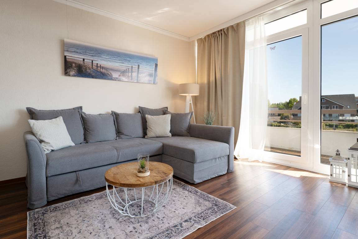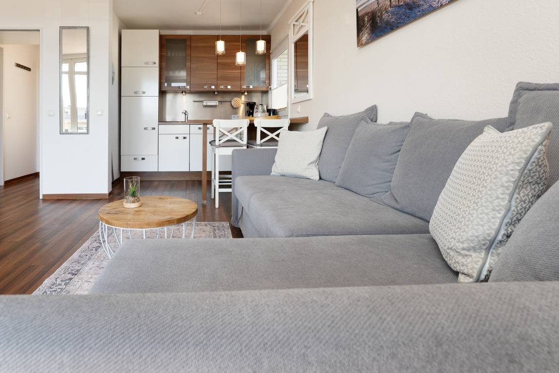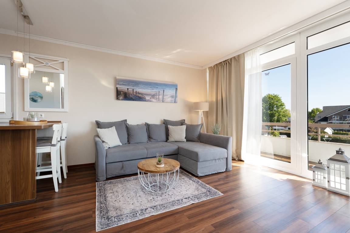 Im Wohnzimmer sind Schlafmöglichkeiten für max. 2 Erwachsene und 2 Kinder vorhanden: Auf einem hochwertigen Schrankbett (140x200 cm) und auf einer bequemen Schlafcouch (150x200 cm). Ein großer Flachbild-TV, ein DVD-Player und ein Radio/CD-Player sorgen für Unterhaltung, auch an Regentagen. Ein Deckenventilator im Wohnzimmer sorgt auch an Sommertagen für gutes Raumklima. Vom Wohnbereich führt ein direkter Zugang auf den geschmackvoll möblierten Balkon, perfekt um abends lange Strandtage ausklingen zu lassen oder auch den ersten Kaffee am Morgen inklusive einer Prise frischer Ostseeluft zu genießen! Eine offene, gut ausgestattete Einbauküche mit geselligem Küchentresen gehört ebenso zur hochwertigen Ausstattung wie auch eine Spülmaschine, ein Herd mit Ceranfeld und Abzugshaube, sowie eine Mikrowelle. Das geschmackvolle Duschbad ist in warmen Farben gestaltet und mit modernsten Annehmlichkeiten ausgestattet. Der WLAN-Anschluss ist inklusive.