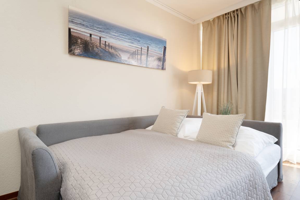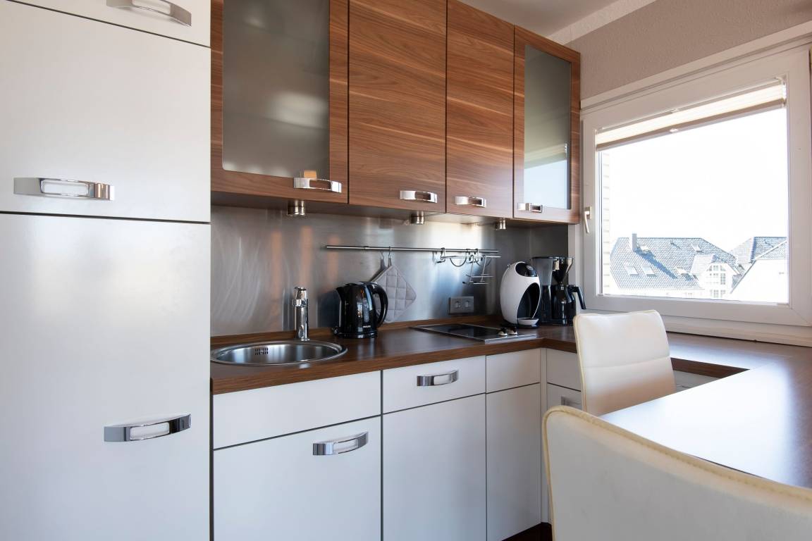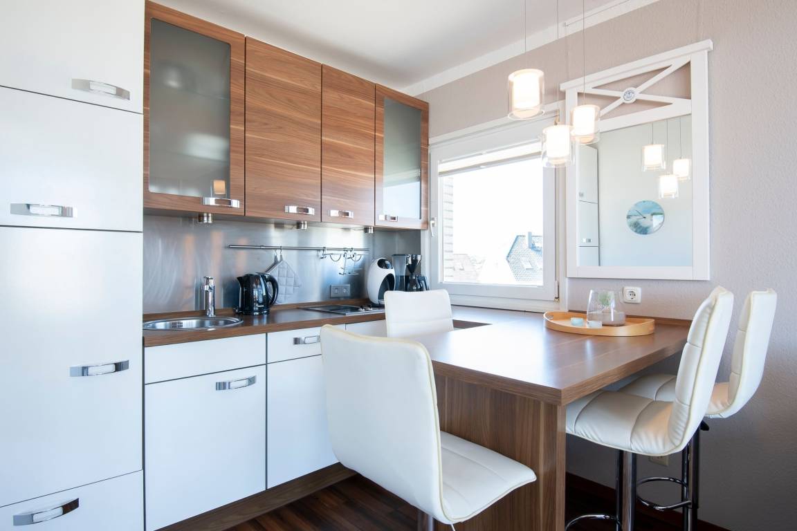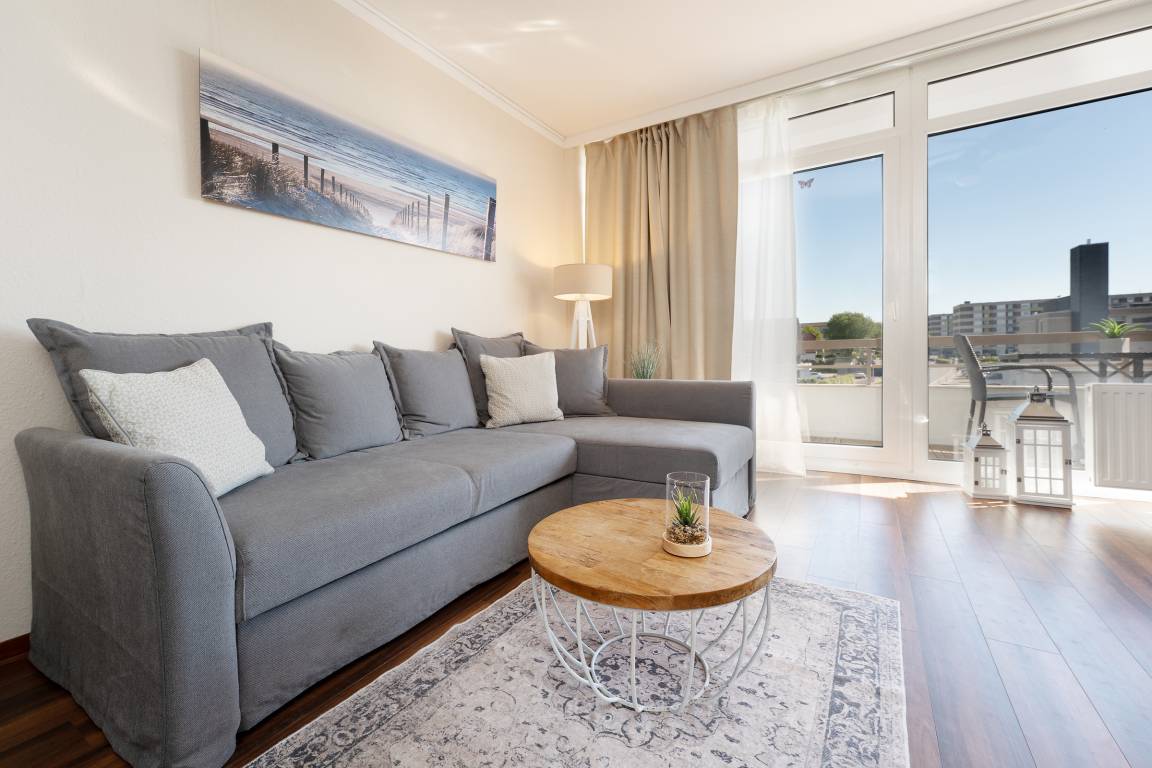 Im Wohnzimmer sind Schlafmöglichkeiten für max. 2 Erwachsene und 2 Kinder vorhanden: Auf einem hochwertigen Schrankbett (140x200 cm) und auf einer bequemen Schlafcouch (150x200 cm). Ein großer Flachbild-TV, ein DVD-Player und ein Radio/CD-Player sorgen für Unterhaltung, auch an Regentagen. Ein Deckenventilator im Wohnzimmer sorgt auch an Sommertagen für gutes Raumklima. Vom Wohnbereich führt ein direkter Zugang auf den geschmackvoll möblierten Balkon, perfekt um abends lange Strandtage ausklingen zu lassen oder auch den ersten Kaffee am Morgen inklusive einer Prise frischer Ostseeluft zu genießen! Eine offene, gut ausgestattete Einbauküche mit geselligem Küchentresen gehört ebenso zur hochwertigen Ausstattung wie auch eine Spülmaschine, ein Herd mit Ceranfeld und Abzugshaube, sowie eine Mikrowelle. Das geschmackvolle Duschbad ist in warmen Farben gestaltet und mit modernsten Annehmlichkeiten ausgestattet. Der WLAN-Anschluss ist inklusive.