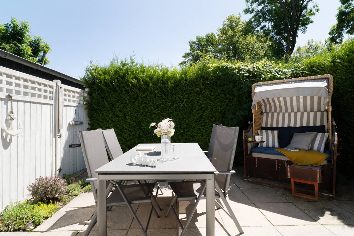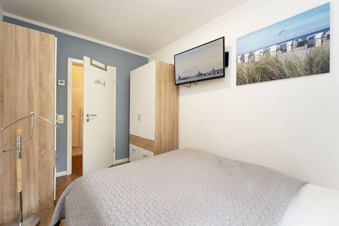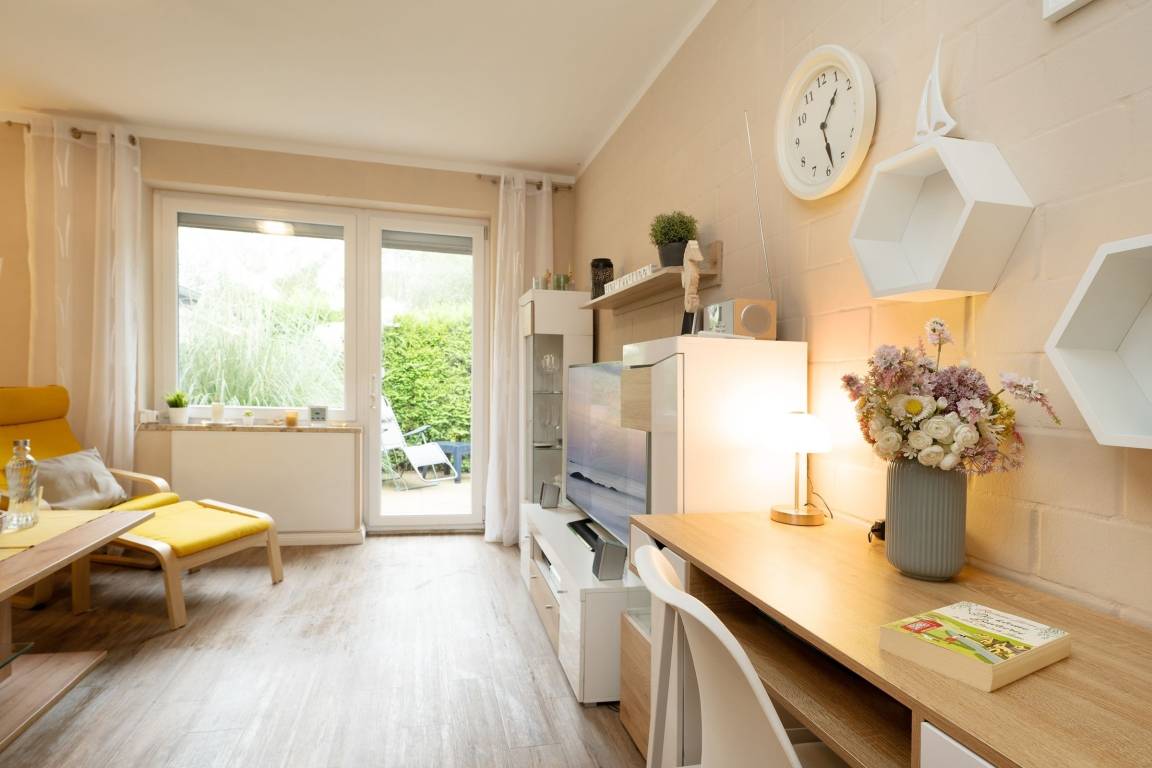 Ein hell und freundlich eingerichteter Wohnraum mit integrierter Küche bildet das Herzstück dieser gemütlichen Ferienwohnung. Von hier aus gelangen Sie auch auf Ihre kleine idyllische möblierte Sonnenterrasse mit eigenem Strandkorb. Zur Zubereitung eines schmackhaften Frühstücks, Mittag- oder Abendessens finden Sie in der modernen Küche alles, was Sie benötigen. Das Doppelbett (160x200 cm) im geschmackvoll eingerichteten Schlafzimmer lädt zum Träumen und Entspannen ein, hier sorgt ein zweites Fernsehgerät bei Bedarf für Unterhaltung zum Einschlafen.