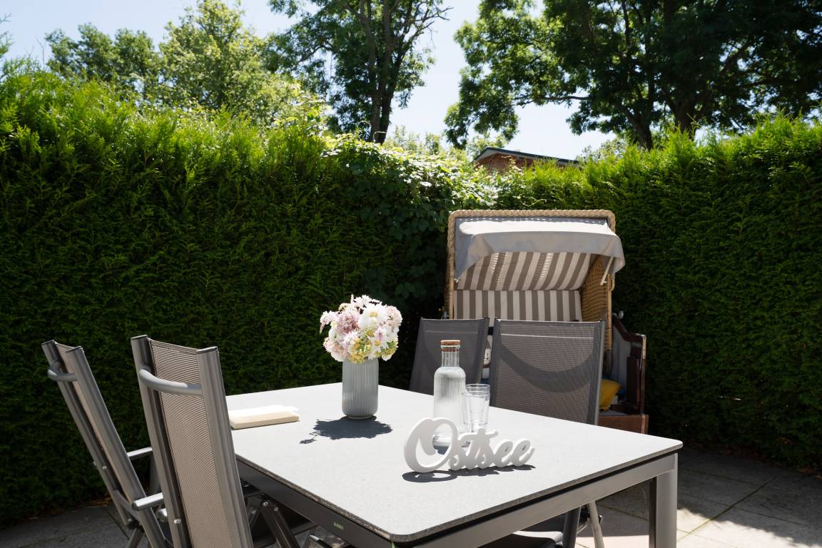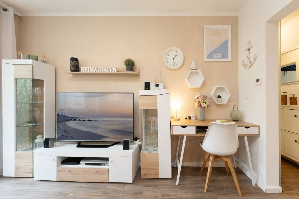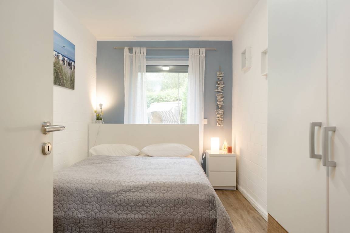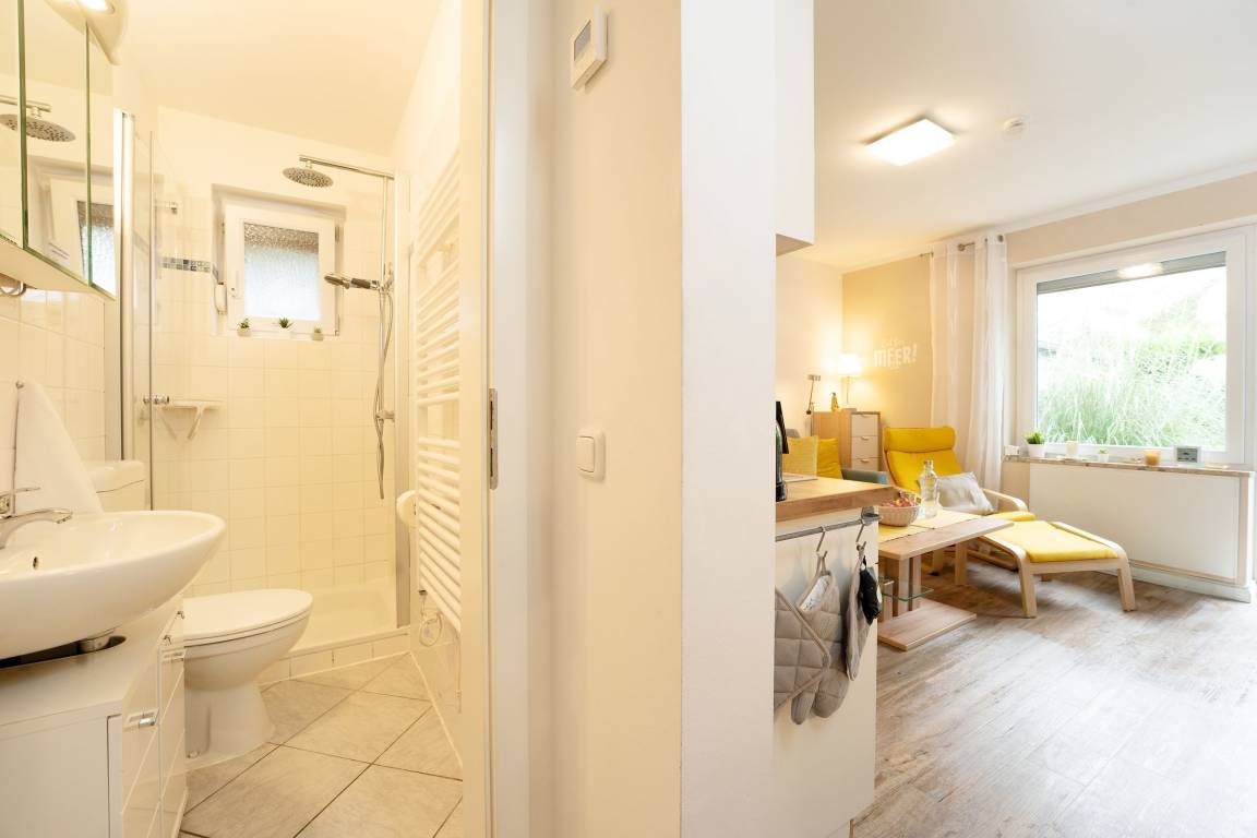 Ein hell und freundlich eingerichteter Wohnraum mit integrierter Küche bildet das Herzstück dieser gemütlichen Ferienwohnung. Von hier aus gelangen Sie auch auf Ihre kleine idyllische möblierte Sonnenterrasse mit eigenem Strandkorb. Zur Zubereitung eines schmackhaften Frühstücks, Mittag- oder Abendessens finden Sie in der modernen Küche alles, was Sie benötigen. Das Doppelbett (160x200 cm) im geschmackvoll eingerichteten Schlafzimmer lädt zum Träumen und Entspannen ein, hier sorgt ein zweites Fernsehgerät bei Bedarf für Unterhaltung zum Einschlafen.