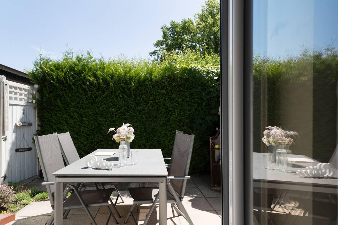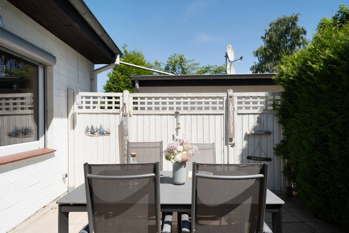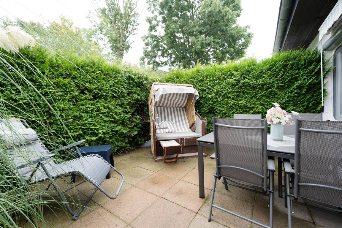 „Sehr schöne Wohnung, klein, aber ausreichend für 1-2 Personen mit Hund. Sehr gute Ausstattung. Auch bei Hitze war die Wohnung schön kühl, weil Rolläden vorhanden sind. Uneinsehbare und eingefasste Terrasse, mit Markise, ist vorhanden. Schöne Terassenmöbel. Abschließbarer Fahrradraum vorhanden.“