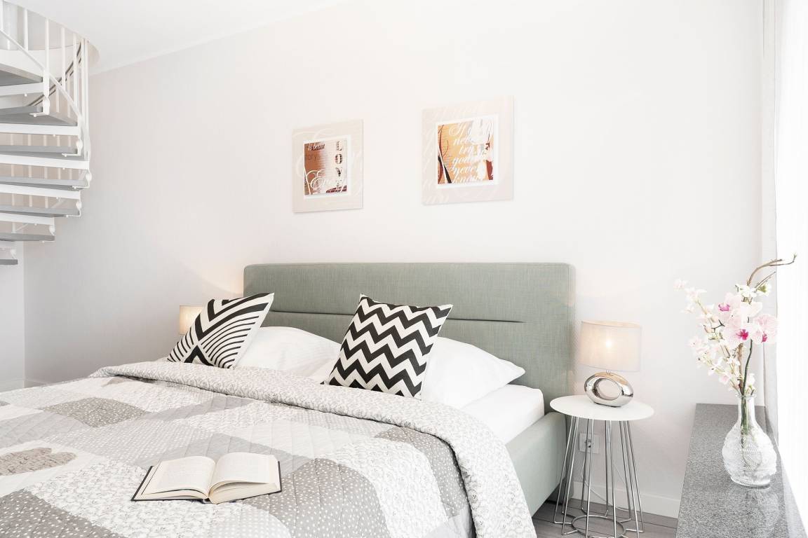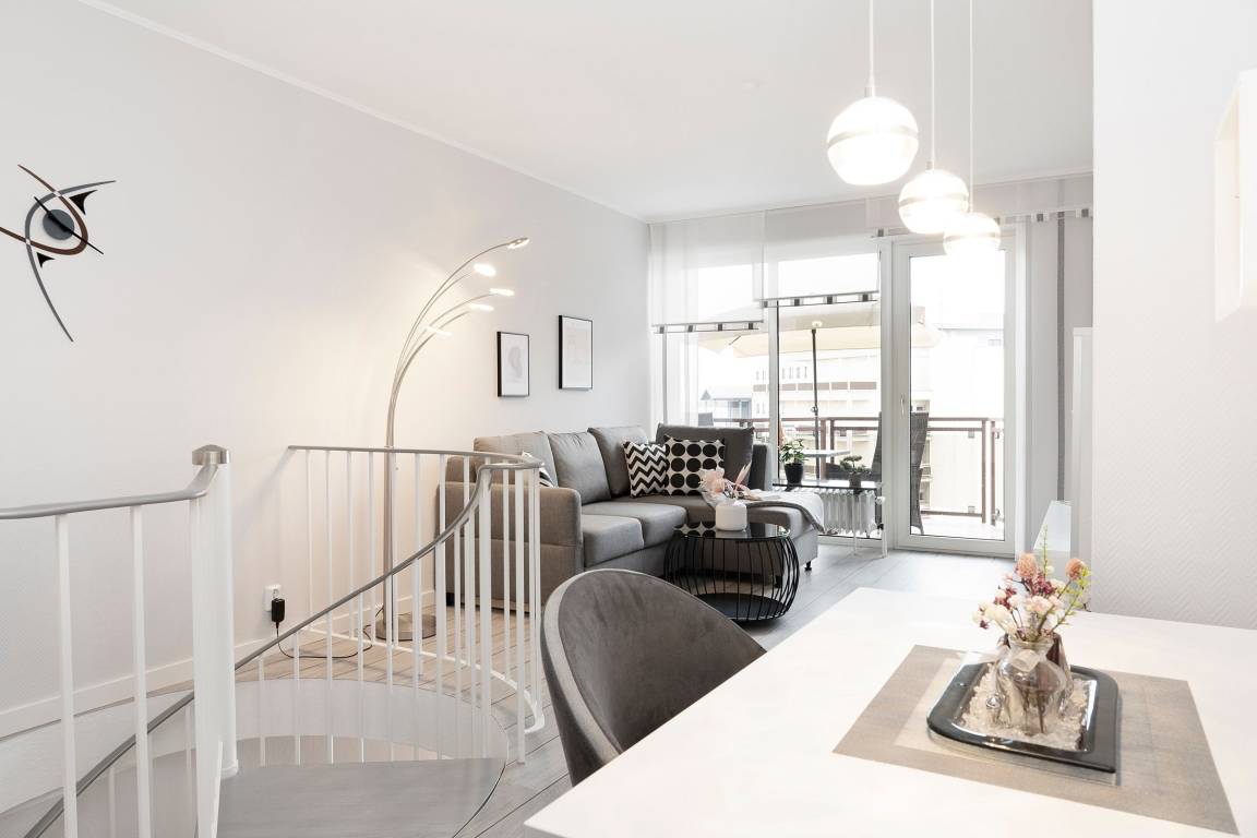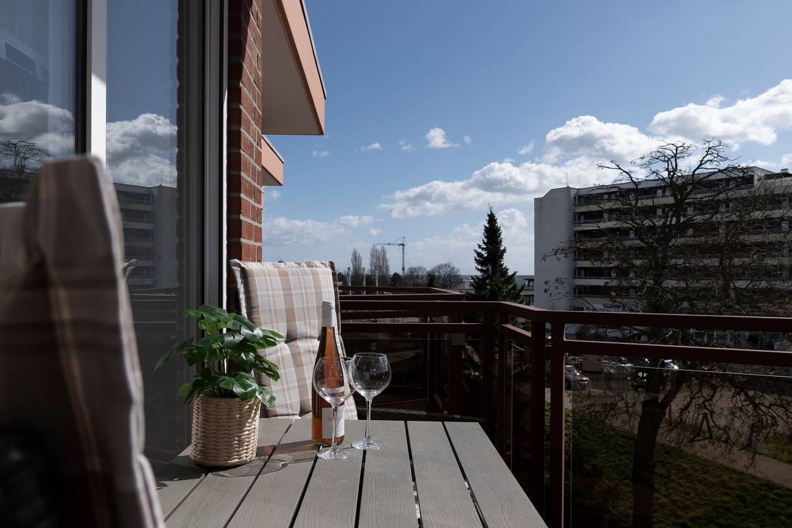 Von einem kleinen Flur gelangen Sie in das Schlafzimmer, in dem ein komfortables Doppelbett (2x 90x200 cm) darauf wartet, Ihnen traumhafte Nächte zu bescheren. Auf dem eigenen Balkon können Sie den Tag direkt nach dem Aufstehen mit gesunder Ostseeluft begrüßen. Ihre Urlaubsgarderobe verstauen Sie bequem im großen Kleiderschrank. Auf dieser Ebene befindet sich außerdem das moderne Duschbad. Über eine Wendeltreppe erreichen Sie den individuell gestalteten Wohnbereich, der viel Raum für eine erholsame Auszeit bietet. Auf dem gemütlichen Sofa können Sie die Seele baumeln lassen. Ein TV-Gerät, eine Hifi-Anlage und ein kostenloser WLAN-Anschluss sorgen für Unterhaltung. Außerdem erwartet Sie eine offene Küche mit separatem Essplatz. Der Ceranherd mit Backofen, Kühlschrank inkl. Gefrierfach, Spülmaschine und weitere Annehmlichkeiten werden Sie begeistern. Bereiten Sie sich doch einen fangfrischen Ostseefisch in Ihrer Unterkunft zu. Diesen können Sie dann auf dem möblierten Balkon mit seitlichem, saisonalen Blick auf die Ostsee und einem Glas Wein genießen. Die gesamte Wohnung ist durch Außenjalousien verdunkelbar.