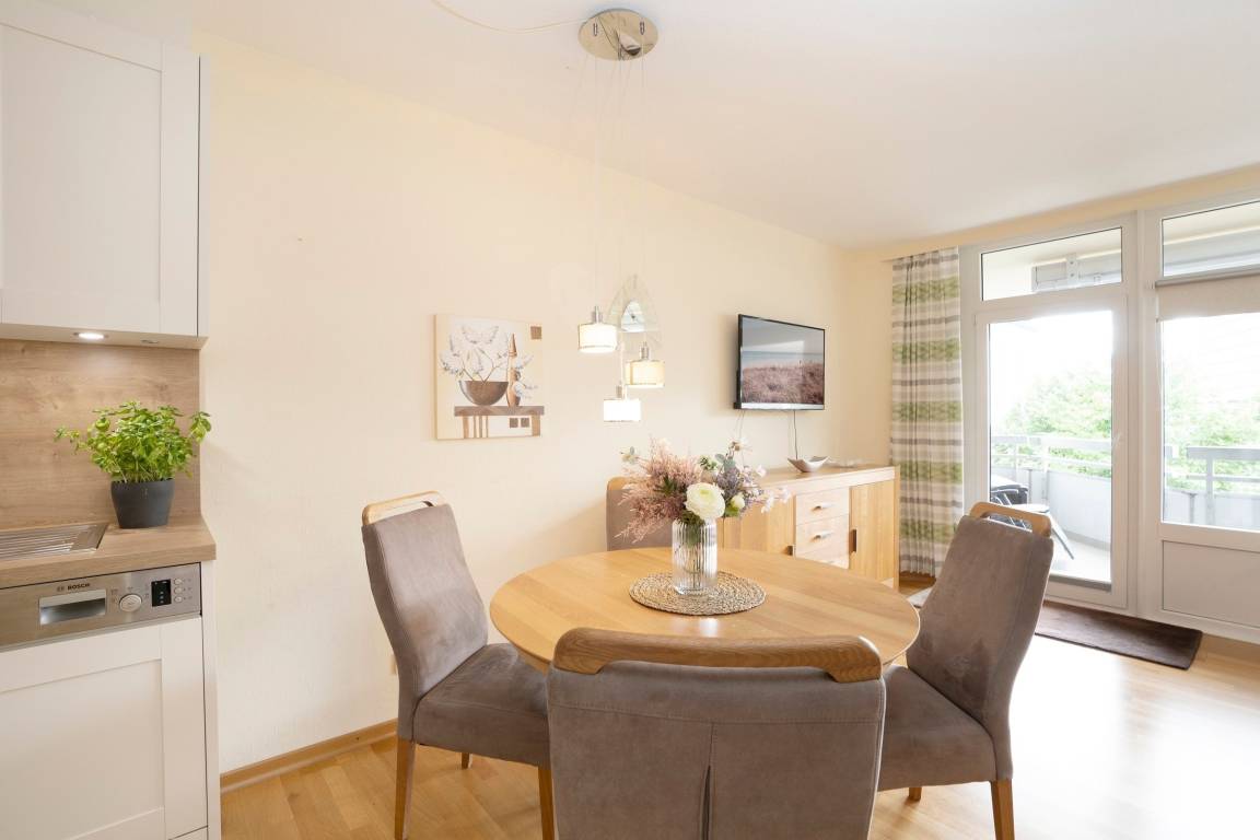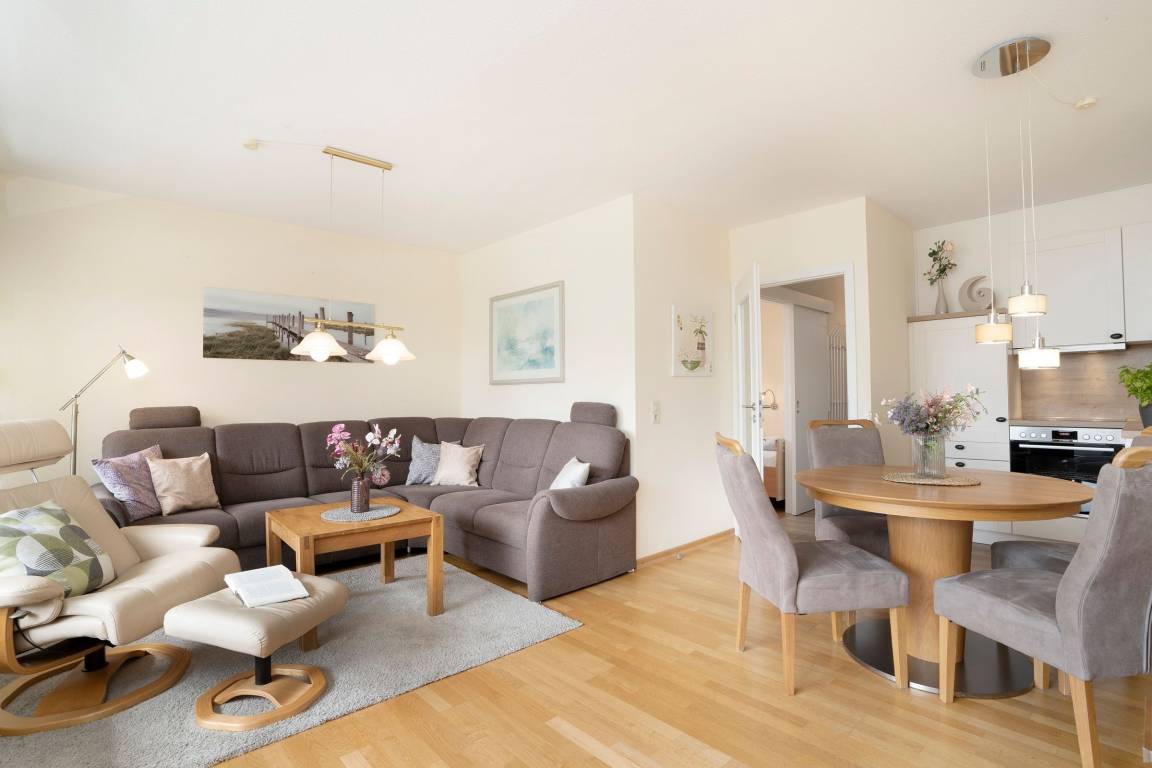 Im Wohnzimmer erwartet Sie ein Fernseher sowie ein kostenloser WLAN Anschluss, um immer Up to Date zu sein. Die voll ausgestattete Küche mit Spülmaschine, Kaffeemaschine, Toaster, Wasserkocher, Mikrowelle, Kühlschrank, Töpfe, Pfannen, Geschirr & Besteck lässt keine Wünsche offen. Der angrenzende Essbereich bietet Platz für 4 Personen. Zwei Schlafzimmer mit je 2 Einzelbetten (2x 90cm, 1x 80cm, 1x100cm) für insgesamt 4 Personen laden zum entspannen nach einem langen Tag am Strand ein. Das Duschbad ist mit allem ausgestattet, was Sie für Ihre tägliche Körperhygiene benötigen.
