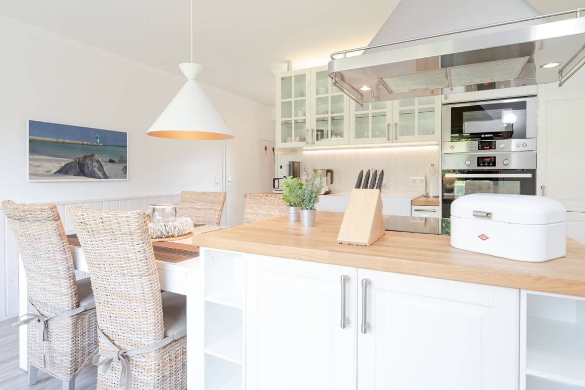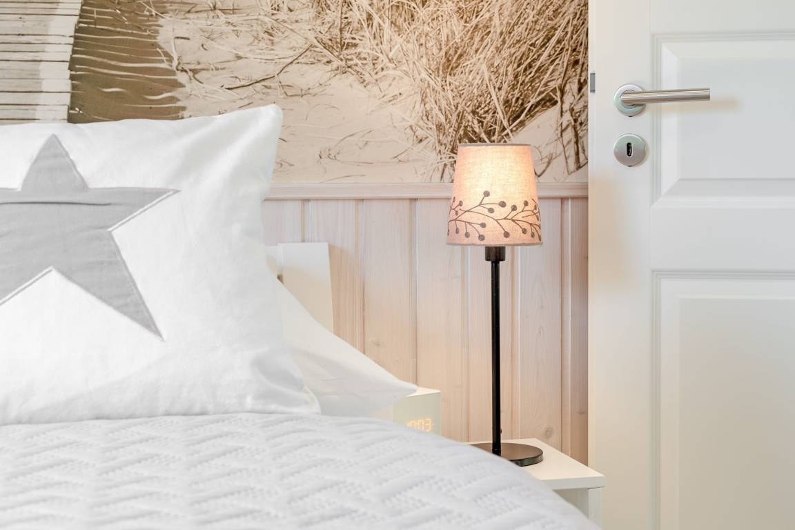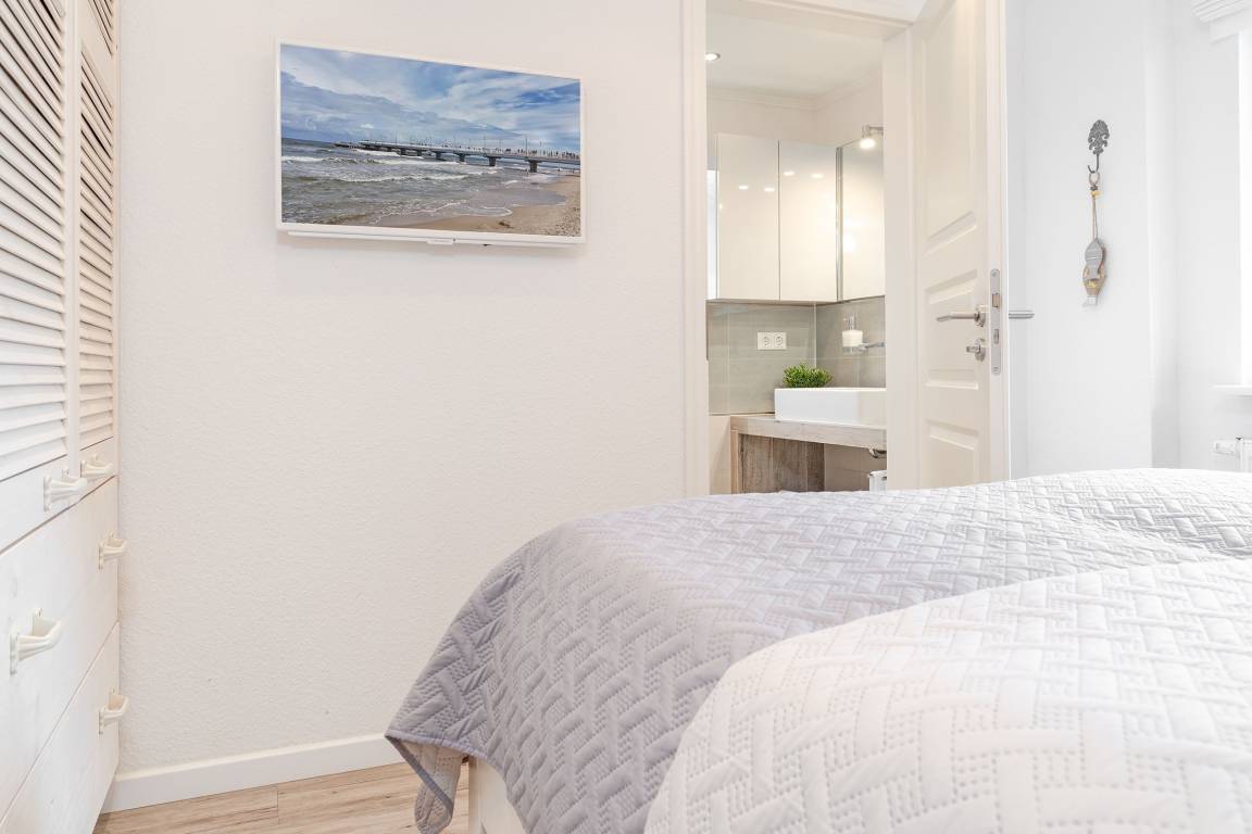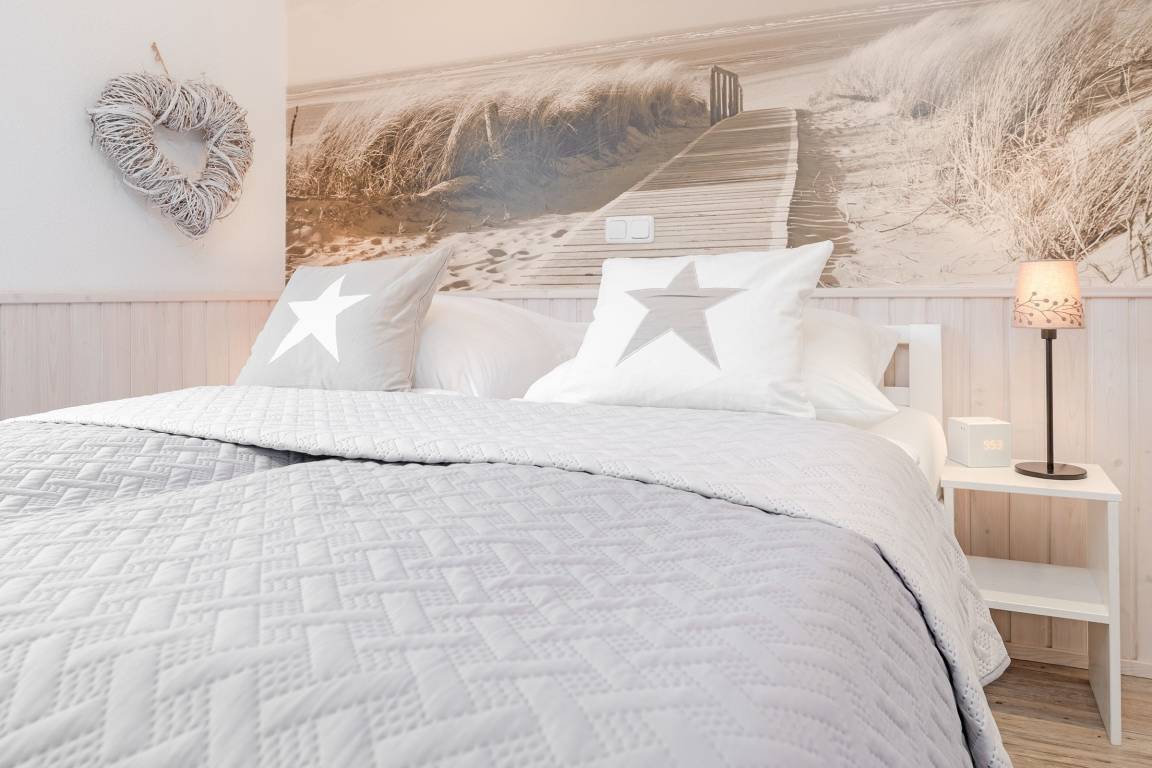 Eine wundervolle Auszeit mit viel Platz und vielen Extras verspricht die Wohnung Wellenreiter im Beachhouse-Stil. Im Wohnbereich können Sie es sich vor dem TV-Gerät (Video on Demand zur Selbstanmeldung) gemütlich machen. Ein Elektrokamin sorgt für eine wohlige Atmosphäre. Auch beim Zubereiten Ihrer Lieblingsspeisen können Sie sich von einem TV-Gerät unterhalten lassen. Die moderne Küche im Landhausstil mit vielen Annehmlichkeiten wie Induktionsherd, Espressomaschine (Dolce Gusto) und Geschirrspüler bringt jeden Hobby-Koch zum Lächeln. Alternativ können Sie im Garten grillen – oder sich auf den Sonnenliegen, im Strandkorb oder auf den Terrassen entspannen. Wie unter einem Sternenhimmel übernachten Sie im Doppelbett (160x200 cm) im Schlafzimmer. Das tageslichthelle Bad en suite punktet mit einer bodengleichen Dusche. Zudem gibt es ein Gäste-WC.