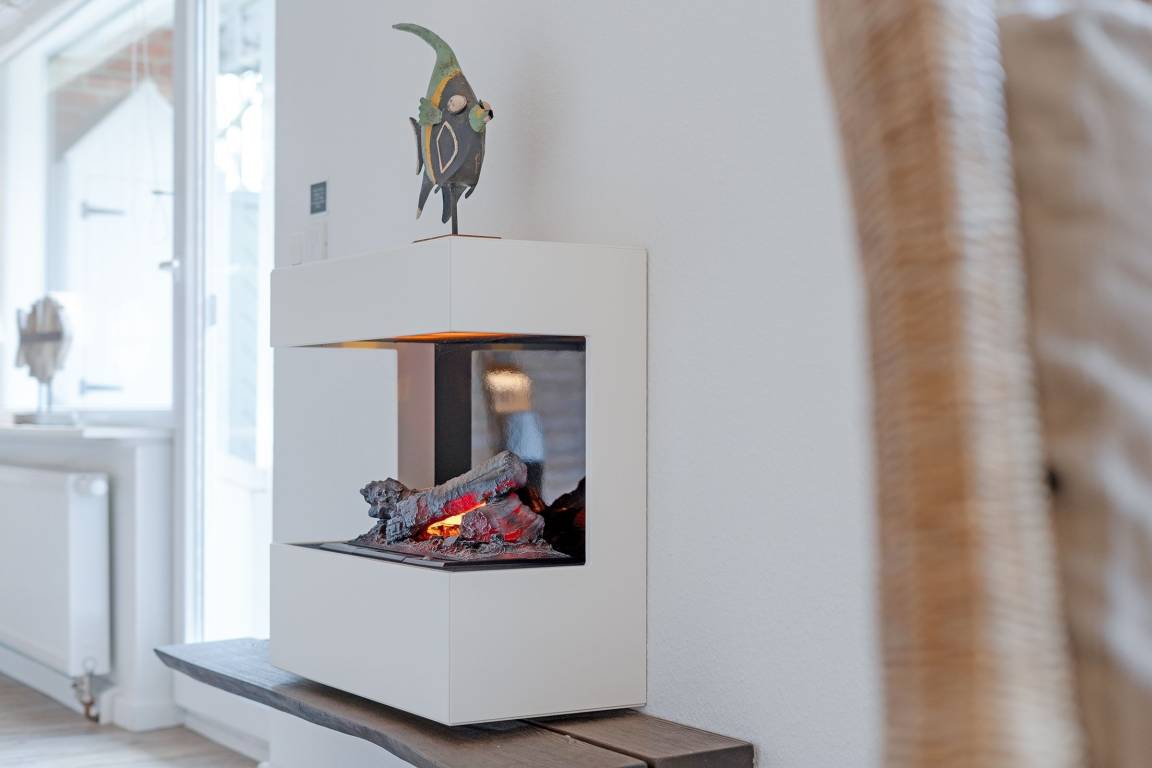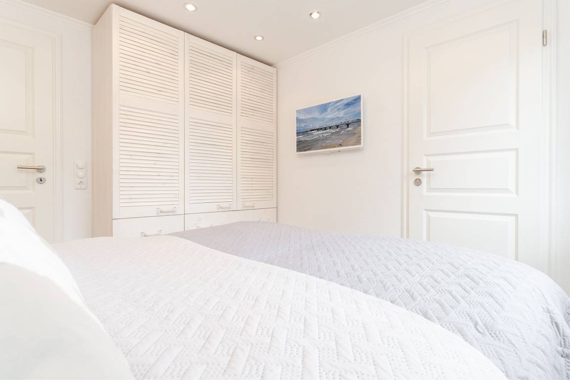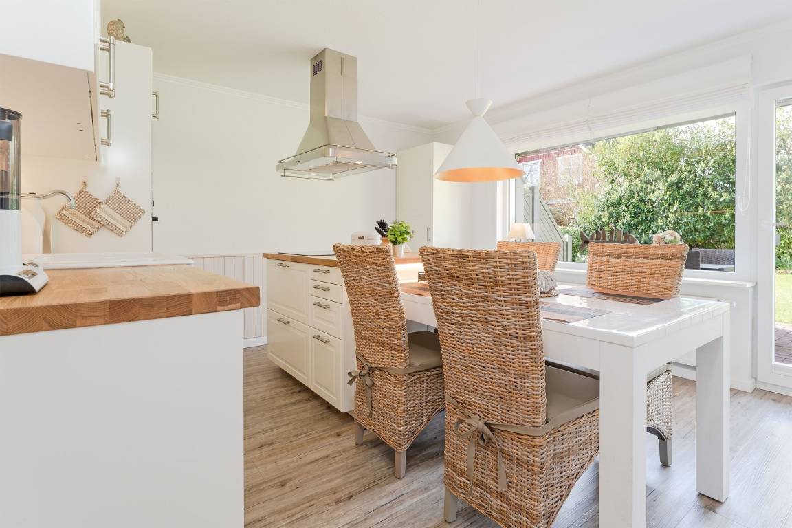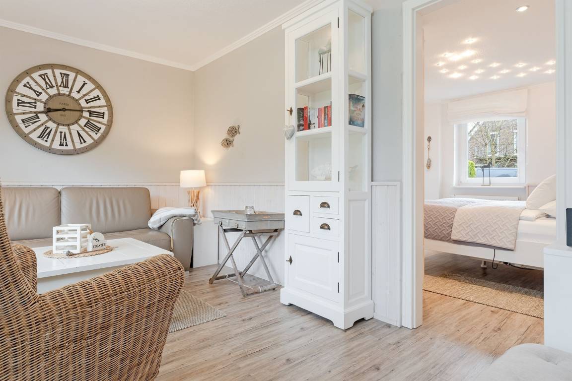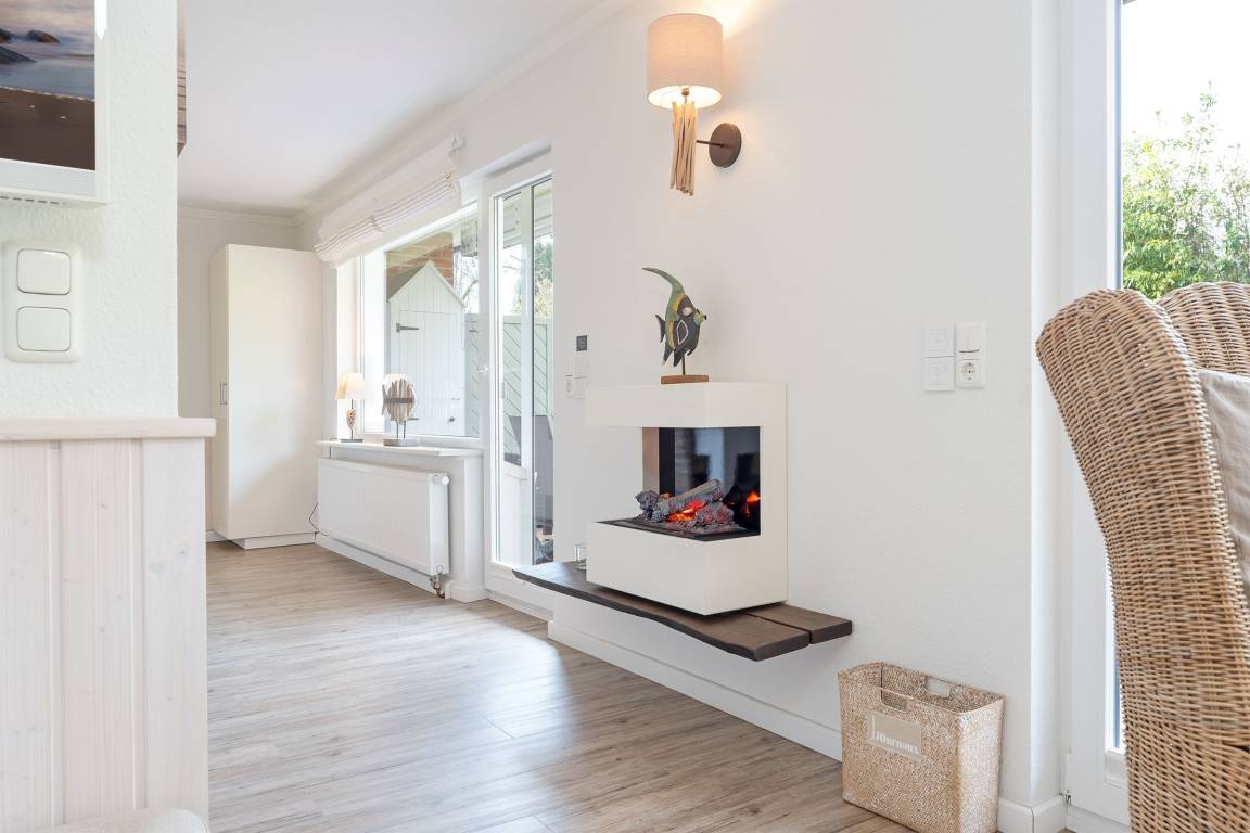 Eine wundervolle Auszeit mit viel Platz und vielen Extras verspricht die Wohnung Wellenreiter im Beachhouse-Stil. Im Wohnbereich können Sie es sich vor dem TV-Gerät (Video on Demand zur Selbstanmeldung) gemütlich machen. Ein Elektrokamin sorgt für eine wohlige Atmosphäre. Auch beim Zubereiten Ihrer Lieblingsspeisen können Sie sich von einem TV-Gerät unterhalten lassen. Die moderne Küche im Landhausstil mit vielen Annehmlichkeiten wie Induktionsherd, Espressomaschine (Dolce Gusto) und Geschirrspüler bringt jeden Hobby-Koch zum Lächeln. Alternativ können Sie im Garten grillen – oder sich auf den Sonnenliegen, im Strandkorb oder auf den Terrassen entspannen. Wie unter einem Sternenhimmel übernachten Sie im Doppelbett (160x200 cm) im Schlafzimmer. Das tageslichthelle Bad en suite punktet mit einer bodengleichen Dusche. Zudem gibt es ein Gäste-WC.