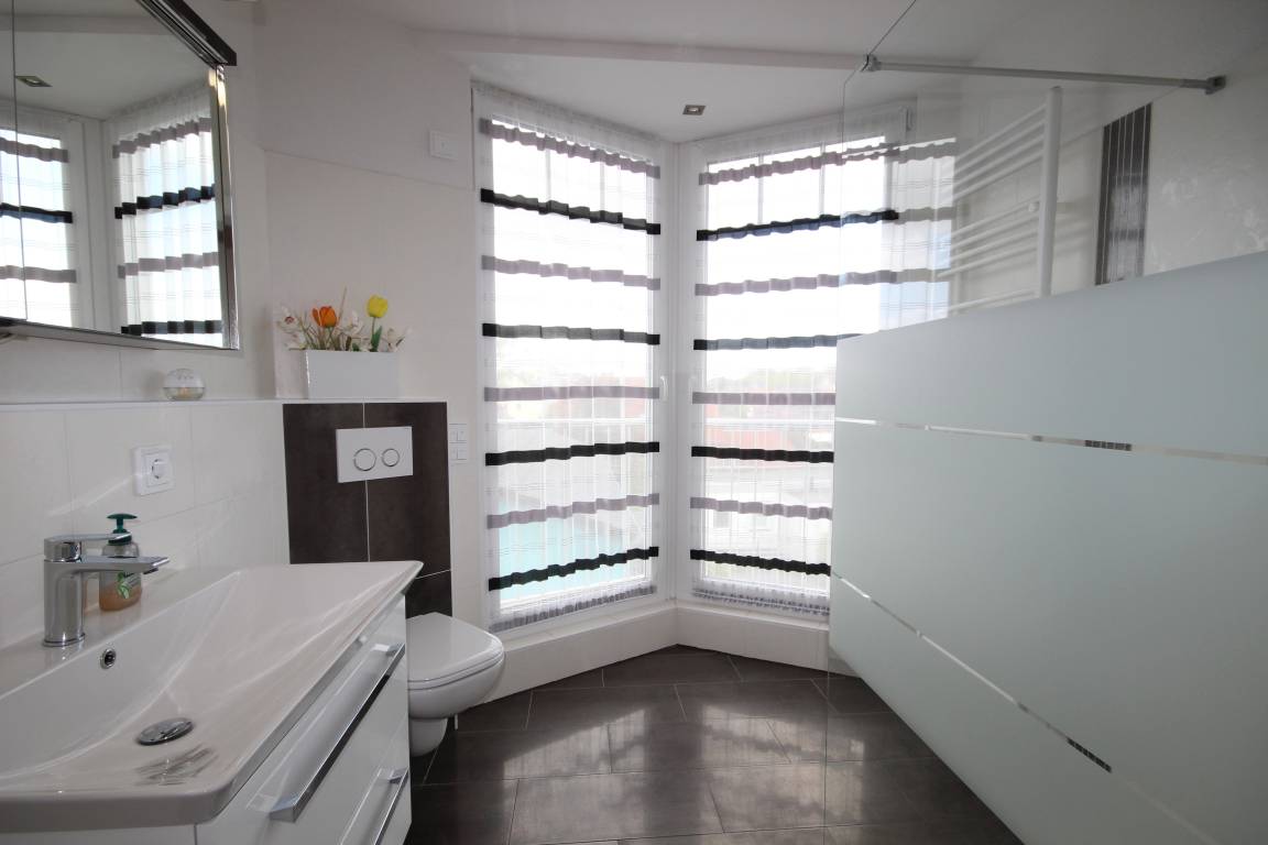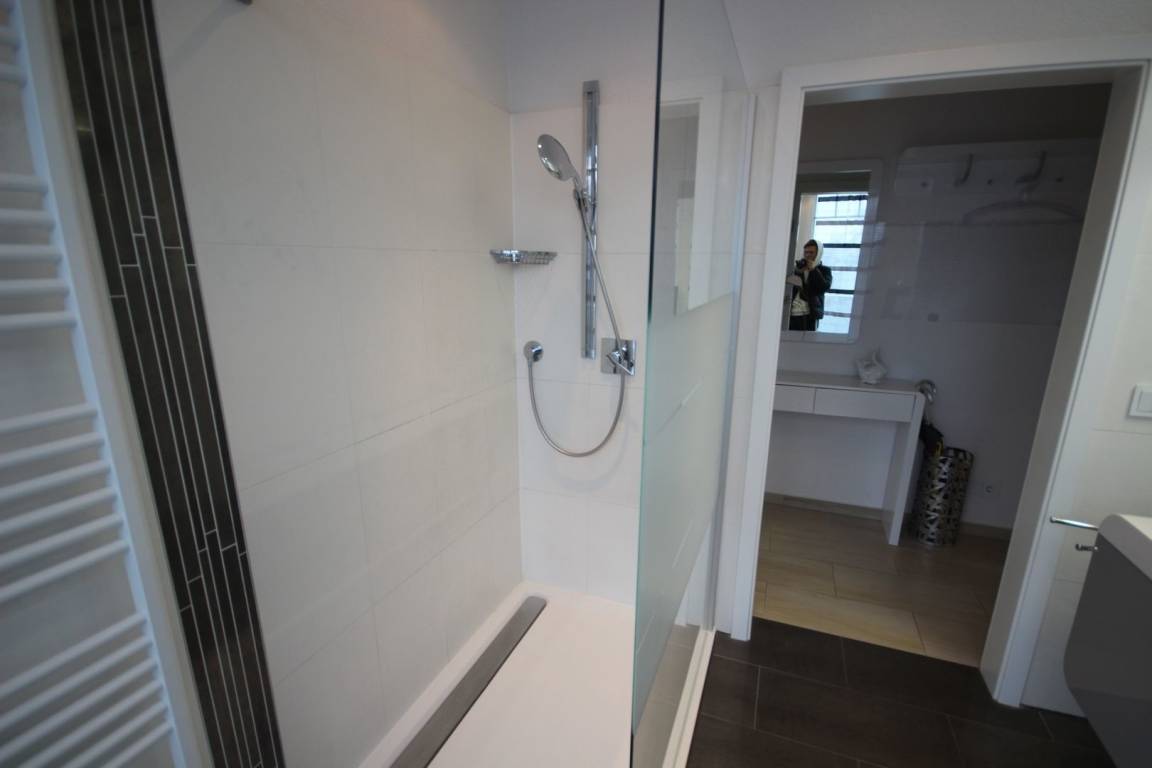 Im hellen und sehr modernen Bad befindet sich eine große ebenerdige Dusche mit Glasabtrennung und Fußbodenheizung.