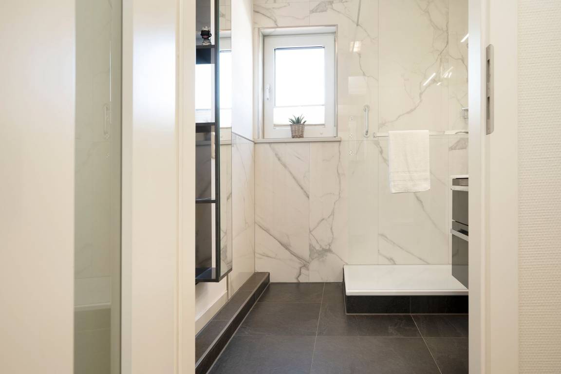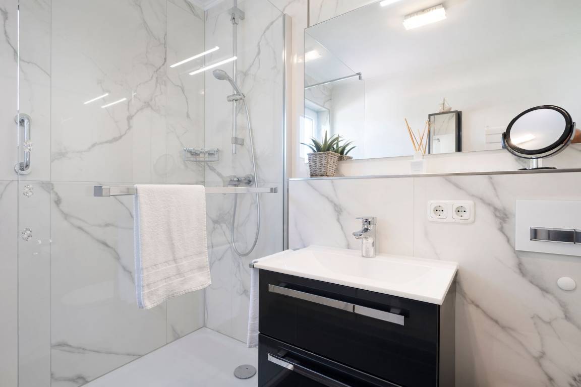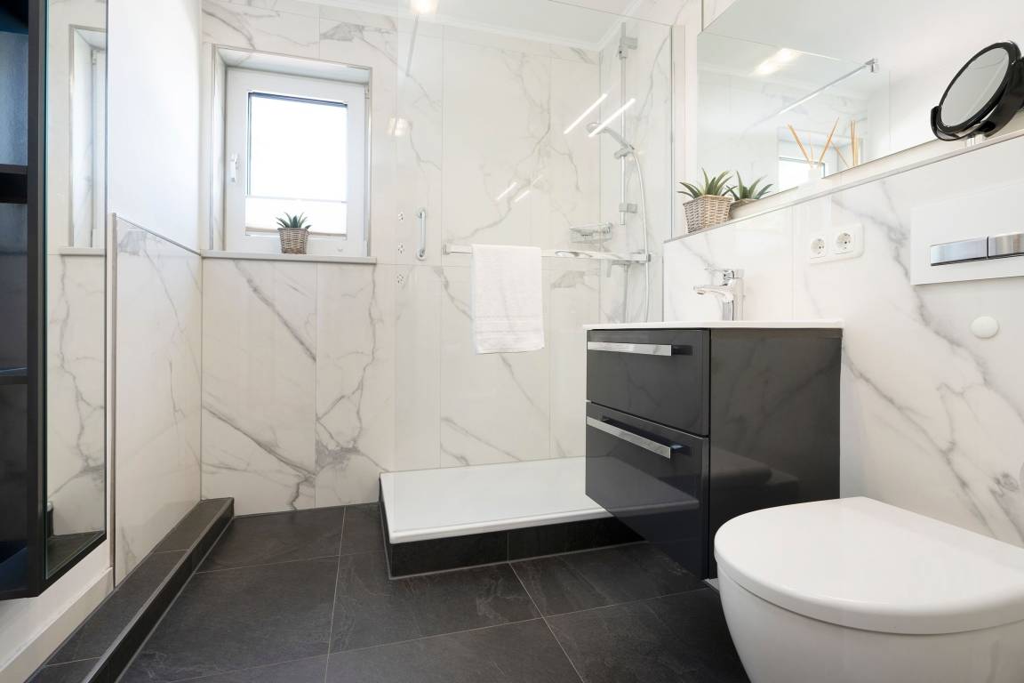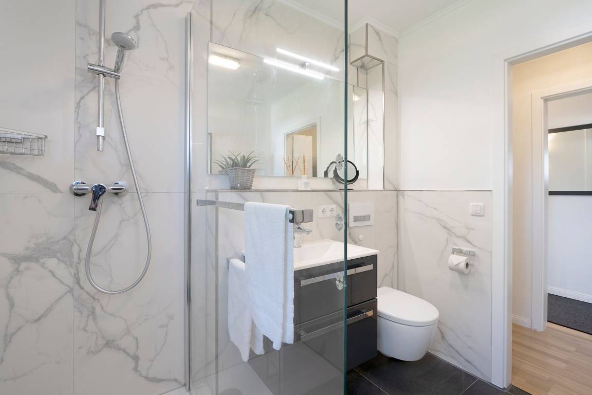 Das modern und ansprechend eingerichtete Wohnzimmer mit einem Essplatz für 2 Personen am Fenster und einer bequemen Eckcouch lädt zum Verweilen ein. Das Schlafzimmer ist mit einem Doppelbett (2x 80x200cm) ausgestattet. Der Fußboden der Wohnung ist mit Parkett ausgelegt. Das exklusive hochwertige Badezimmer in Marmoroptik ist mit einer Walk in Dusche, einem Waschtisch, einem Kosmetikspiegel und Fön und einem Handtuchheizkörper ausgestattet.