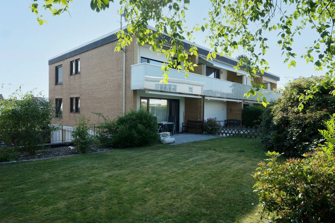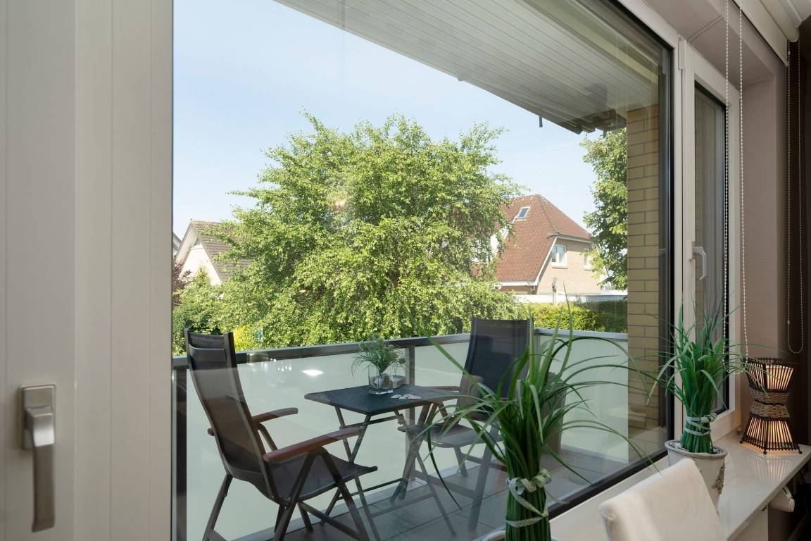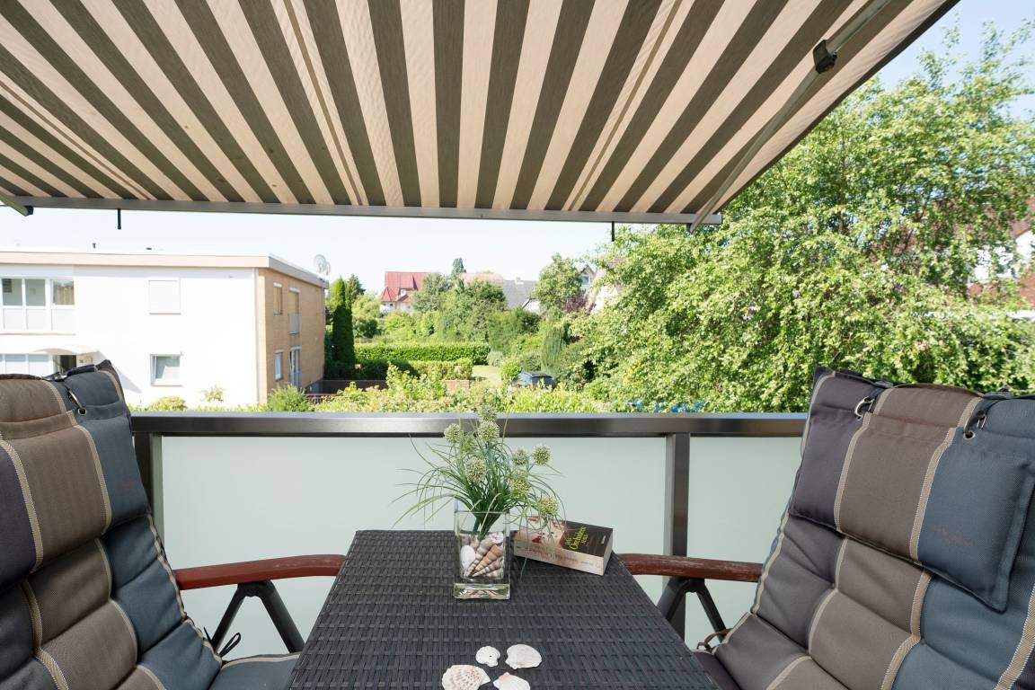 Vom Balkon aus haben Sie einen herrlichen Blick in den schönen Garten. Hier können Sie bis in die Abendstunden hinein auf den Balkonmöbeln die Sonne genießen. Der Balkon ist mit einer Markise und Aussenjalousien ausgestattet.