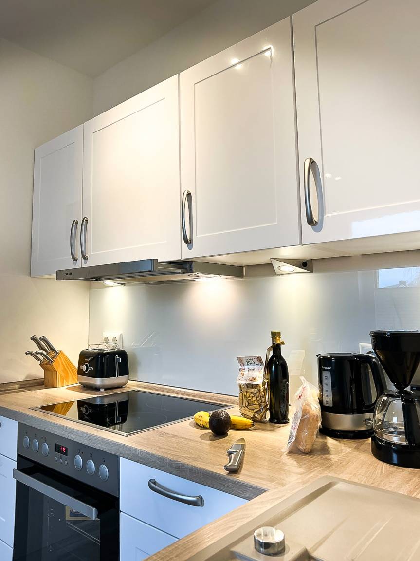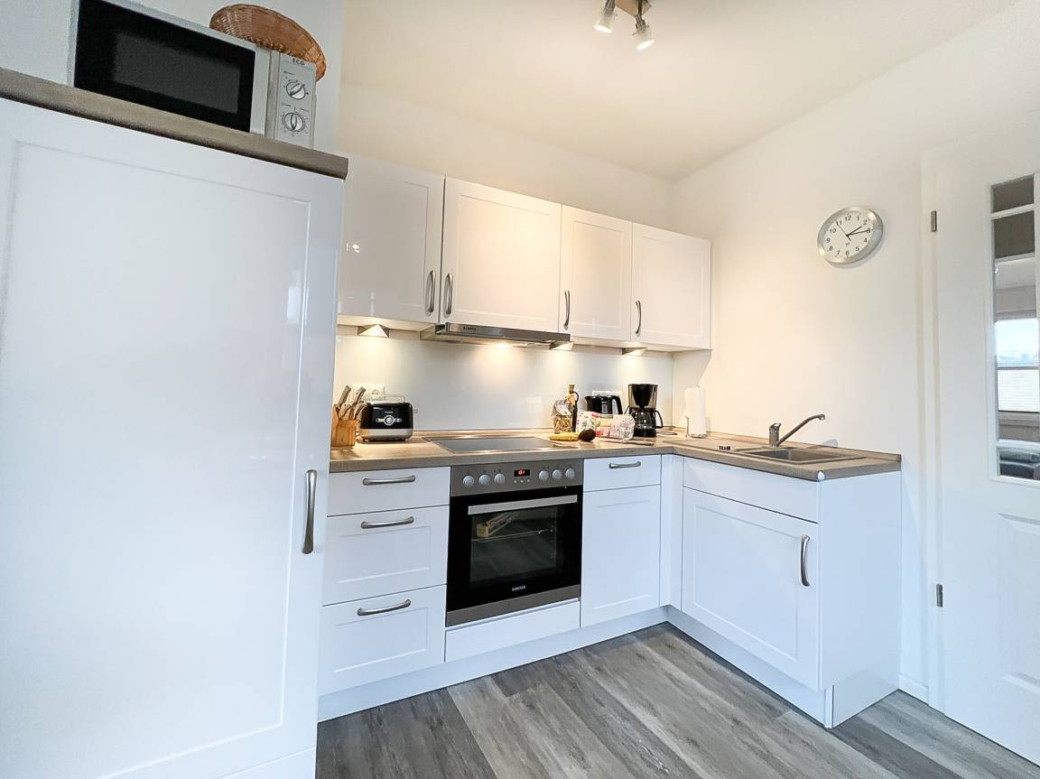 Die schöne 3-Zimmerwohnung für 2-4 Personen mit eigenem Eingang befindet sich im Erdgeschoss und verfügt über eine in den Wohn-/Essbereich integrierte gut ausgestattete Komfort-Küche (Cerankochfeld, Backofen, Mikrowelle, Spülmaschine, Kühlschrank mit Gefrierfach etc.).