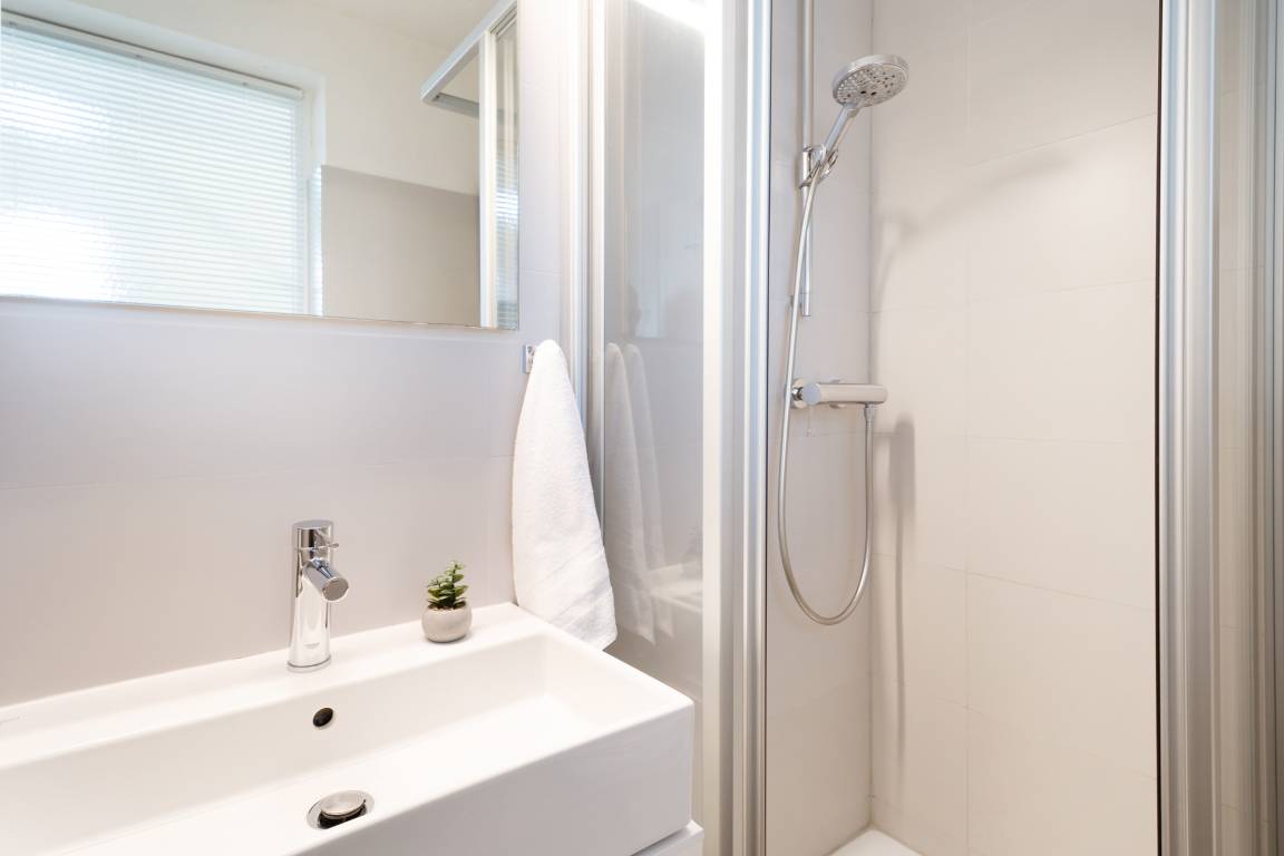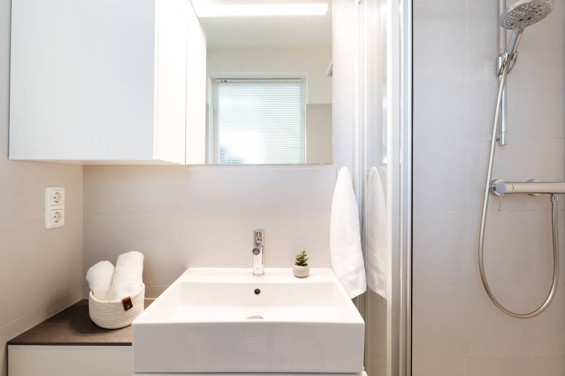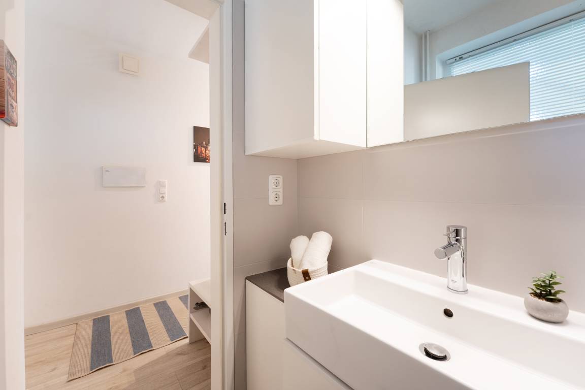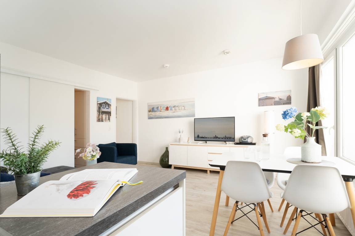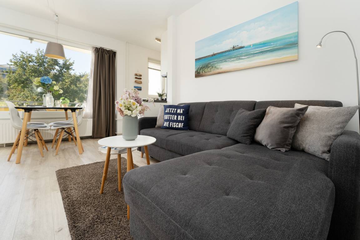 Diese freundliche Wohnung im 1. Stock empfängt Sie mit einem einladenden Wohnbereich, der mit einem gemütlichen Sofa, Flachbild-TV mit DVD-Player, CD-Player und Radio ausgestattet ist – ideal für entspannte Abende nach einem Strandtag. Der Zugang zum möblierten Balkon bietet Ihnen die Möglichkeit, frische Ostseeluft zu genießen und Ihre Mahlzeiten unter freiem Himmel einzunehmen. Die offene Küchenzeile ist funktional ausgestattet mit Induktionskochfeld, Backofen, Geschirrspüler, Kühlschrank mit Gefrierfach sowie Kaffeemaschine (Senseo), Toaster und einen Wasserkocher. Im angrenzenden Essbereich finden alle Gäste bequem Platz. Im ersten Schlafzimmer befindet sich ein Doppelbett und ein Kleiderschrank. Das zweite Zimmer ist mit einem Etagenbett ausgestattet und bietet zwei weitere Schlafmöglichkeiten. Das moderne Bad verfügt über eine Dusche sowie ein WC.