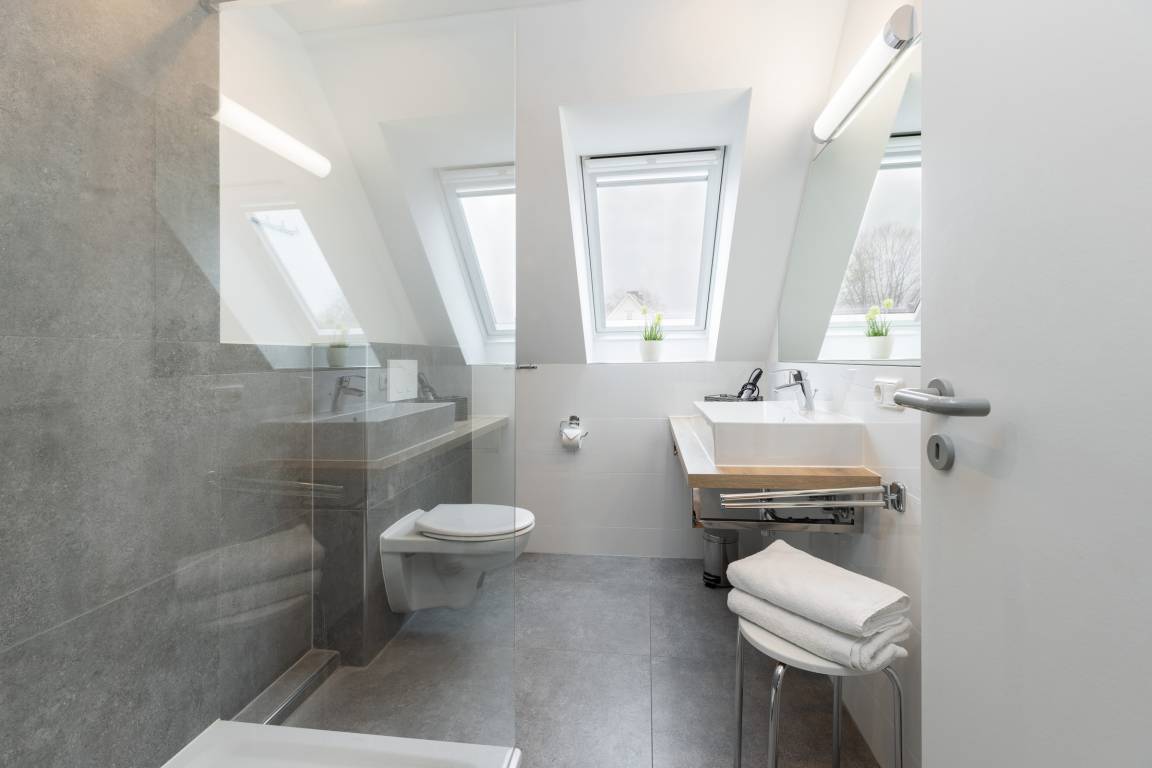 Die drei Schlafräume sind ruhig zur Nordseite gelegen. Das Elternschlafzimmer ist mit einem Boxspringbett (je 90 x 200 cm) und 4-türigem Kleiderschrank eingerichtet. Der zweite Schlafraum hat ein Doppel-Boxspringbett (160 x 200 cm). Im dritten Zimmer sind zwei Boxspring-Einzelbetten (je 90 x 200 cm), jeweils mit einem Kleiderschrank von 100 cm.