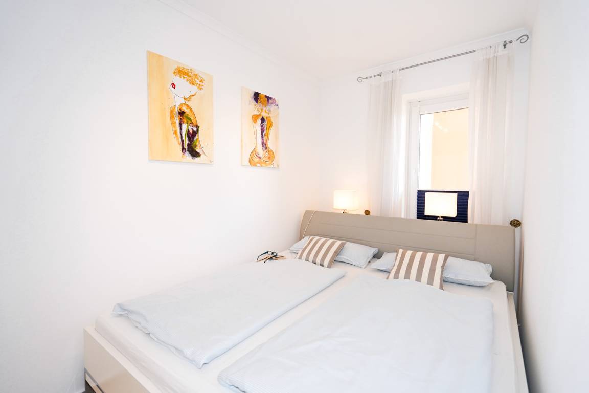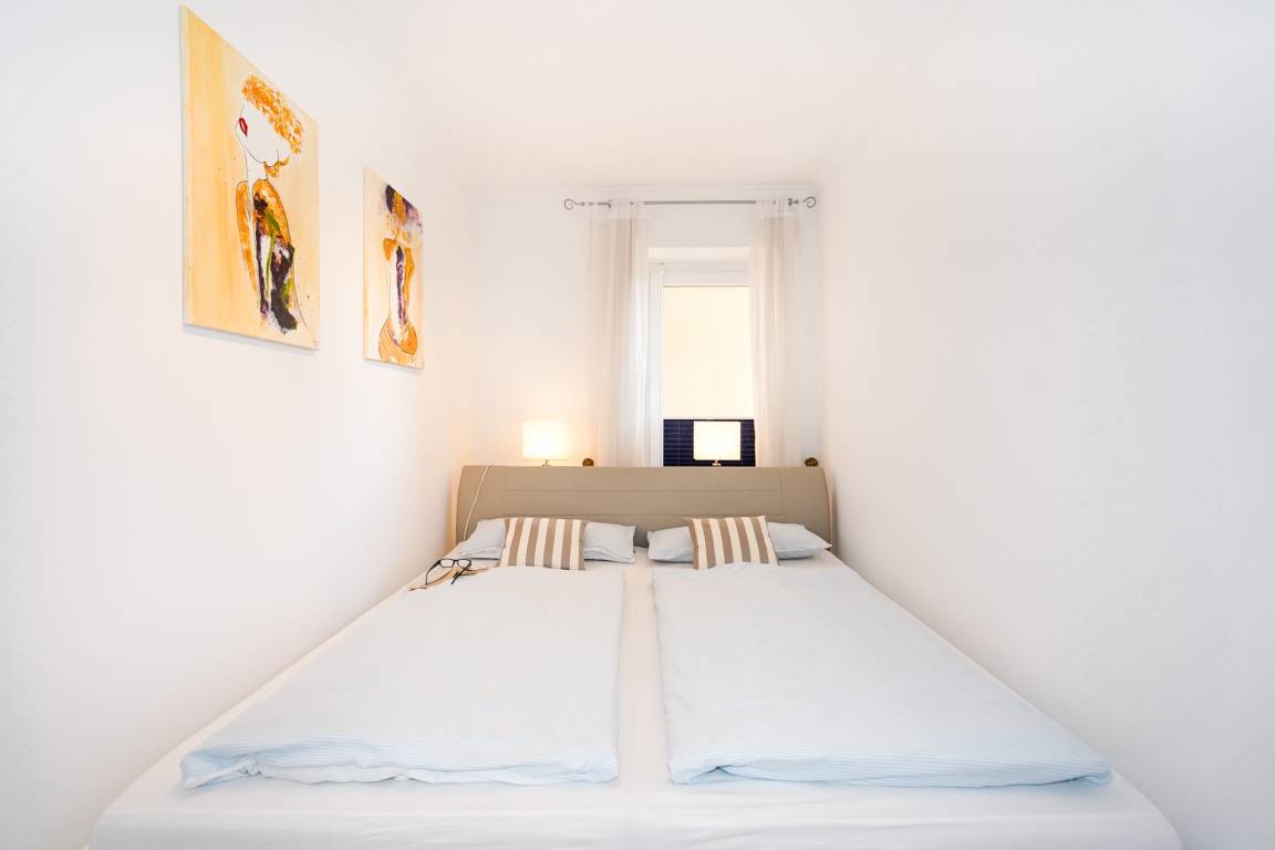 Das Schlafzimmer ist mit einem bequemen Doppelbett (2x90x200) und einem Kleiderschrank ausgestattet. Die Fenster können, wie auch die Fenster im Wohnzimmer, mit Hilfe einer elektrischen Rolllade vollständig verdunkelt werden.