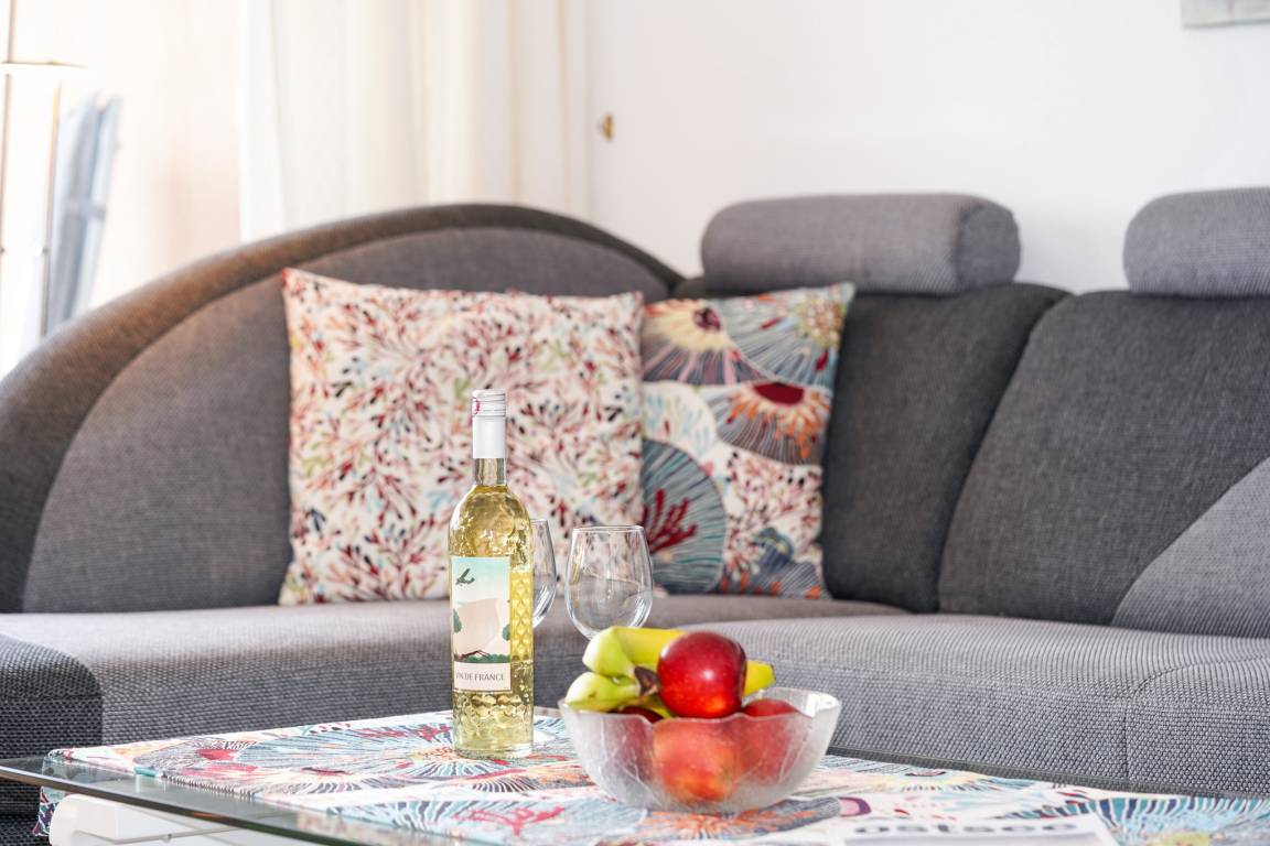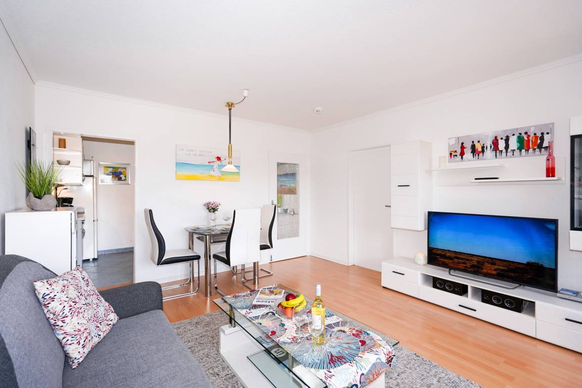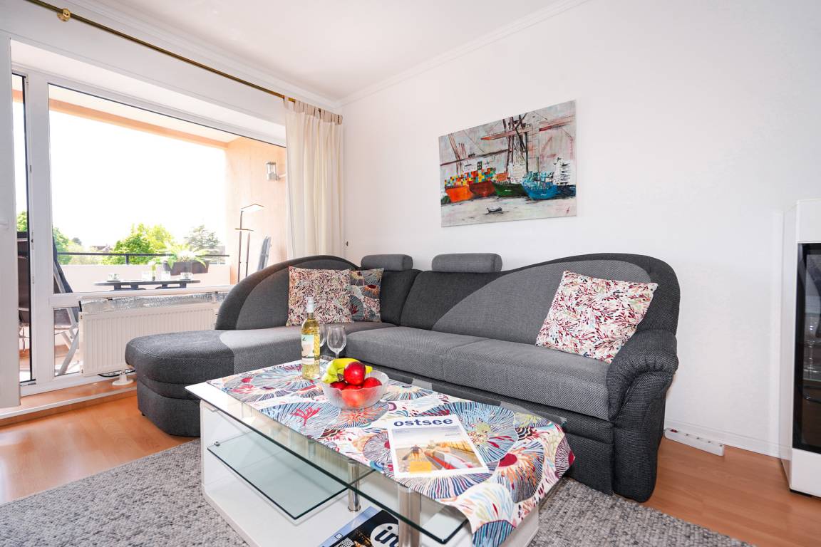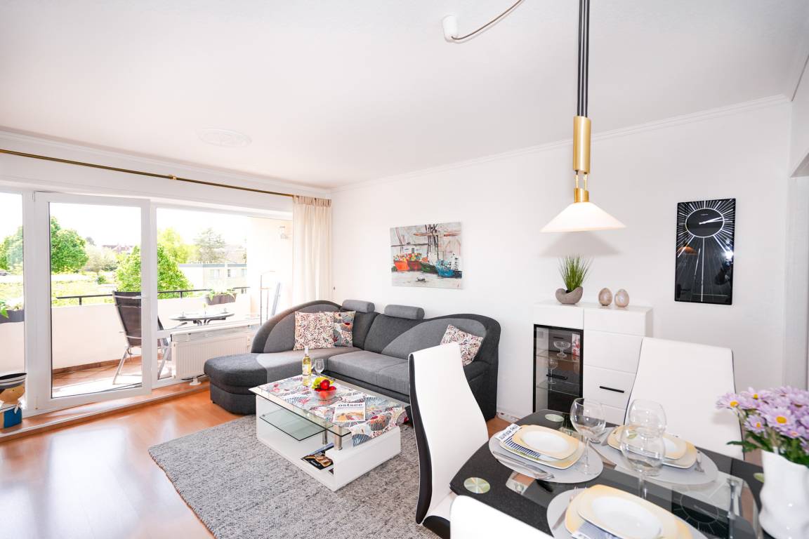 Diese gemütliche 2-Zimmer-Ferienwohnung verfügt über ein helles Wohnzimmer mit einem großen bequemen Schlafsofa (140x200), einem Esstisch für drei Personen und einem Fernseher. Kostenloses W-LAN ist hier selbstverständlich auch vorhanden. Angrenzend erreichen Sie den überdachten Balkon, auf dem Sie von mittags bis abends die Sonne genießen können.