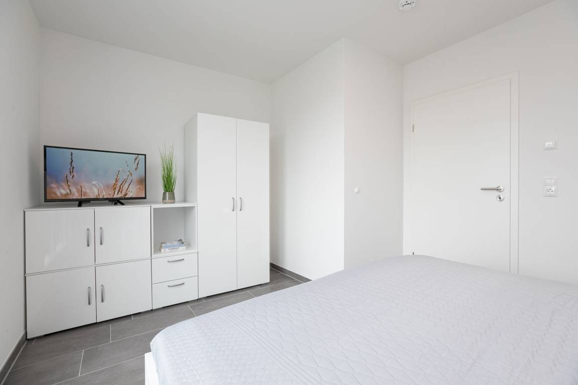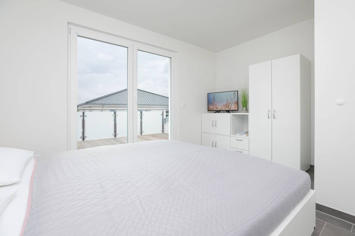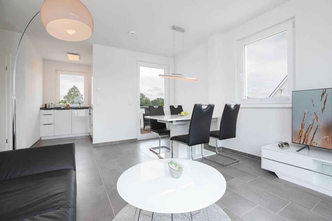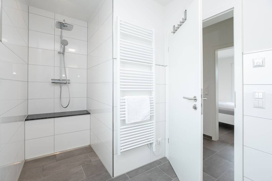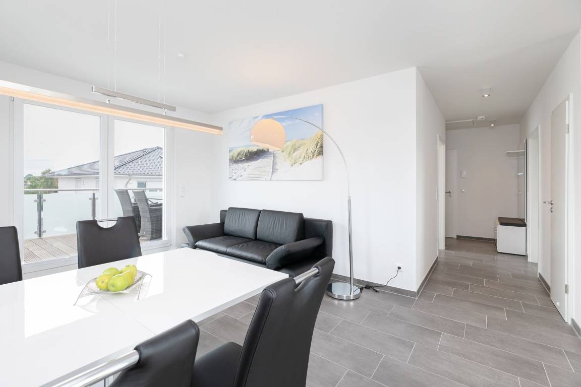 Im gemütlichen Wohnbereich können Sie nicht nur unterhaltsame Stunden, zum Beispiel vor dem Fernseher verbringen, sondern sich auch ein gemütliches Nachtlager auf dem Schlafsofa (ca. 150x200 cm Liegefläche) einrichten. Die separate Küche ist modern und komfortabel ausgestattet und punktet mit einem 4 Feld-Induktionsherd und Backofen, Mikrowelle, Kühlschrank mit Gefrierfach, Spülmaschine, Kaffeemaschine, Wasserkocher und Toaster. Im großen Doppelbett (2x 90x200 cm) im Schlafzimmer können Sie sich in die Kissen fallen lassen, ein Kleiderschrank sorgt für ausreichend Stauraum für Ihre Garderobe. Auch hier gibt es ein TV-Gerät. Keine Wünsche offen bleiben auch im Tageslichtbad mit bodentiefer Dusche, Fußboden- und Handtuchheizung und Fön. Balkon und Dachterrasse: In dieser Wohnung haben Sie die doppelte Möglichkeit die gute Ostseeluft zu schnuppern und den Ausblick zu genießen. Im großen Strandkorb legen Sie entspannt die Beine hoch und können in Ihrem Lieblingsbuch schmökern. Ein kostenloser WLAN Anschluss ist verfügbar.