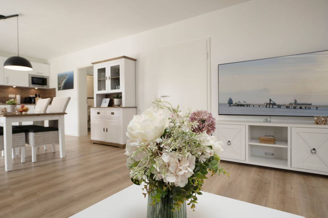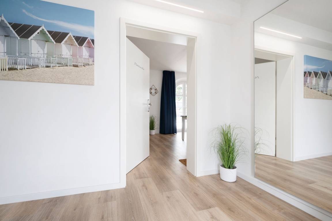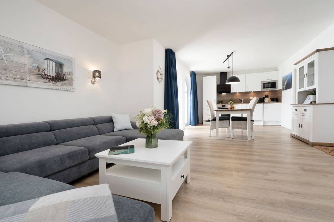 Die Ferienwohnung Meeresrauschen im Haus Schönes Leben empfängt Sie mit einem modern eingerichteten hellen Wohnbereich. In den Wohnbereich integriert ist die offene Küchenzeile, die mit ihrer sehr guten Ausstattung, inklusive Nespresso-Kaffeemaschine, keine Wünsche offen lässt. Lassen Sie sich nach einem guten Abendessen auf die gemütliche Couch fallen, lauschen Sie der wohnungseigenen WLAN-Sonos-Musikbox oder genießen Sie einen Blockbuster auf dem mit dem Streaming-Dienst Netflix ausgestatteten TV. Ihr Feriendomizil kann mit zwei voll abdunkelbaren Schlafzimmern trumpfen, die jeweils über ein eigenes Bad en suite verfügen. Ein bequemes Boxspringbett (2x 180x200cm) im ersten Schlafzimmer sowie zwei Einzelbetten (90x200cm) im zweiten Schlafzimmer sorgen für einen geruhsamen Schlaf. Die Lieblingsserie kann dabei auch vom Bett aus genossen werden, denn beide Schlafzimmer bestechen mit einem eigenen TV. Eines der beiden Dusch-Bäder bietet mit einem unterfahrbaren Waschbecken, einem WC-Haltegriff sowie einem Duschhocker barrierearme Bedingungen. Kalte Füße vermeiden Sie mit der Fußbodenheizung, die in der gesamten Wohnung verlegt ist. Die Highlight Ihres Feriendomizils sind die 58 m² große, nach Südwesten ausgerichtete Terrasse, auf der Sie die letzten Sonnenstrahlen des Tages genießen können sowie die gemeinschaftlich nutzbare Gartensauna.