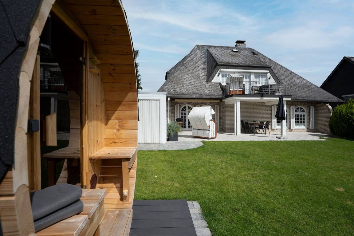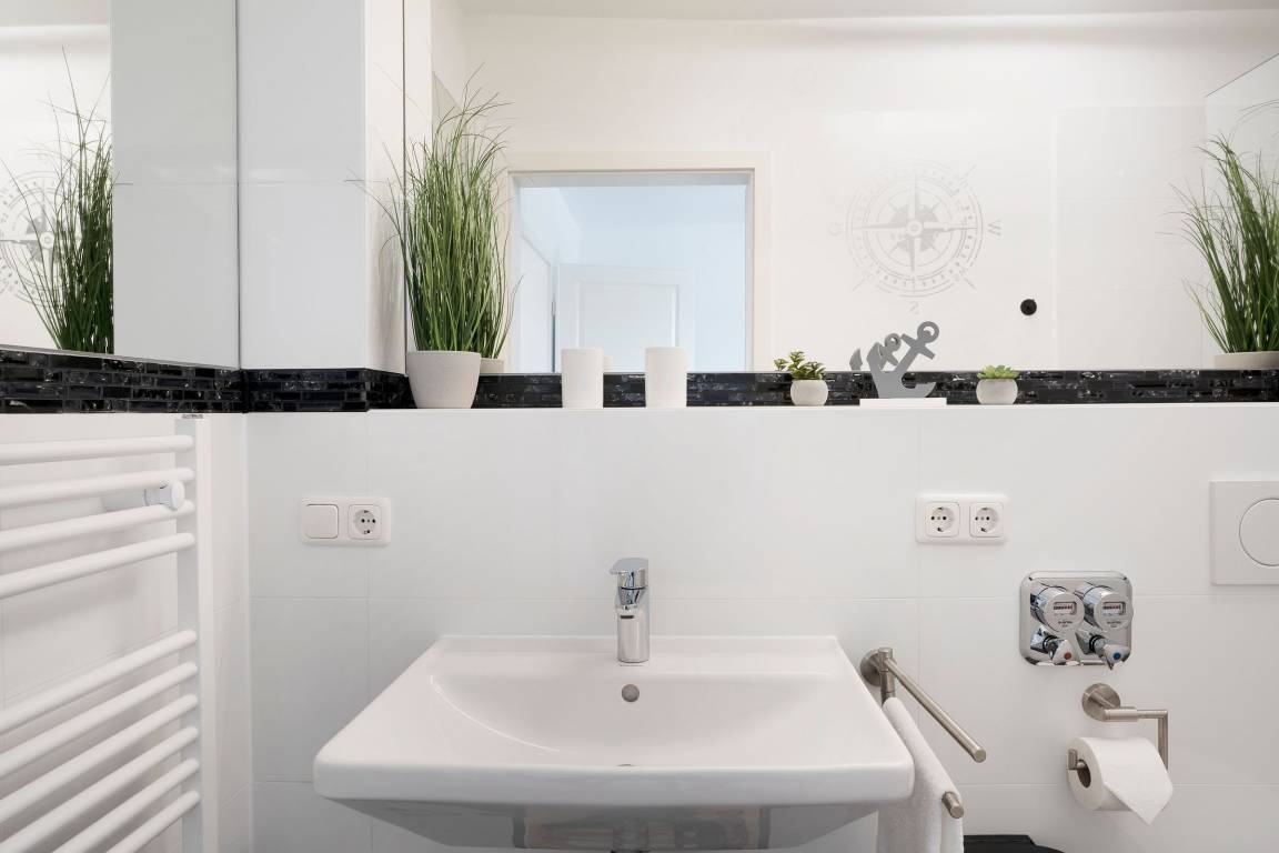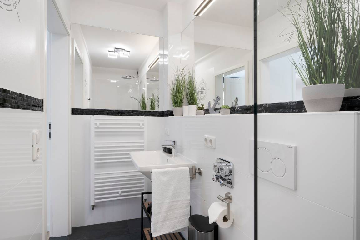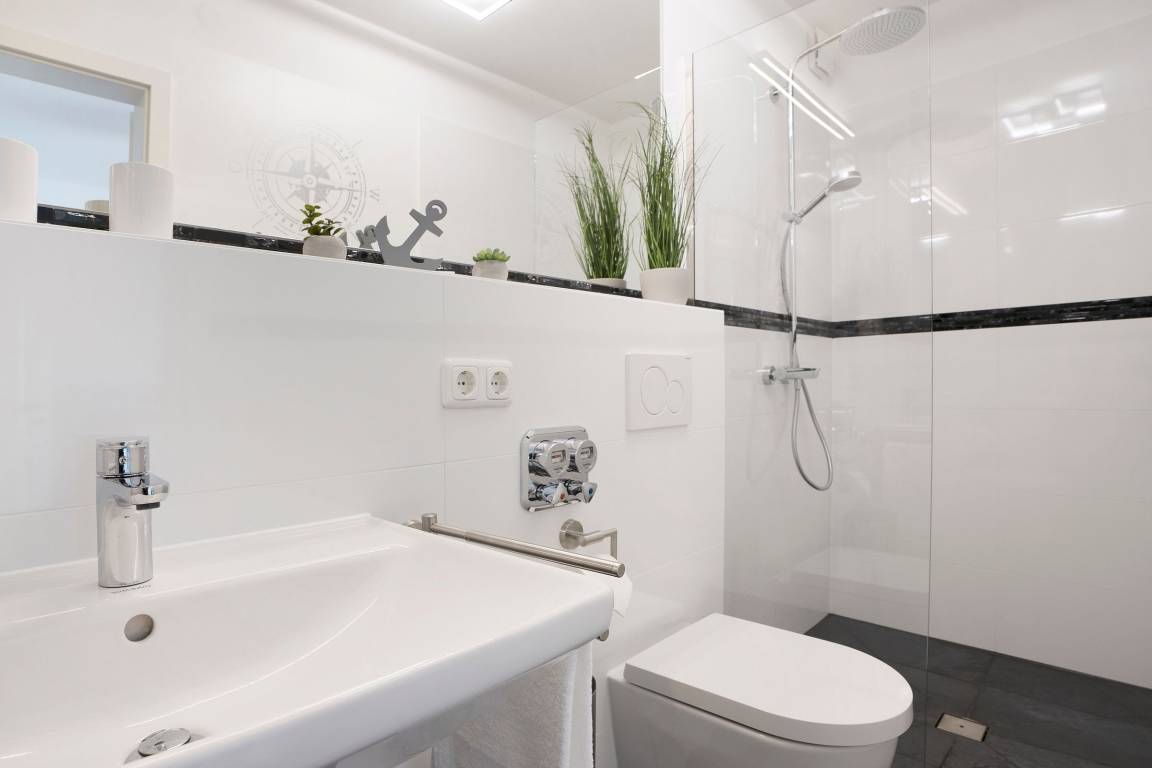 Die Ferienwohnung Meeresrauschen im Haus Schönes Leben empfängt Sie mit einem modern eingerichteten hellen Wohnbereich. In den Wohnbereich integriert ist die offene Küchenzeile, die mit ihrer sehr guten Ausstattung, inklusive Nespresso-Kaffeemaschine, keine Wünsche offen lässt. Lassen Sie sich nach einem guten Abendessen auf die gemütliche Couch fallen, lauschen Sie der wohnungseigenen WLAN-Sonos-Musikbox oder genießen Sie einen Blockbuster auf dem mit dem Streaming-Dienst Netflix ausgestatteten TV. Ihr Feriendomizil kann mit zwei voll abdunkelbaren Schlafzimmern trumpfen, die jeweils über ein eigenes Bad en suite verfügen. Ein bequemes Boxspringbett (2x 180x200cm) im ersten Schlafzimmer sowie zwei Einzelbetten (90x200cm) im zweiten Schlafzimmer sorgen für einen geruhsamen Schlaf. Die Lieblingsserie kann dabei auch vom Bett aus genossen werden, denn beide Schlafzimmer bestechen mit einem eigenen TV. Eines der beiden Dusch-Bäder bietet mit einem unterfahrbaren Waschbecken, einem WC-Haltegriff sowie einem Duschhocker barrierearme Bedingungen. Kalte Füße vermeiden Sie mit der Fußbodenheizung, die in der gesamten Wohnung verlegt ist. Die Highlight Ihres Feriendomizils sind die 58 m² große, nach Südwesten ausgerichtete Terrasse, auf der Sie die letzten Sonnenstrahlen des Tages genießen können sowie die gemeinschaftlich nutzbare Gartensauna.