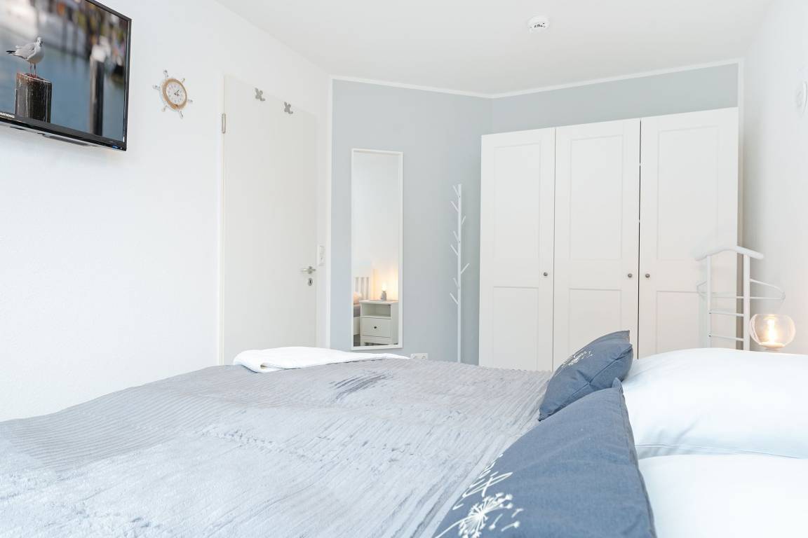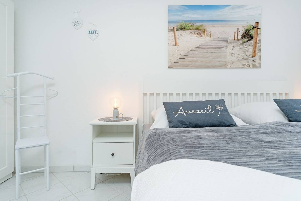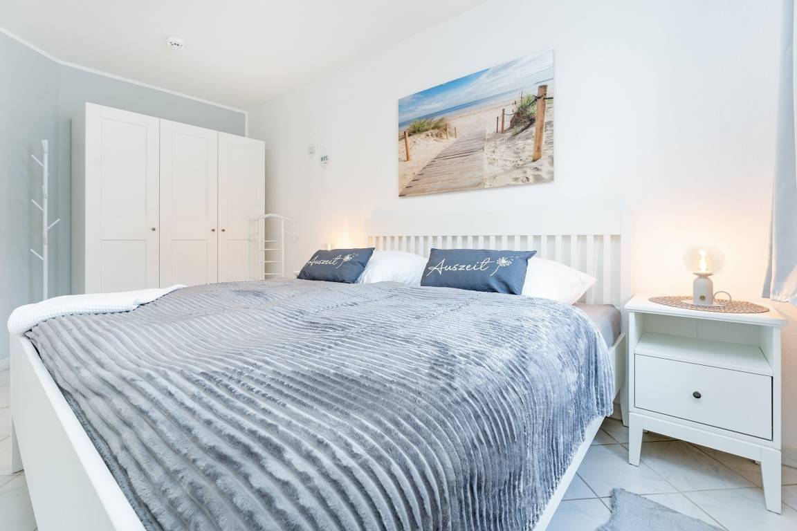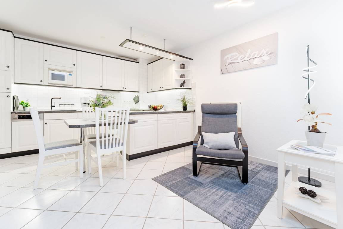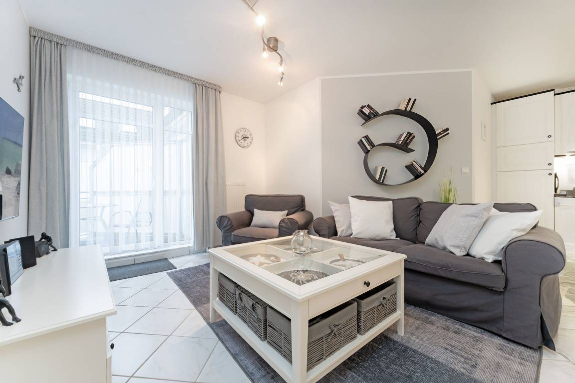Diese stilvolle Ferienwohnung bietet Ihnen modernen Komfort und eine hervorragende Lage nahe Grömitz' feinsandigem Strand. Der Kurpark, Einkaufsmöglichkeiten und Restaurants befinden sich in direkter Nachbarschaft. Die Wohnung ist bequem über einen Aufzug erreichbar. Der helle Wohnbereich ist mit einem gemütlichen Sofa, TV und HiFi-Anlage ausgestattet und lädt zu entspannten Stunden ein. Vom Wohnbereich aus gelangen Sie auf den Balkon, der nach Südwesten ausgerichtet ist und sich ideal für ein Frühstück in der Morgensonne oder einen entspannten Abend eignet. Die offene Küche ist gut ausgestattet und verfügt über ein Cerankochfeld, Backofen, Kühlschrank mit Gefrierfach, Spülmaschine, Mikrowelle, Kaffeemaschine, Eierkocher, Toaster und Wasserkocher. Hier können Sie sich kulinarisch verwöhnen und Ihre Lieblingsgerichte selbst zubereiten. Der angrenzende Essbereich bietet Platz für Mahlzeiten in gemütlicher Runde. Das Schlafzimmer ist mit einem komfortablen Doppelbett (2x 90x200 cm) ausgestattet und sorgt für erholsame Nächte. Großzügige Staumöglichkeiten runden die Ausstattung ab. Das moderne Badezimmer verfügt über eine bodengleiche Dusche, ein Waschbecken, einen Haartrockner, Kosmetikspiegel und ein WC.