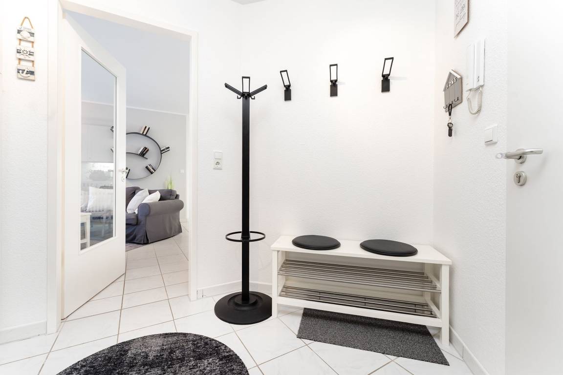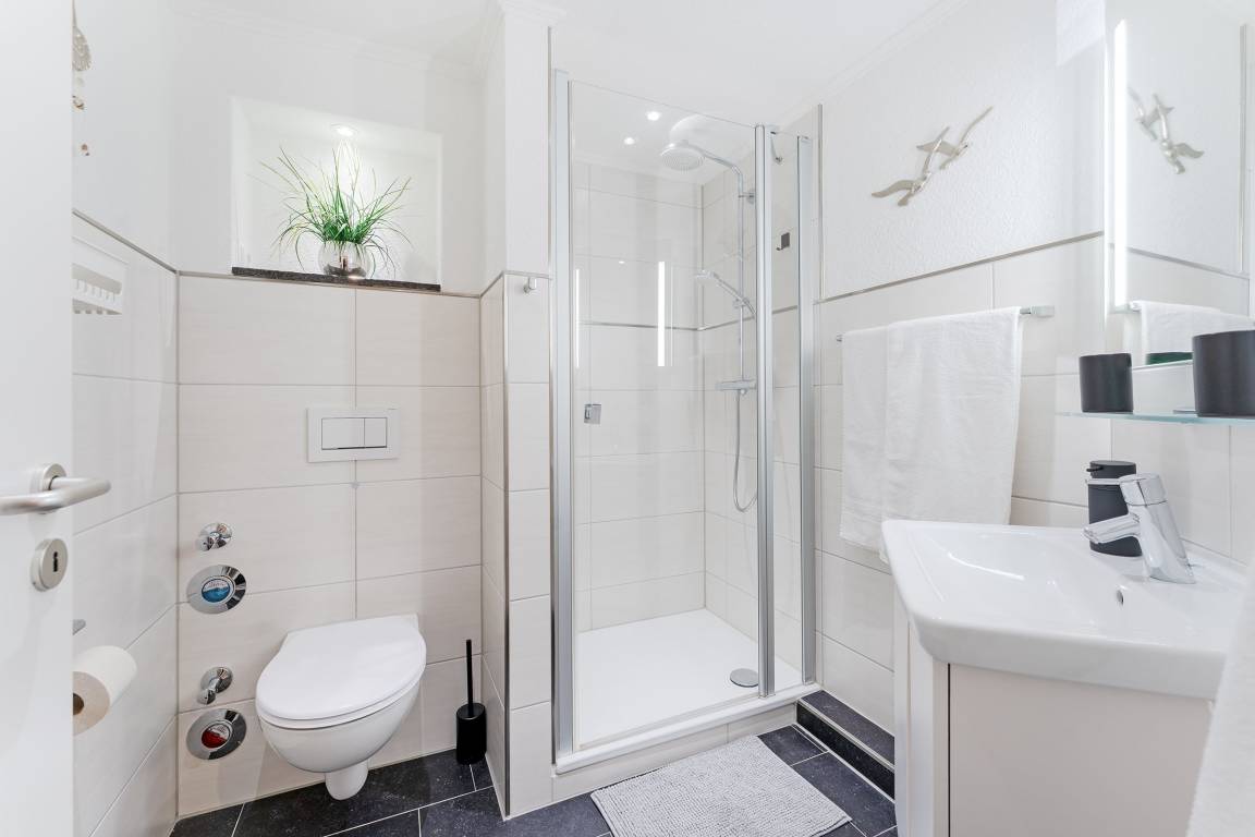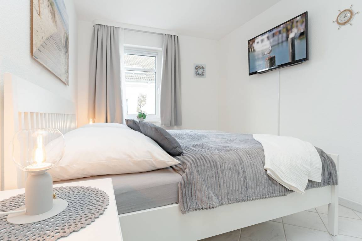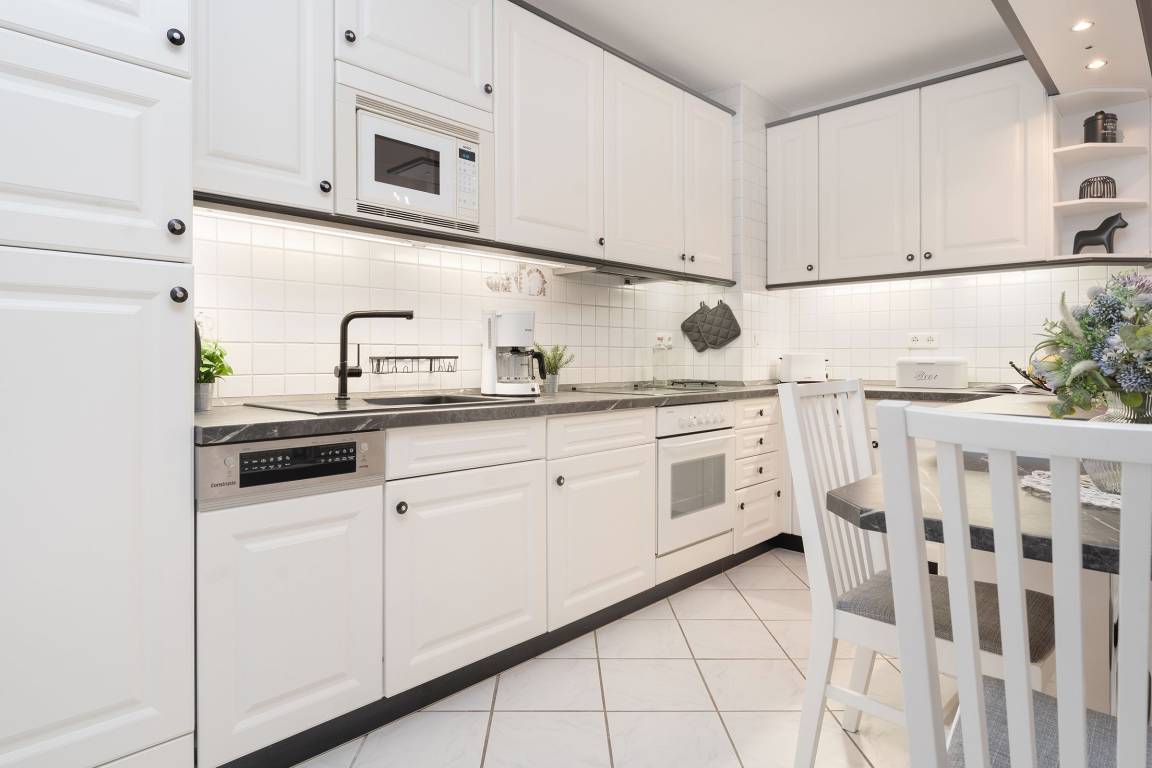 Diese stilvolle Ferienwohnung bietet Ihnen modernen Komfort und eine hervorragende Lage nahe Grömitz' feinsandigem Strand. Der Kurpark, Einkaufsmöglichkeiten und Restaurants befinden sich in direkter Nachbarschaft. Die Wohnung ist bequem über einen Aufzug erreichbar. Der helle Wohnbereich ist mit einem gemütlichen Sofa, TV und HiFi-Anlage ausgestattet und lädt zu entspannten Stunden ein. Vom Wohnbereich aus gelangen Sie auf den Balkon, der nach Südwesten ausgerichtet ist und sich ideal für ein Frühstück in der Morgensonne oder einen entspannten Abend eignet. Die offene Küche ist gut ausgestattet und verfügt über ein Cerankochfeld, Backofen, Kühlschrank mit Gefrierfach, Spülmaschine, Mikrowelle, Kaffeemaschine, Eierkocher, Toaster und Wasserkocher. Hier können Sie sich kulinarisch verwöhnen und Ihre Lieblingsgerichte selbst zubereiten. Der angrenzende Essbereich bietet Platz für Mahlzeiten in gemütlicher Runde. Das Schlafzimmer ist mit einem komfortablen Doppelbett (2x 90x200 cm) ausgestattet und sorgt für erholsame Nächte. Großzügige Staumöglichkeiten runden die Ausstattung ab. Das moderne Badezimmer verfügt über eine bodengleiche Dusche, ein Waschbecken, einen Haartrockner, Kosmetikspiegel und ein WC.