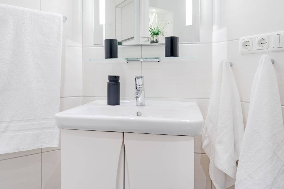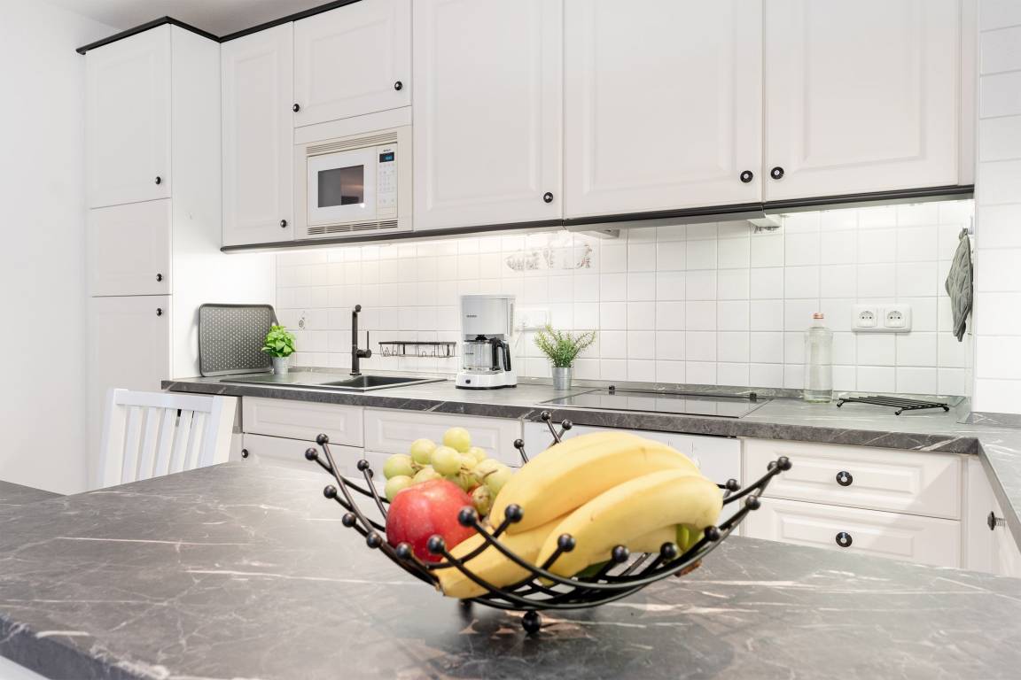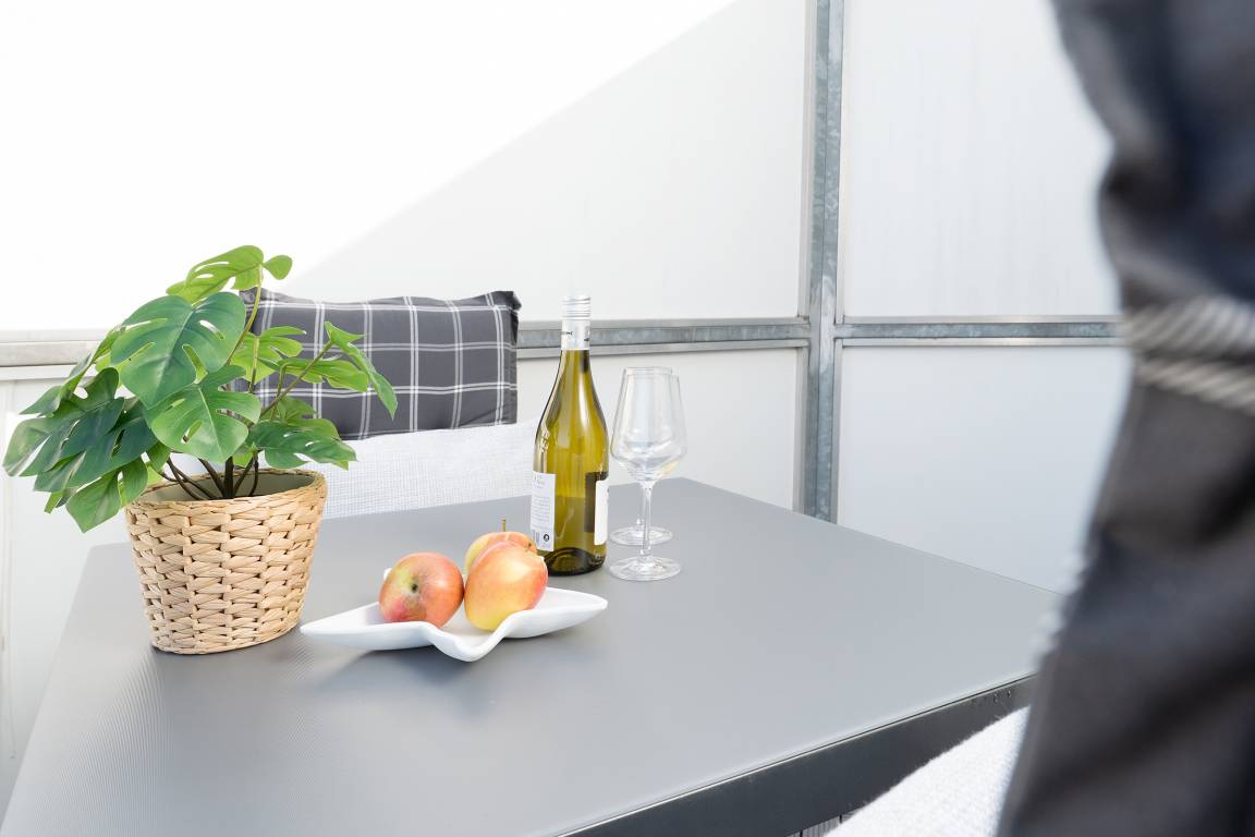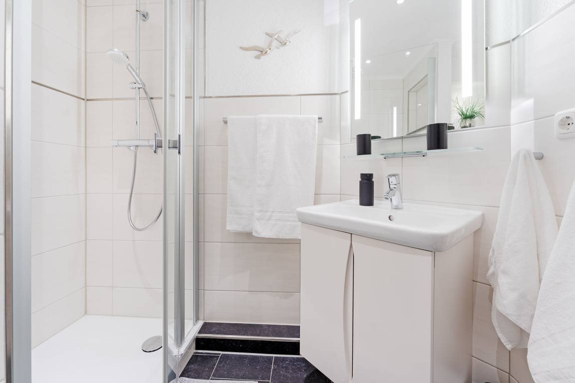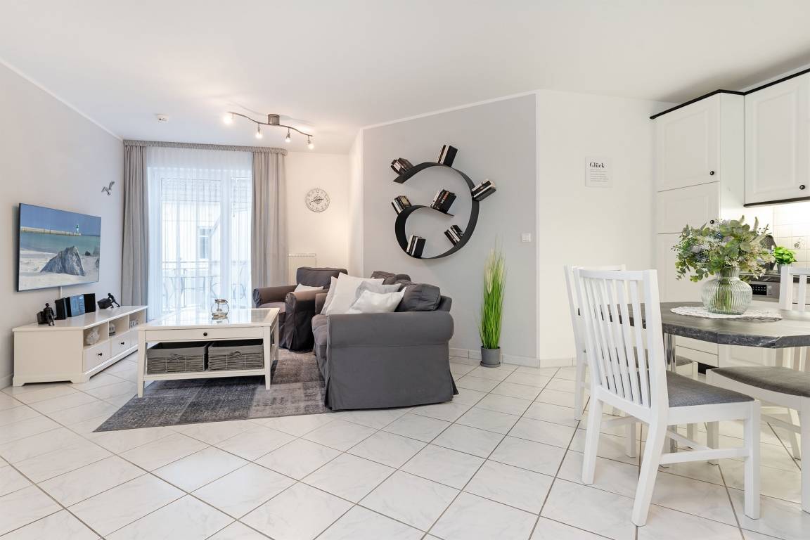 Diese stilvolle Ferienwohnung bietet Ihnen modernen Komfort und eine hervorragende Lage nahe Grömitz' feinsandigem Strand. Der Kurpark, Einkaufsmöglichkeiten und Restaurants befinden sich in direkter Nachbarschaft. Die Wohnung ist bequem über einen Aufzug erreichbar. Der helle Wohnbereich ist mit einem gemütlichen Sofa, TV und HiFi-Anlage ausgestattet und lädt zu entspannten Stunden ein. Vom Wohnbereich aus gelangen Sie auf den Balkon, der nach Südwesten ausgerichtet ist und sich ideal für ein Frühstück in der Morgensonne oder einen entspannten Abend eignet. Die offene Küche ist gut ausgestattet und verfügt über ein Cerankochfeld, Backofen, Kühlschrank mit Gefrierfach, Spülmaschine, Mikrowelle, Kaffeemaschine, Eierkocher, Toaster und Wasserkocher. Hier können Sie sich kulinarisch verwöhnen und Ihre Lieblingsgerichte selbst zubereiten. Der angrenzende Essbereich bietet Platz für Mahlzeiten in gemütlicher Runde. Das Schlafzimmer ist mit einem komfortablen Doppelbett (2x 90x200 cm) ausgestattet und sorgt für erholsame Nächte. Großzügige Staumöglichkeiten runden die Ausstattung ab. Das moderne Badezimmer verfügt über eine bodengleiche Dusche, ein Waschbecken, einen Haartrockner, Kosmetikspiegel und ein WC.