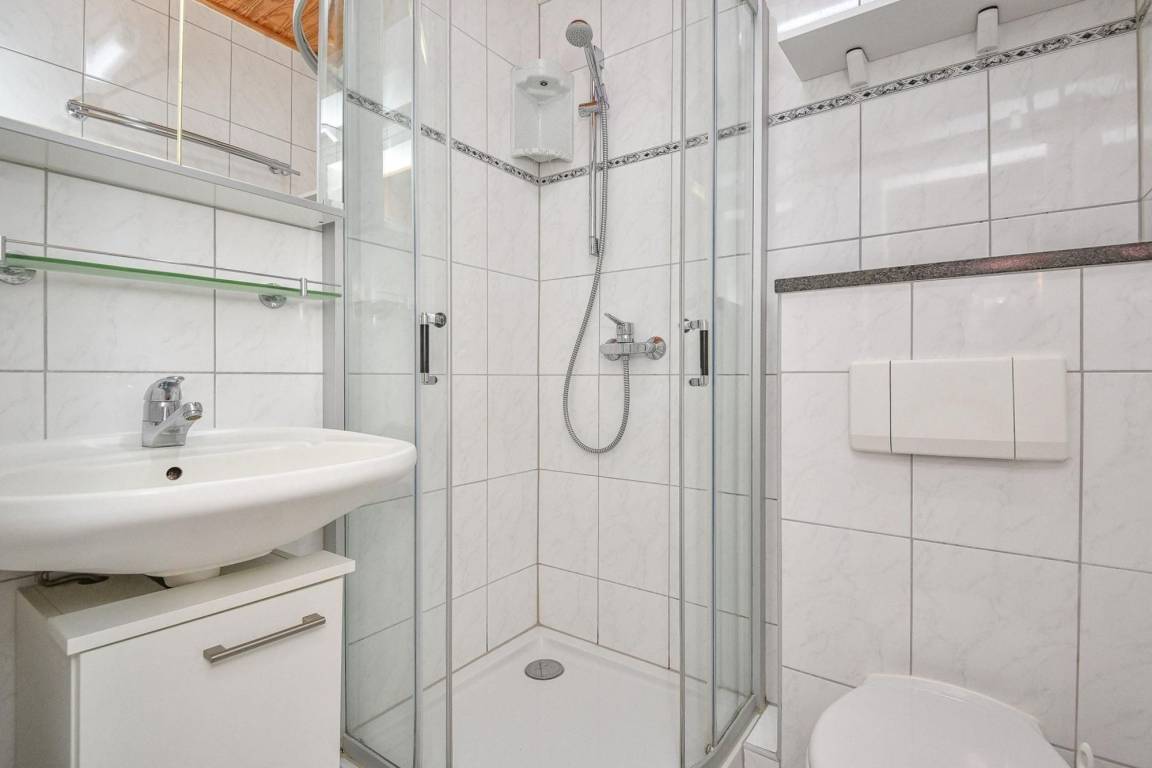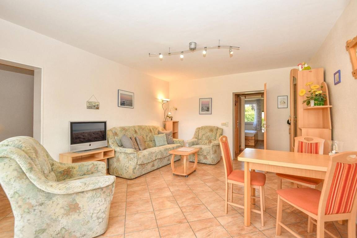 Durch einen kleinen Flur gelangen Sie zum einen in das liebevoll gestaltete Schlafzimmer, ausgestattet mit einem Doppelbett und einem geräumigen Kleiderschrank. Dieses Schlafzimmer (2x 90x200 cm) liegt nach vorne, getrennt durch einen kleinen Vorgarten zur verkehrsberuhigten Straßenseite. Auch das Bad und der Zugang zum Wohnzimmer gehen vom Flur ab. Die gesamte Wohnung ist in einer warmen Naturfarbe gefliest, eine Fußbodenheizung sorgt für wohlige Wärme. Das Duschbad präsentiert sich hell und freundlich, hier lässt es sich bestens in den Tag starten. Das behagliche Wohnzimmer bietet genug Platz für gemütliche Abende mit bis zu vier Personen. Für Ihre Unterhaltung sorgt hier ein Flachbildfernseher, sowie eine Musikanlage. Selbstverständlich ist Ihr Domizil auch mit WLAN ausgestattet.