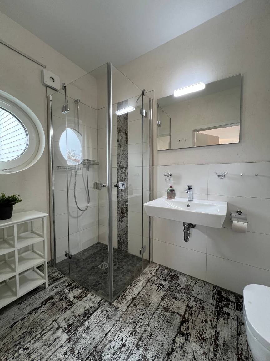 Diese im Erdgeschoss liegende modern-rustikal eingerichtete Wohnung verfügt über einen offenen Wohn- und Essbereich mit einer hochwertigen Wohn/Schlafcouch (Liegefläche 140 x 190 cm). Es stehen Ihnen eine moderne und vollausgestattete Küche sowie zwei separate Schlafzimmer mit jeweils einem Boxspringbett (180cm x 200cm und 160cm x 200cm) und einem Kleiderschrank für Ihre Garderobe zur Verfügung. In einem der Schlafräume finden Sie einen zweiten Flachbildfernseher.