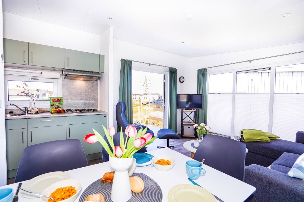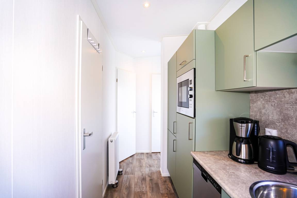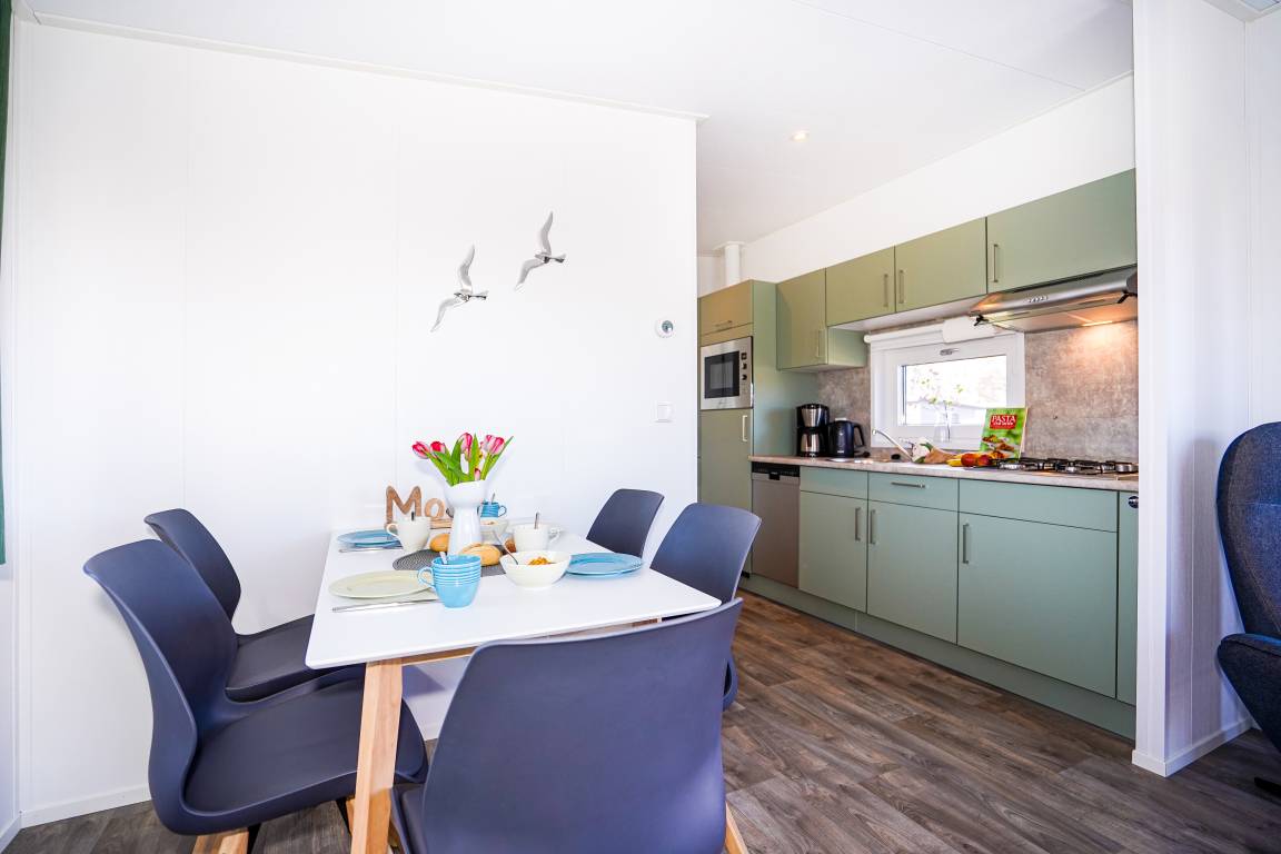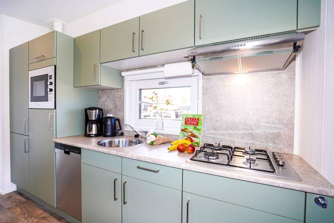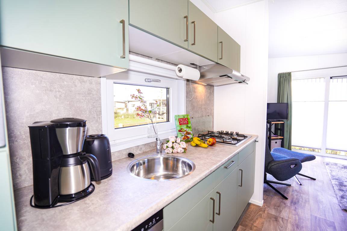 Diese gemütlichen Unterkünfte bieten Platz für bis zu 4 Personen und sind perfekt für einen entspannten Urlaub. Jedes Mobilheim verfügt über eine voll ausgestattete Küche mit Gasherd und Mikrowelle, Kühl- und Gefrierkombination, Geschirrspüler, Kaffeemaschine und Wasserkocher. Ein modernes Badezimmer mit Dusche, WC und Waschtisch sowie zwei einladende Schlafzimmer (ein Doppelbett 2x80x200cm und zwei Einzelbetten 80x200cm) sorgen für Ihren Komfort.