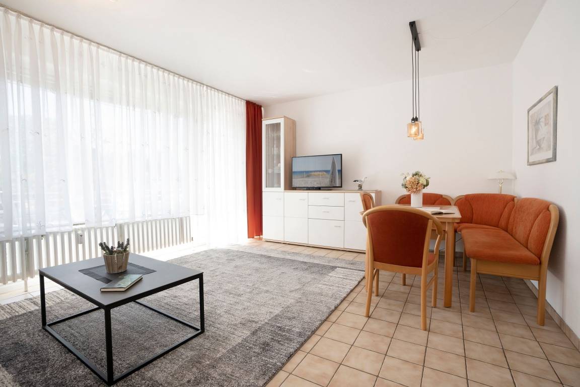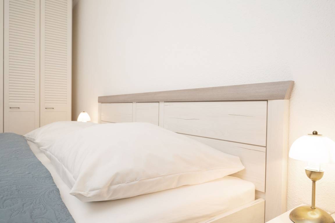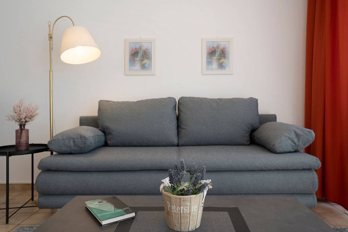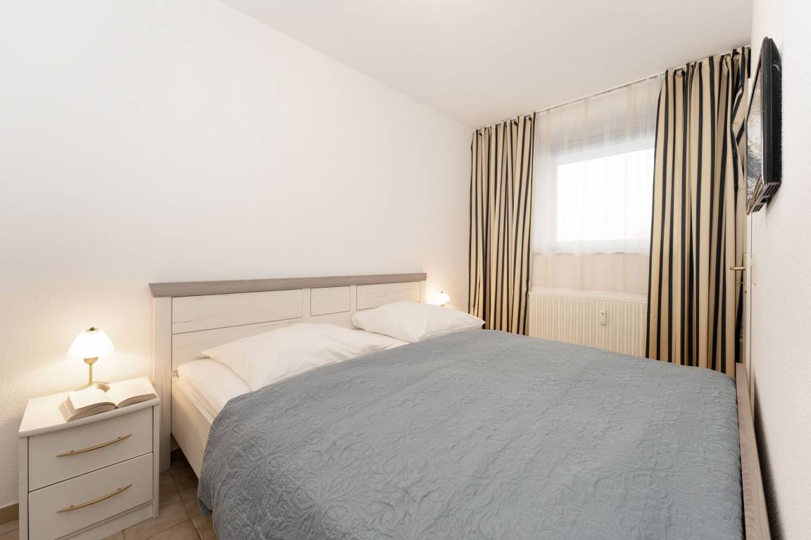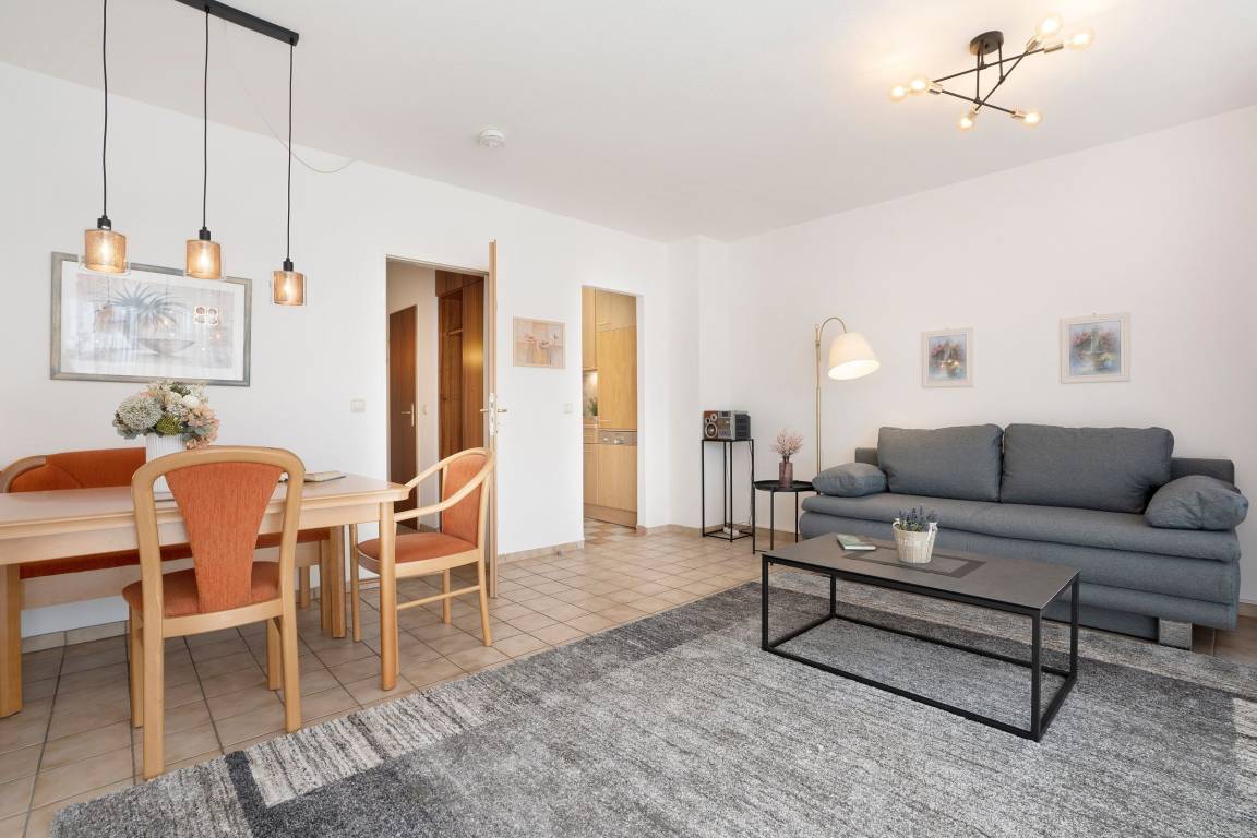 Machen Sie es sich hier auf der komfortablen Couch mit Schlaffunktion (150x200 cm) gemütlich und genießen ruhige Fernseh-Abende oder genießen Sie gesellige Runden in der integrierten Essecke. Ein Flatscreen-TV und eine Stereo-Anlage bieten Unterhaltung. Der offene Wohnraum ist lichtdurchflutet und verfügt über einen direkten Zugang zum möblierten Balkon mit Südost-Ausrichtung. Genießen Sie hier herrliche Sonnenstunden! Vom Wohnzimmer aus erreichen Sie die separate Küche, die zum Wohnraum hin offen liegt. Klein, aber fein ist hier die Devise. Für eine gute Ausstattung ist gesorgt, denn Annehmlichkeiten wie ein 4-Platten-Ceranherd, Backofen und Spülmaschine helfen im Ferienalltag. Das gemütliche Schlafzimmer verfügt über ein Doppelbett (2x 90x200 cm) und einen geräumigem Kleiderschrank für Ihre Urlaubsgarderobe. Im hell gefliesten Bad mit moderner Eckdusche, WC, Waschtisch und beleuchtetem Spiegel starten Sie entspannt in den Tag.