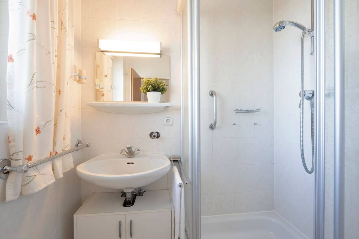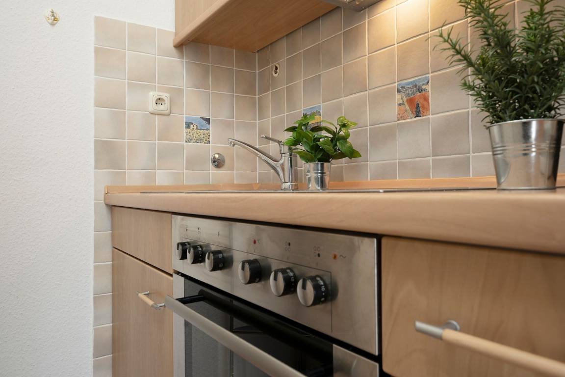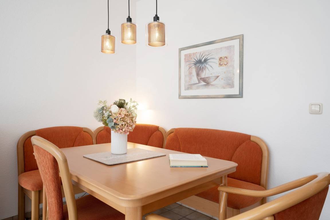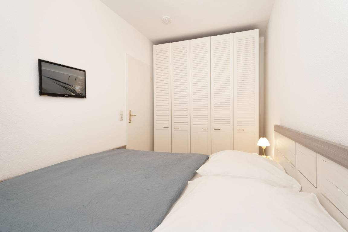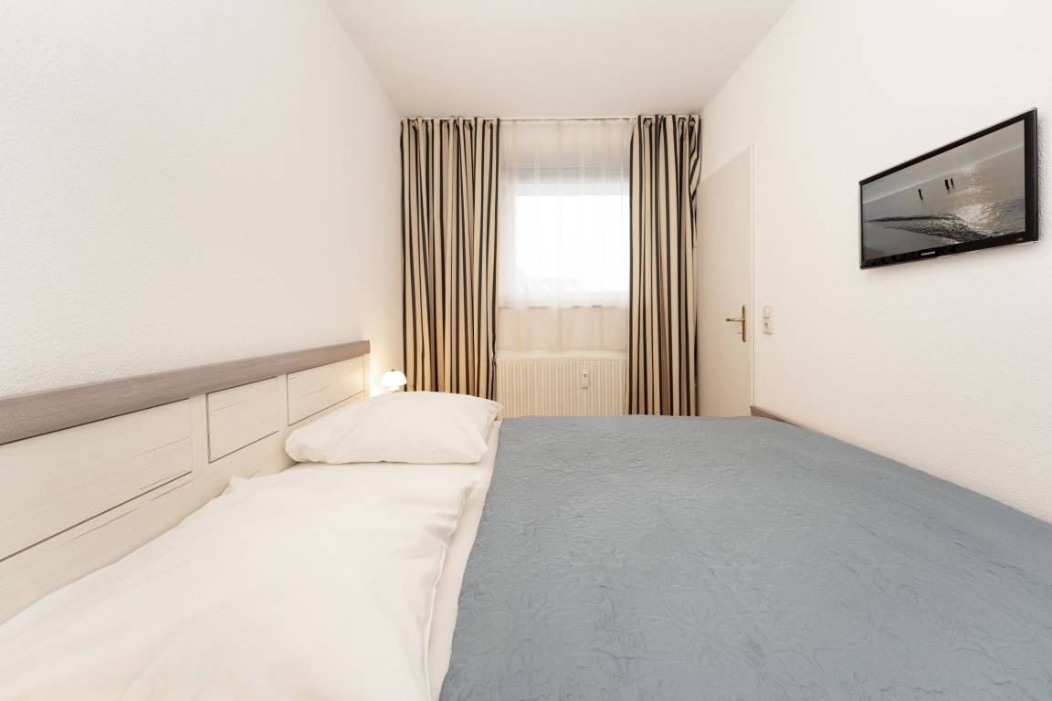Machen Sie es sich hier auf der komfortablen Couch mit Schlaffunktion (150x200 cm) gemütlich und genießen ruhige Fernseh-Abende oder genießen Sie gesellige Runden in der integrierten Essecke. Ein Flatscreen-TV und eine Stereo-Anlage bieten Unterhaltung. Der offene Wohnraum ist lichtdurchflutet und verfügt über einen direkten Zugang zum möblierten Balkon mit Südost-Ausrichtung. Genießen Sie hier herrliche Sonnenstunden! Vom Wohnzimmer aus erreichen Sie die separate Küche, die zum Wohnraum hin offen liegt. Klein, aber fein ist hier die Devise. Für eine gute Ausstattung ist gesorgt, denn Annehmlichkeiten wie ein 4-Platten-Ceranherd, Backofen und Spülmaschine helfen im Ferienalltag. Das gemütliche Schlafzimmer verfügt über ein Doppelbett (2x 90x200 cm) und einen geräumigem Kleiderschrank für Ihre Urlaubsgarderobe. Im hell gefliesten Bad mit moderner Eckdusche, WC, Waschtisch und beleuchtetem Spiegel starten Sie entspannt in den Tag.