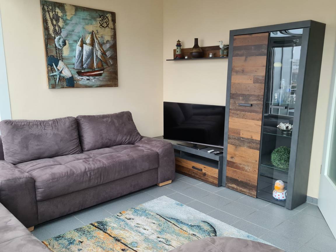Im hellen Wohnzimmer erwartet Sie eine gemütliche Eckcouch (Schlafcouch), ein Radio, ein TV sowie eine geräumige Schrankwand. Die Wintergarten ähnliche Gestaltung im Wohnzimmer bietet Ihnen einen besonders schönen Ausblick über Grömitz in Richtung Ostsee. Von hier aus gelangen Sie auf die möblierte Süd-Ost-Dachterrasse.
