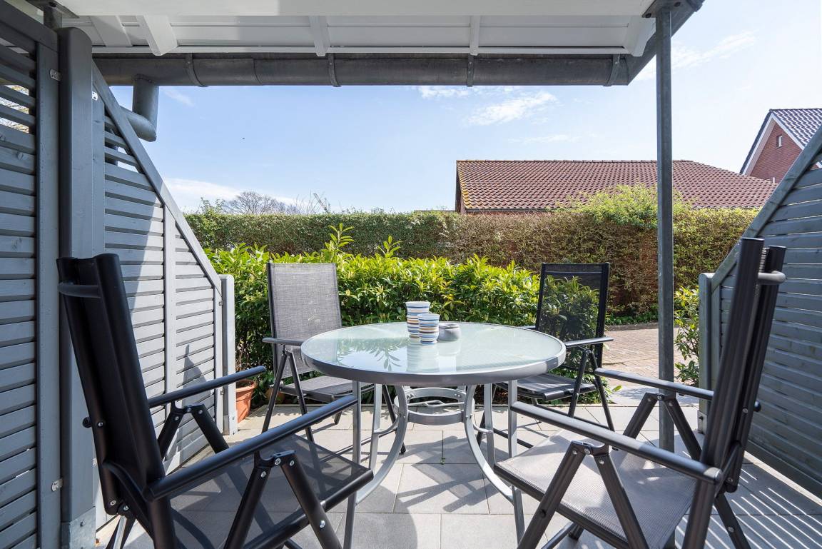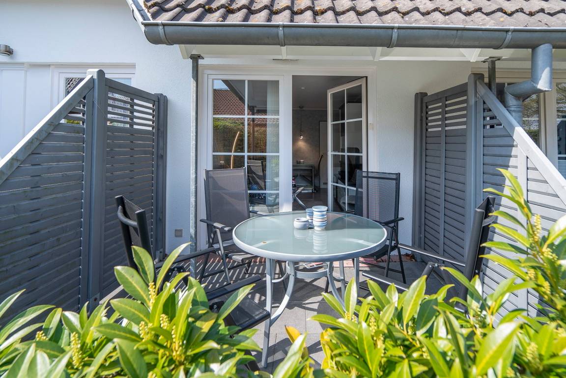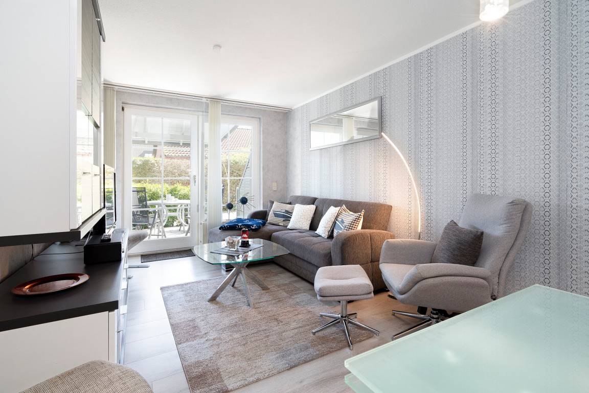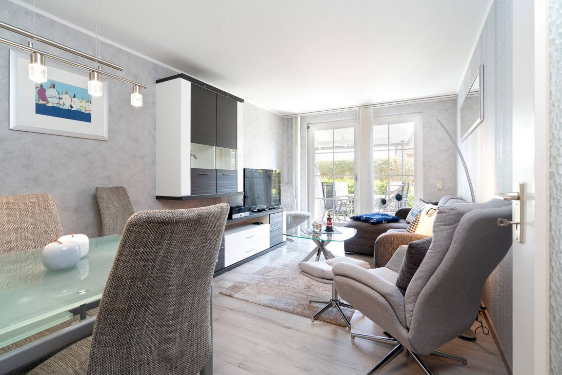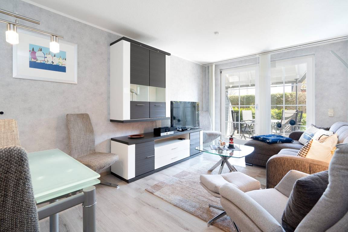 Modernes Wohn- und Esszimmer im EG mit direktem Zugang zur Terrasse. Das Wohn- und Esszimmer ist mit einem Essplatz für 4 Personen, einer Eck-Couch, einem Couchtisch und einer Kommode ausgestattet. Zur Unterhaltung stehen ein Flachbildschirm und ein Kofferradio mit CD-Player zur Verfügung. Das Zimmer ist mit Laminatboden ausgelegt.