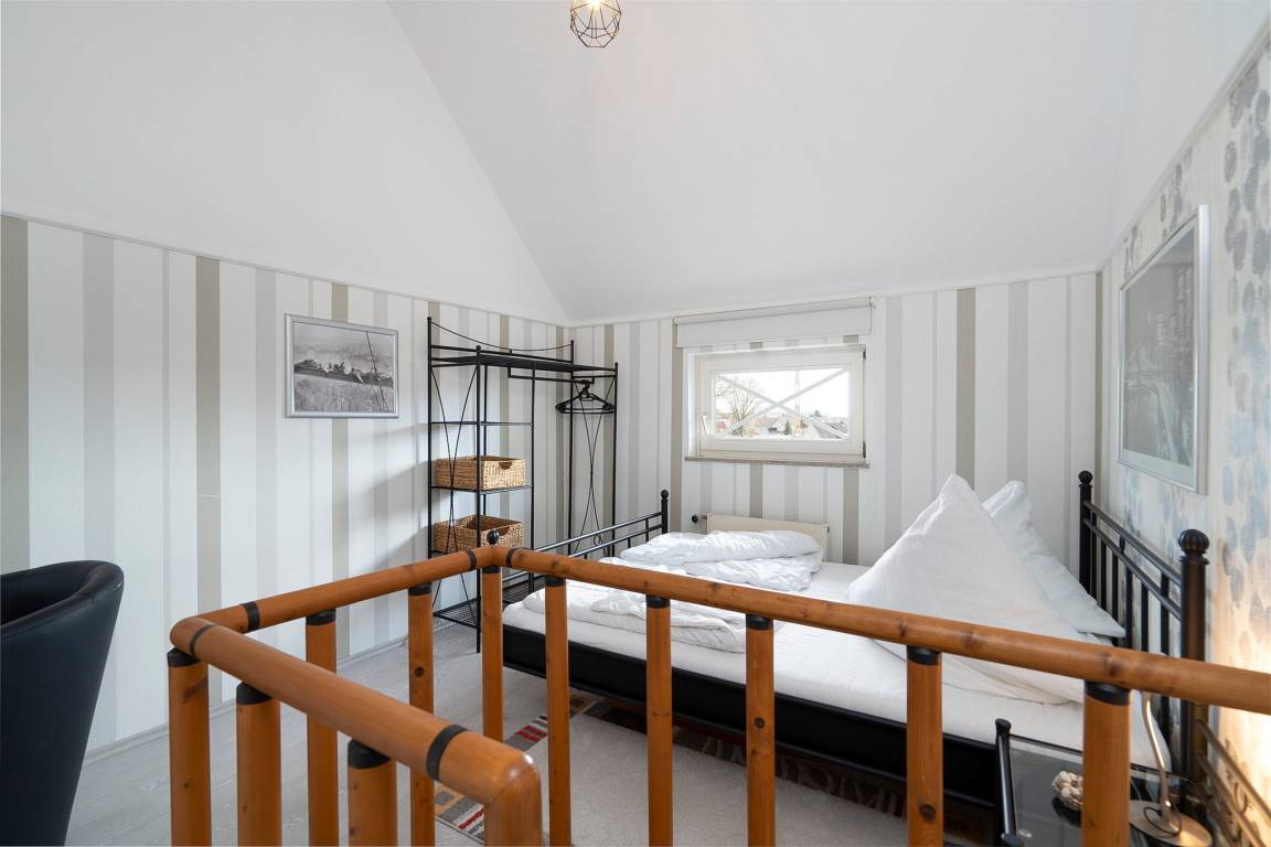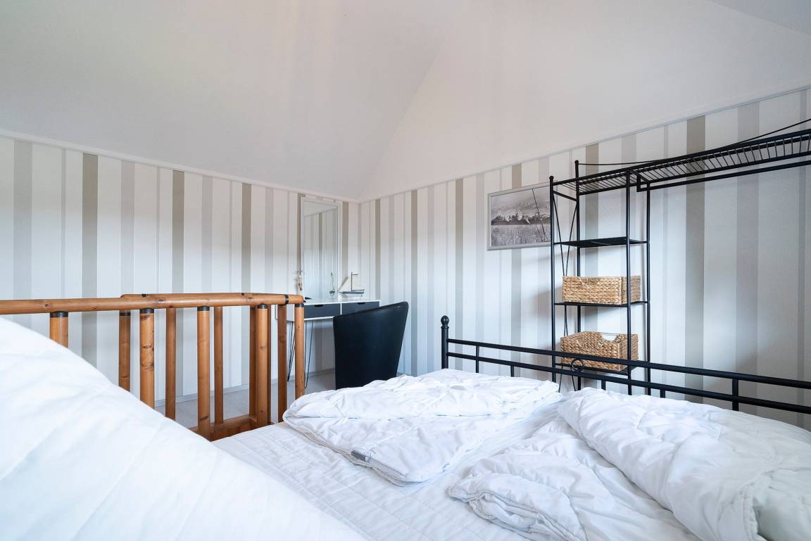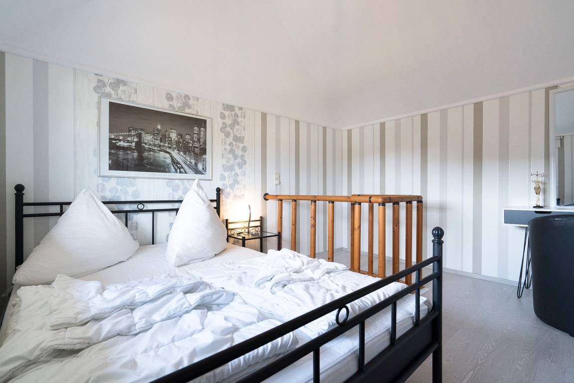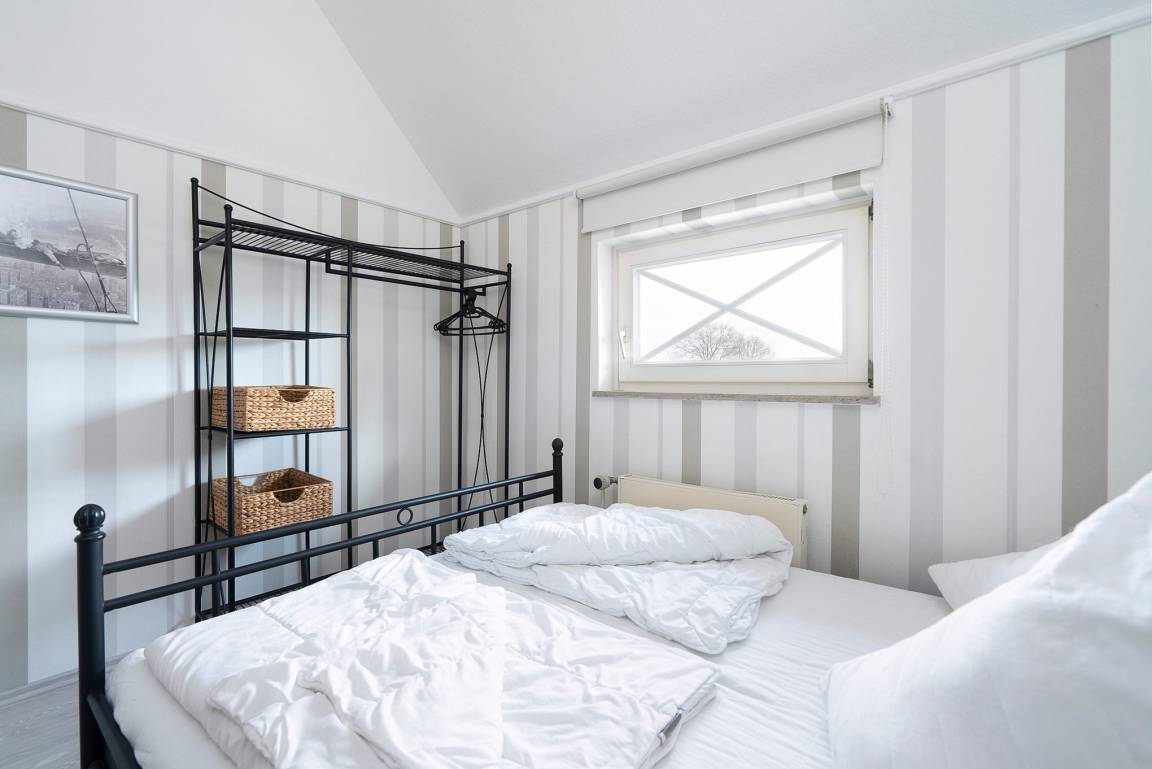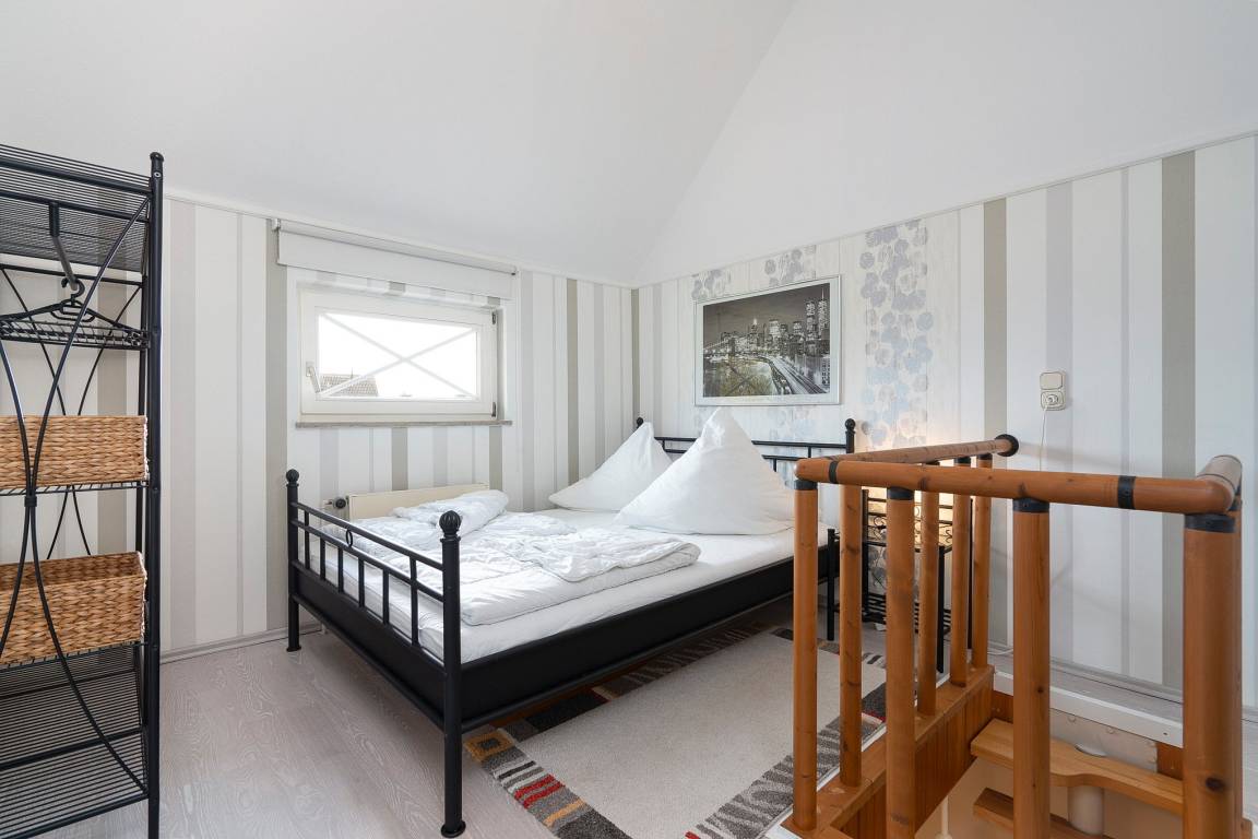 Das Schlafzimmer im 2. OG ist über eine steile Raumspartreppe erreichbar. Das Schlafzimmer ist mit einem Doppelbett(140x200cm), einem offenen Kleiderschrank und einem Sessel ausgestattet. Das Zimmer ist mit Teppichboden ausgelegt. Das Fenster lässt sich durch ein Innenrollo verdunkeln.