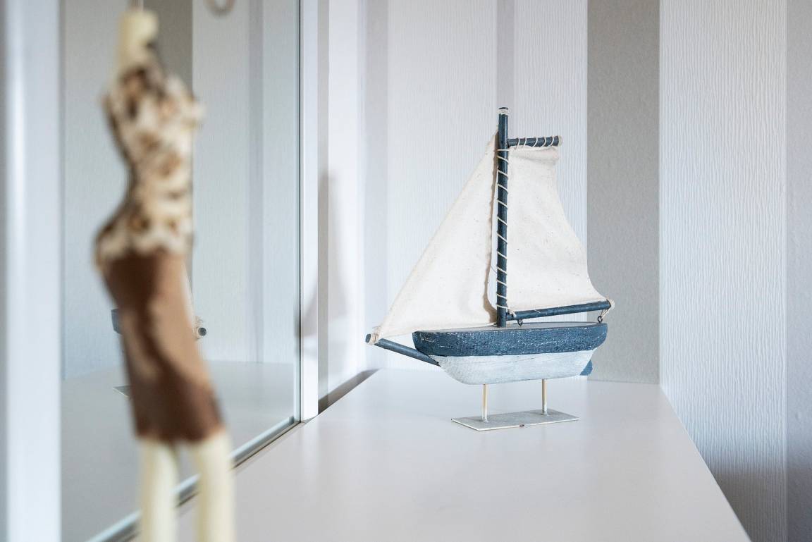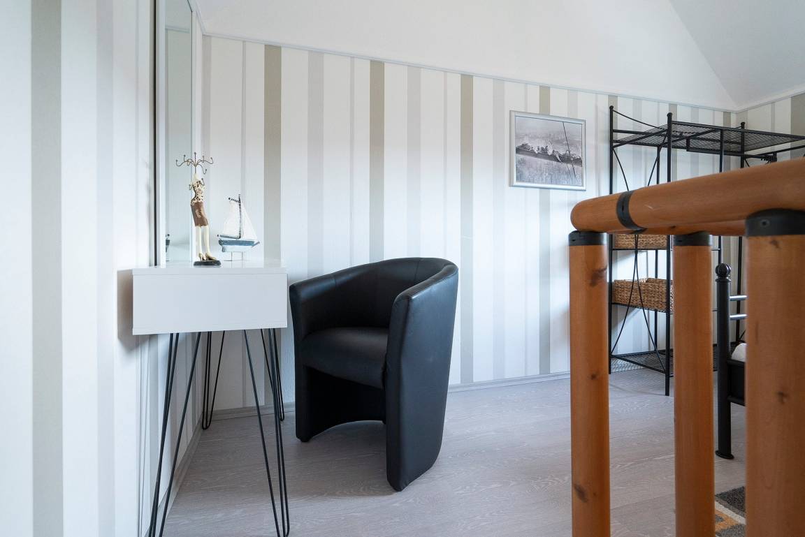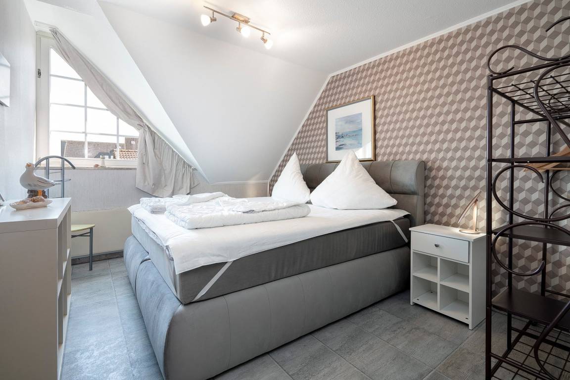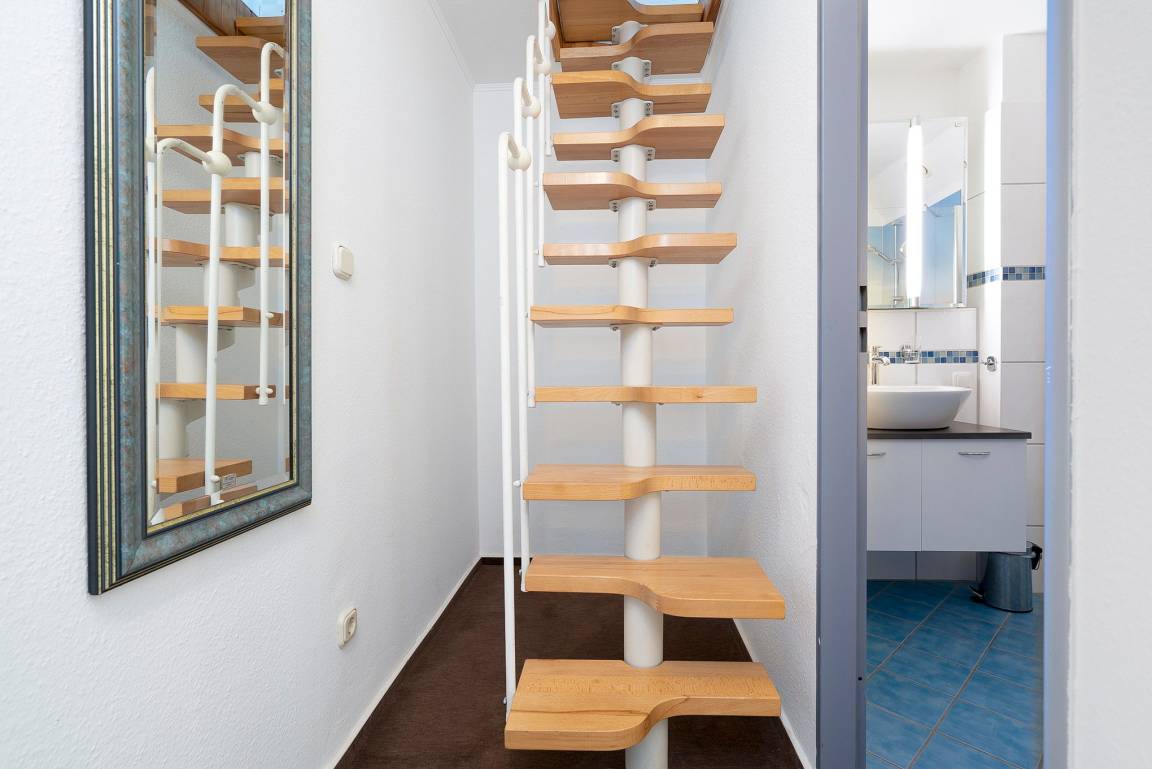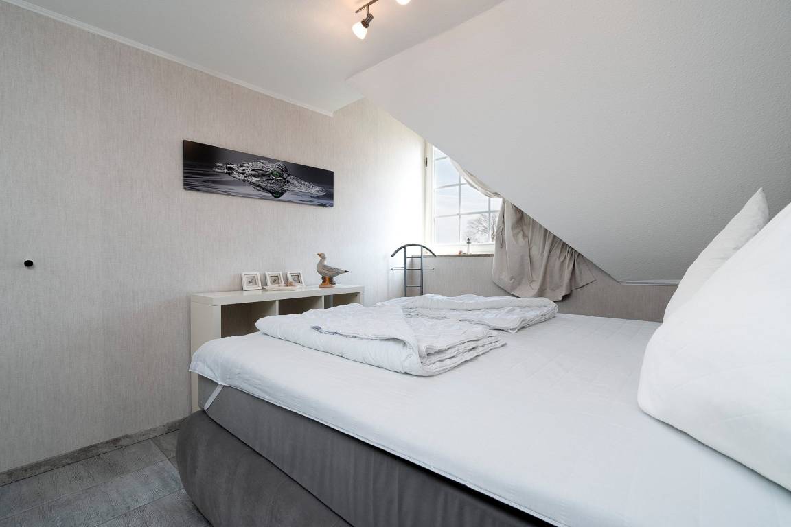 Das Schlafzimmer im 2. OG ist über eine steile Raumspartreppe erreichbar. Das Schlafzimmer ist mit einem Doppelbett(140x200cm), einem offenen Kleiderschrank und einem Sessel ausgestattet. Das Zimmer ist mit Teppichboden ausgelegt. Das Fenster lässt sich durch ein Innenrollo verdunkeln.