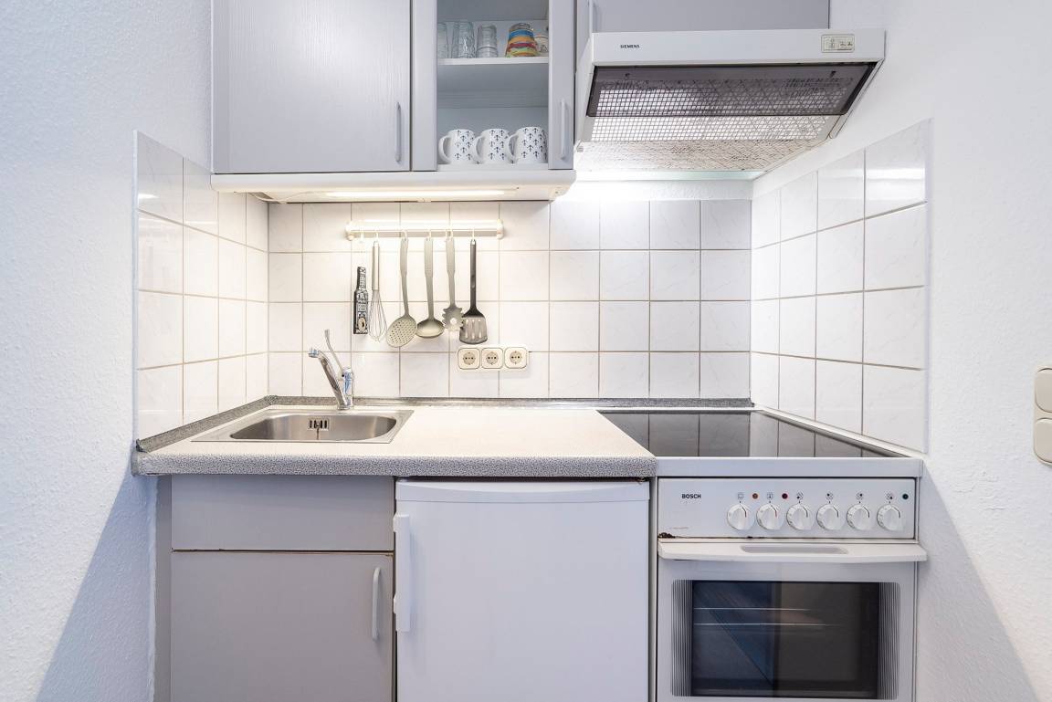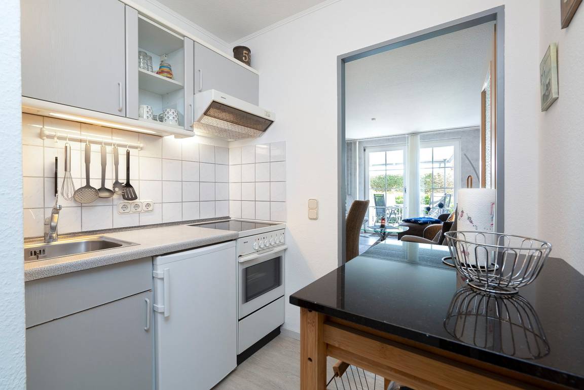 Moderne, komplett ausgestattete Pantry-Küche im EG. Die Pantry-Küche ist mit einem 4-Platten Cerankochfeld, einem Backofen, einem Kühlschrank mit kleinem 2-Sterne Gefrierfach, einem Wasserkocher, einem Toaster und einer Kaffeemaschine ausgestattet.