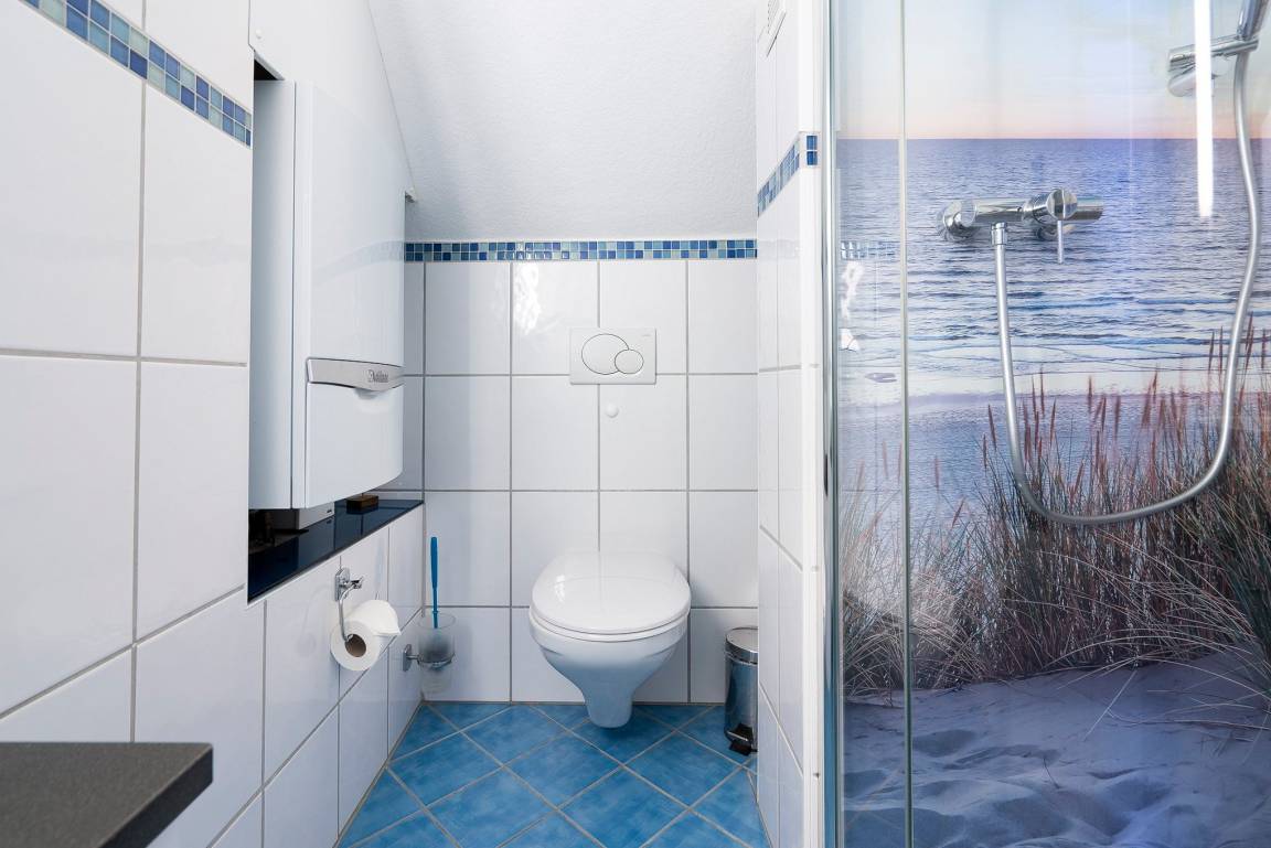 Modernes, hell gefliestes Bad im 1.OG. Das Bad ist mit einer Dusche, einem Waschbecken und einem WC ausgestattet.