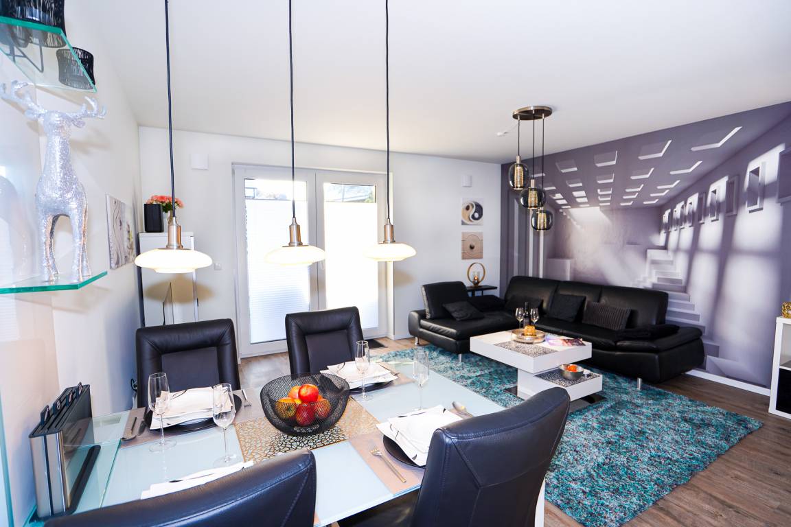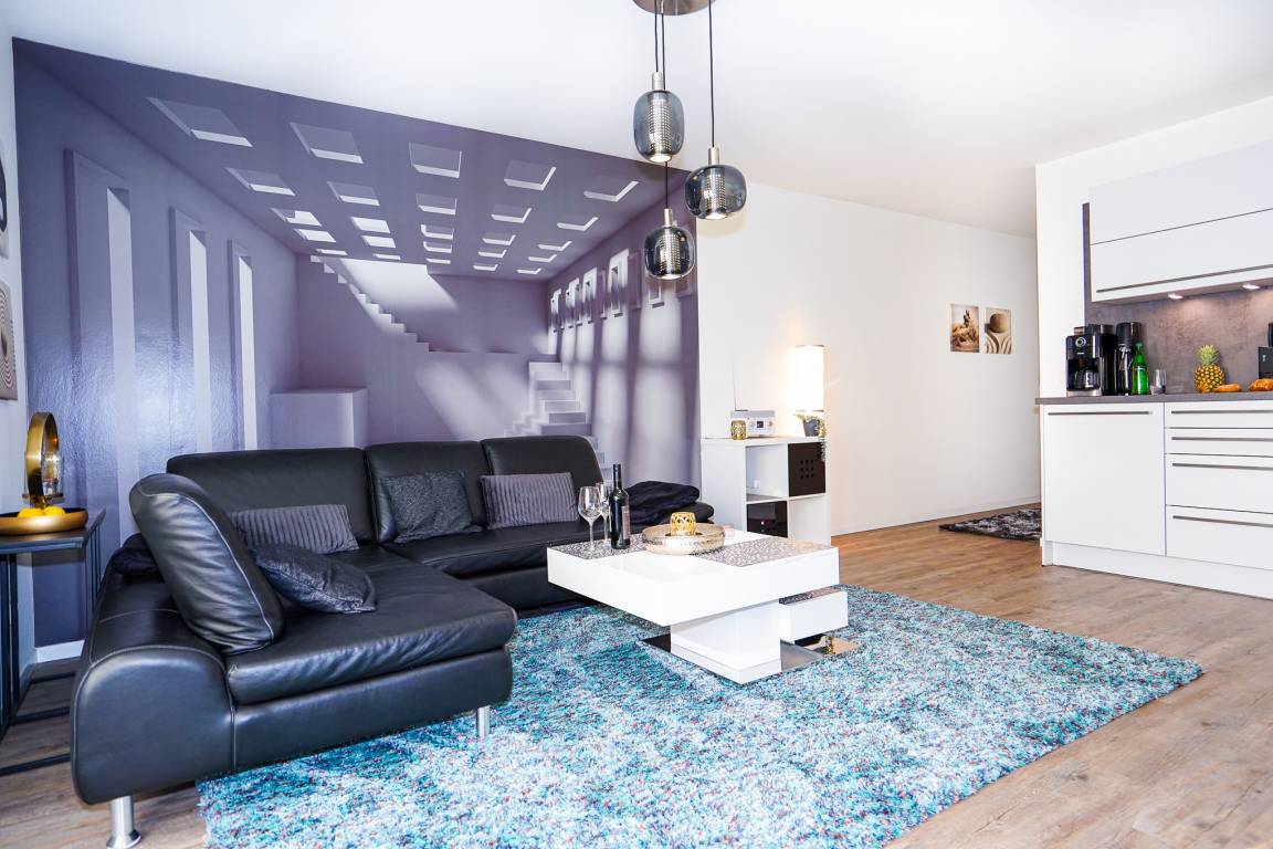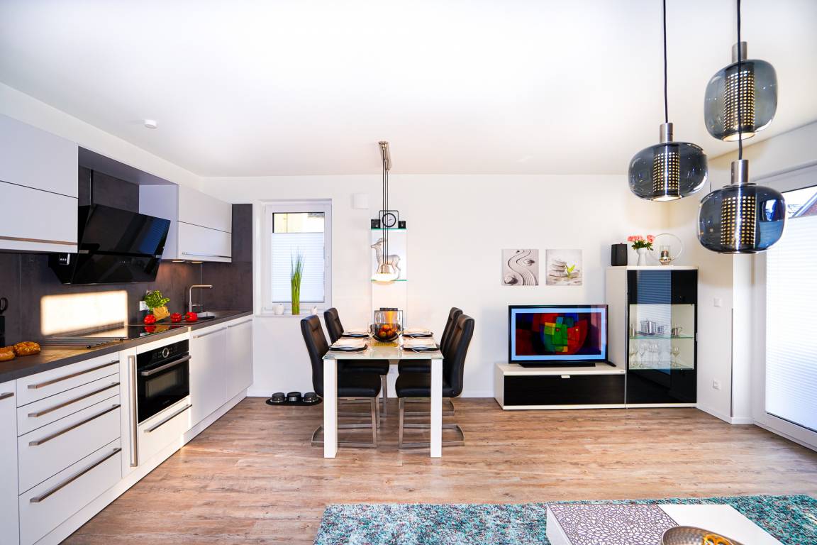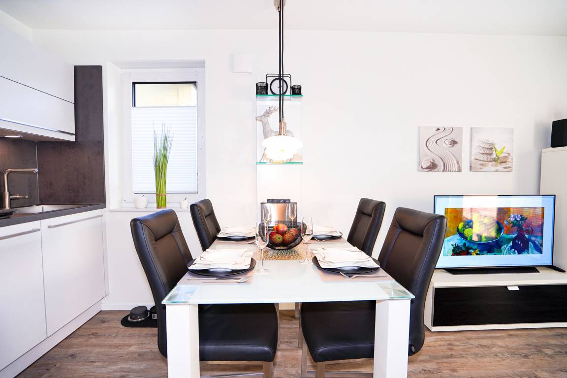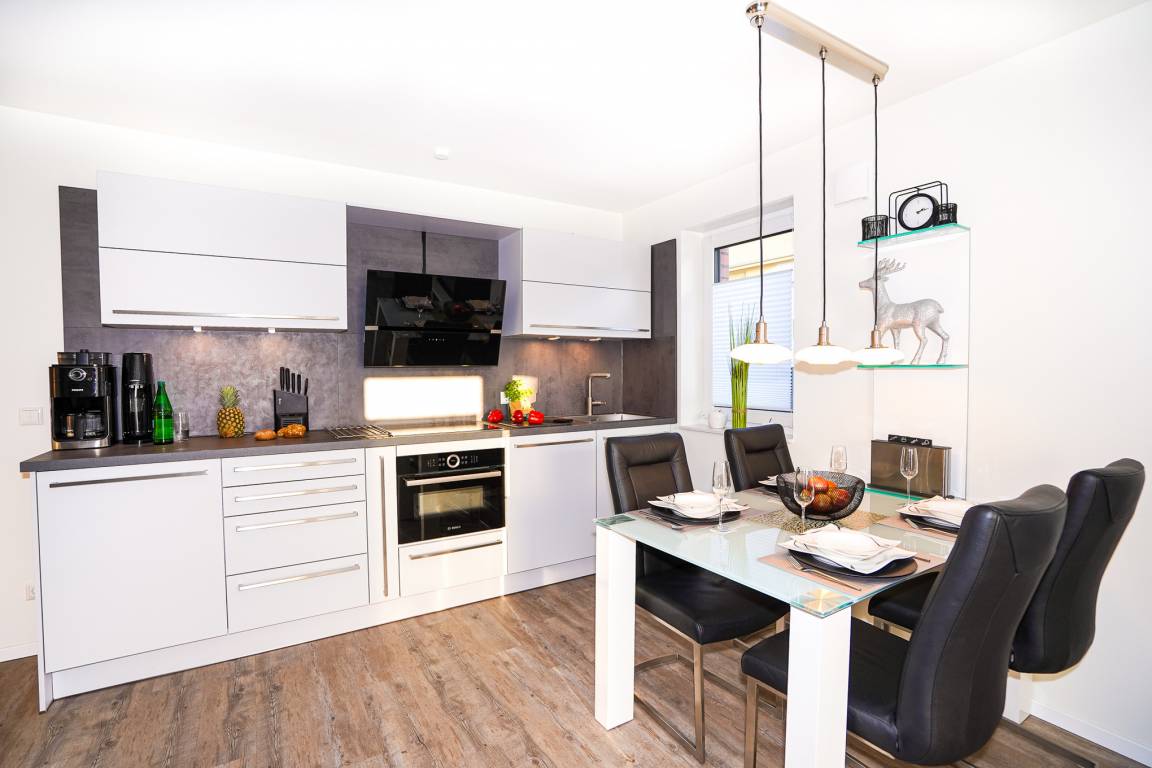 Das lichtdurchflutete Wohnzimmer mit bodentiefen Fenstern überzeugt mit einem bequemen Ledersofa und einer Essgruppe. Ein großer Flatscreen-TV und WLAN (Glasfaser) stehen Ihnen zum Ausklingen des Tages zur Verfügung. Die stilvolle und offene Küche ist mit allen erforderlichen Geräten wie bsp. Backofen, Induktionsherd, Spülmaschine, Mikrowelle und Kühlschrank mit Gefrierfach ausgestattet.