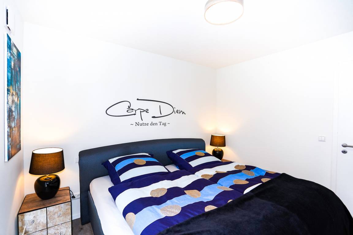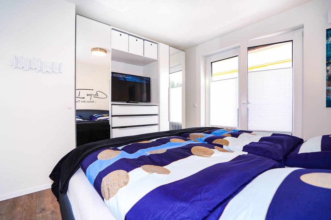Das Schlafzimmer verfügt über ein großes gemütliches Doppelbett (200 x 200 cm) und ausreichend Stauraum für Ihre Urlaubsgarderobe. Selbstverständlich steht Ihnen hier auch ein weiterer Fernseher zur Verfügung. Ein Plissee und elektrische Jalousien schützen Sie vor störenden Sonnenstrahlen.