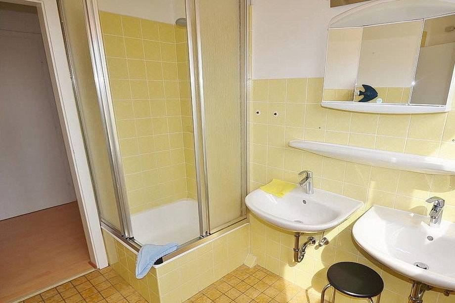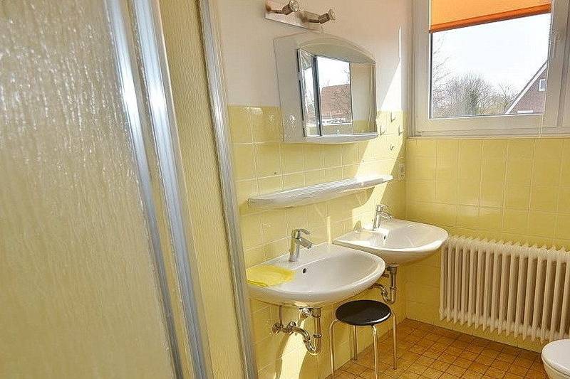 Freundliches, gefliestes Tageslichtbad mit Dusche, 2 Waschbecken und einer Toilette.