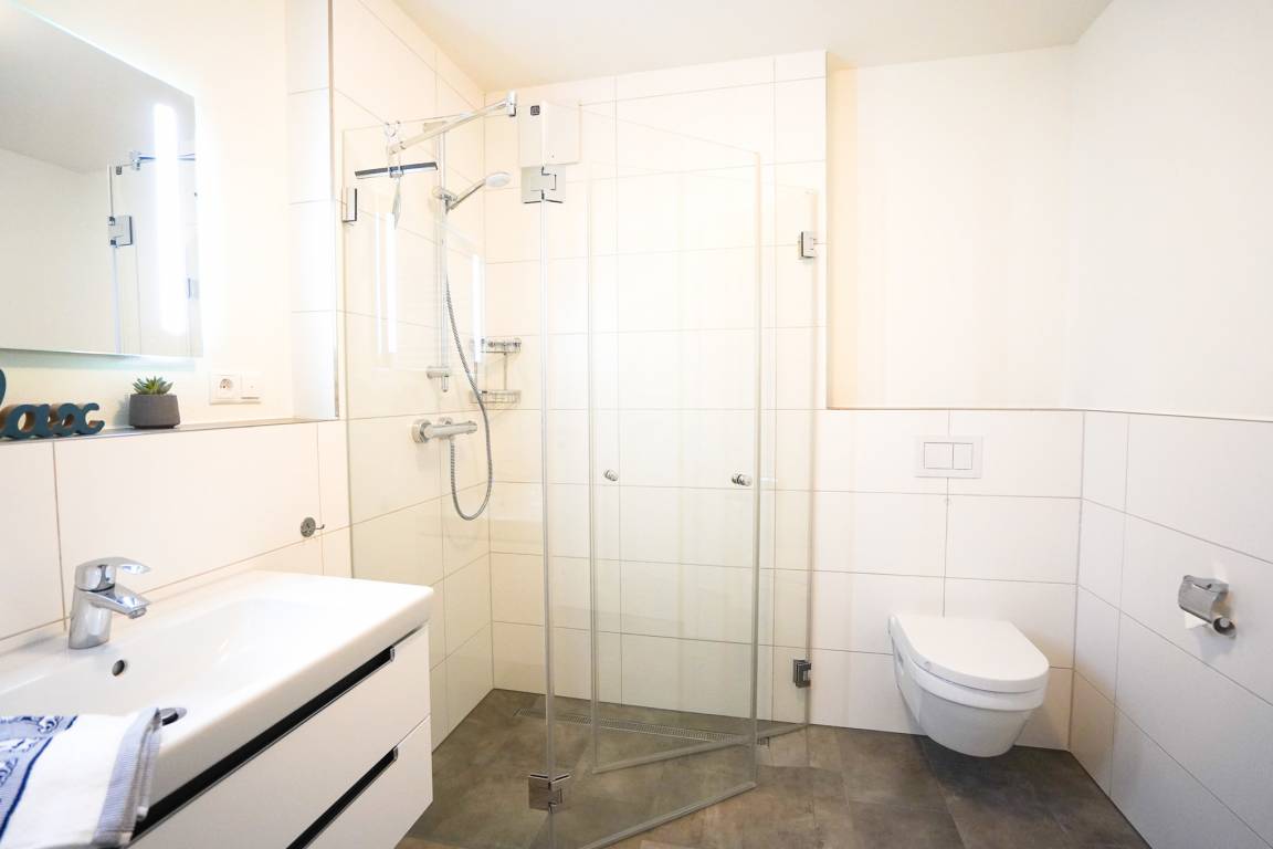 Im modernen Badezimmer mit bodengleicher Dusche finden Sie zusätzlich eine Waschmaschine zur kostenlosen Verwendung vor. Highlight ist hier die eigene Sauna, welche zur Entspannung einlädt.