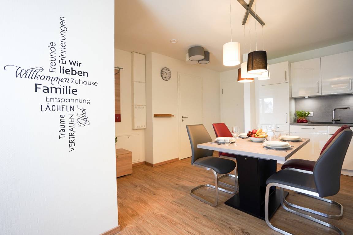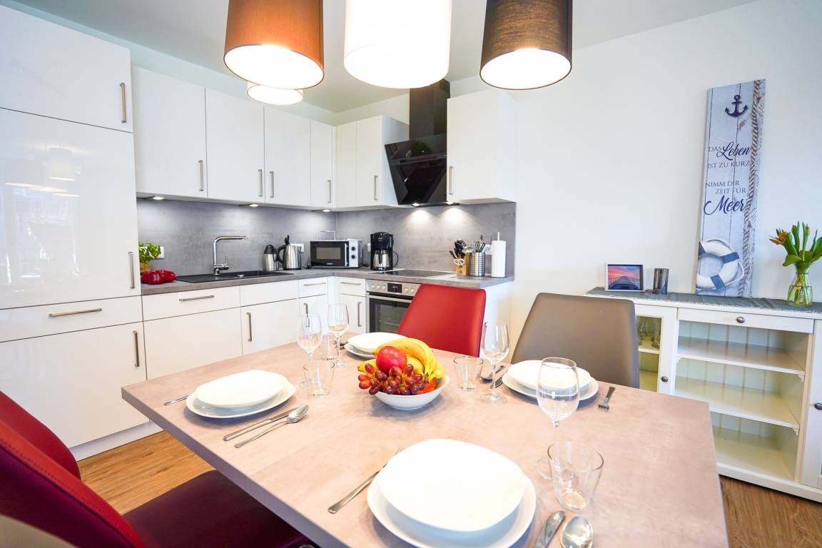Das lichtdurchflutete Wohnzimmer mit bodentiefen Fenstern überzeugt mit einem Schlafsofa und einer Essgruppe. Ein großer Flatscreen-TV und selbstverständlich WLAN stehen Ihnen zum Ausklingen des Tages zur Verfügung. Die stilvolle und offene Küche ist mit allen erforderlichen Geräten wie bsp. Backofen, Cerankochfeld, Spülmaschine, Mikrowelle und Kühlschrank mit Gefrierfach ausgestattet.