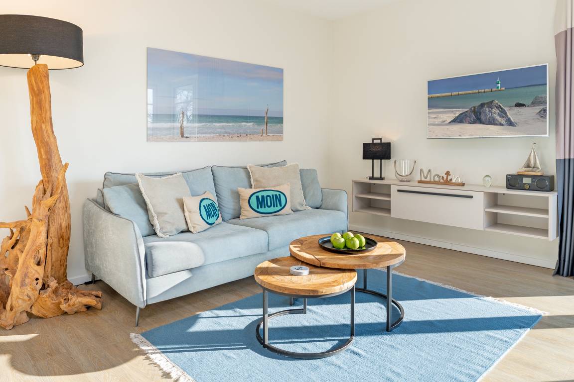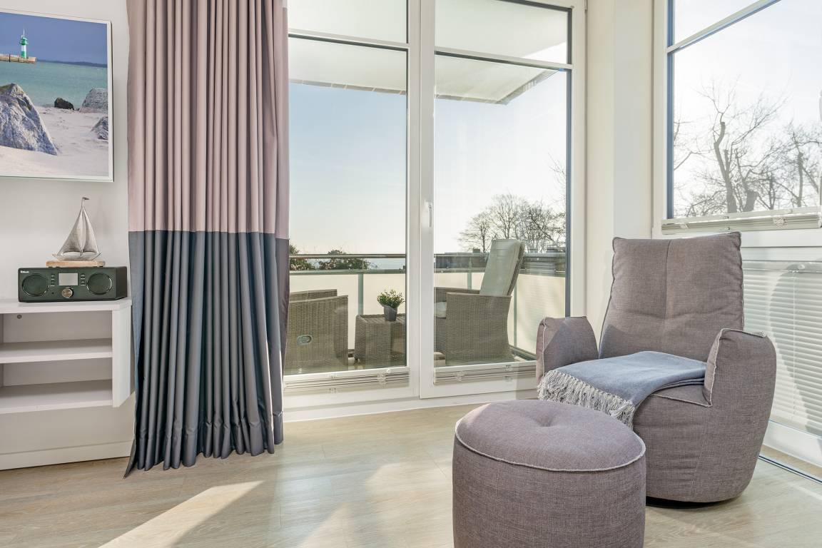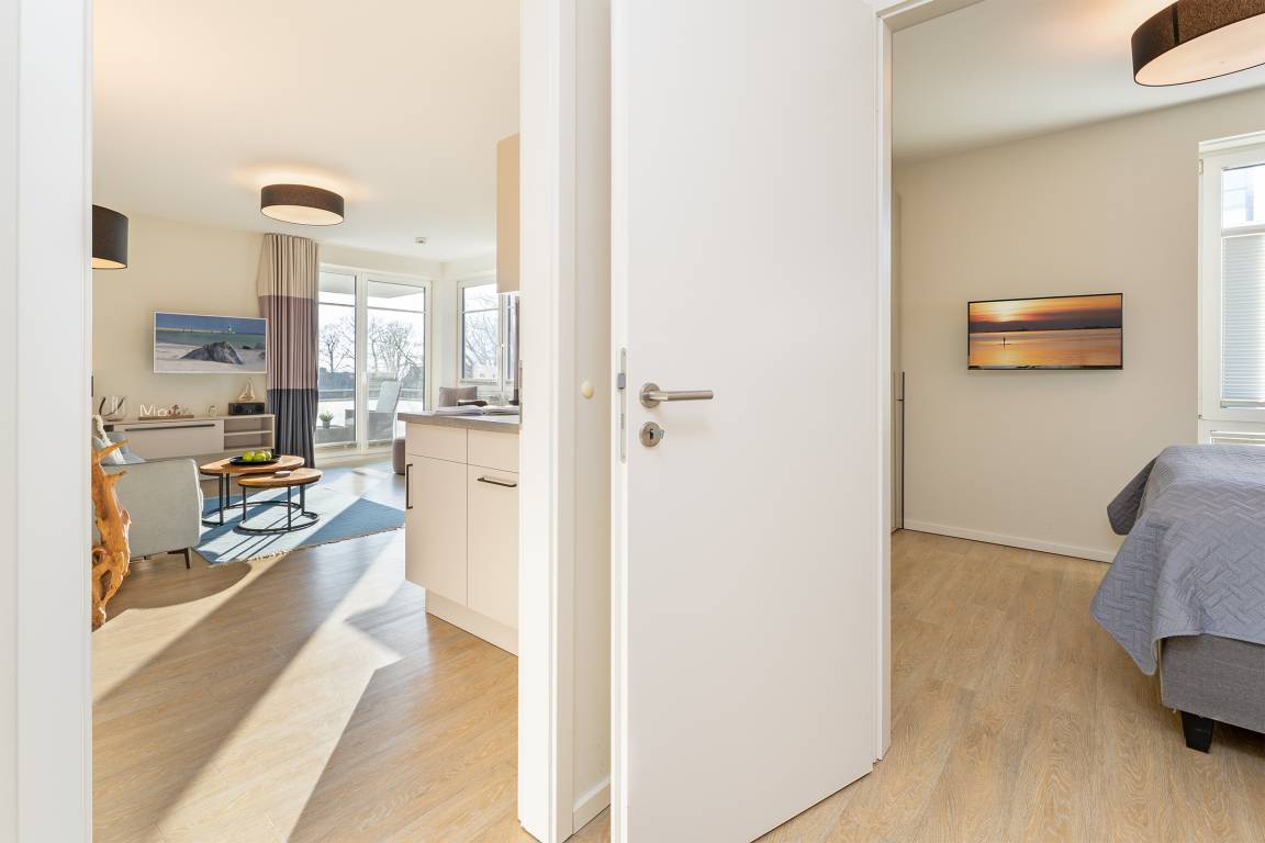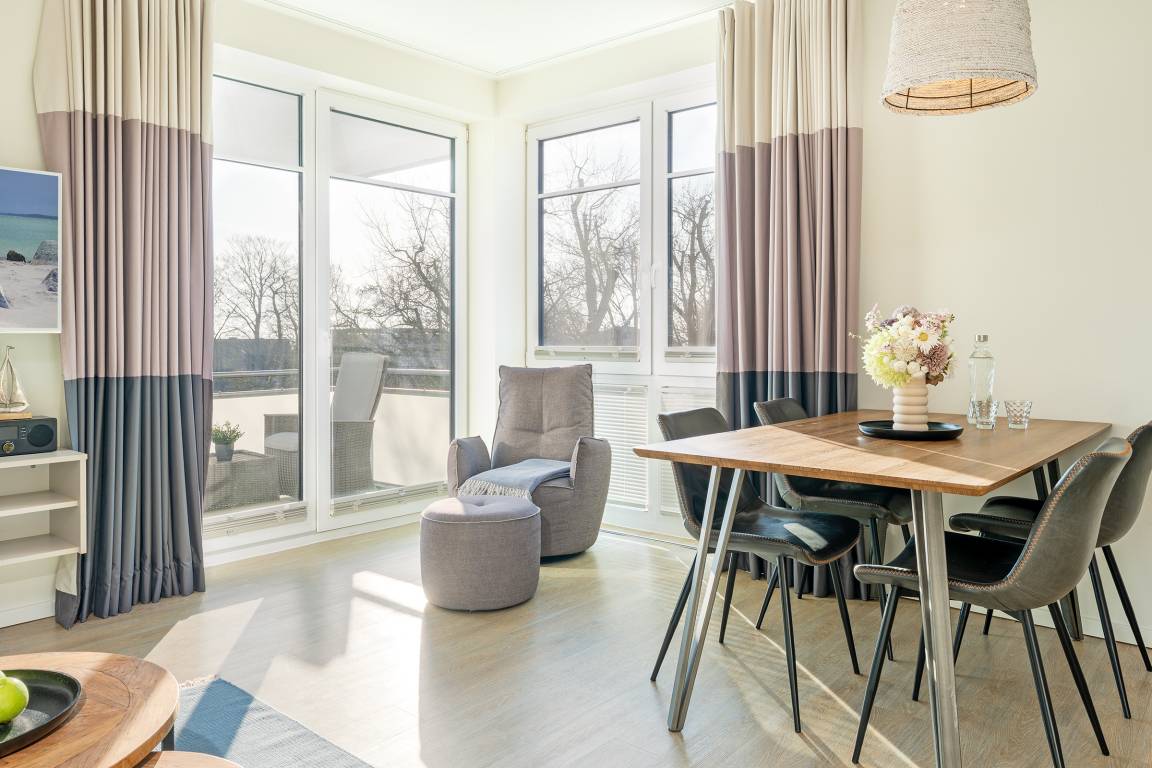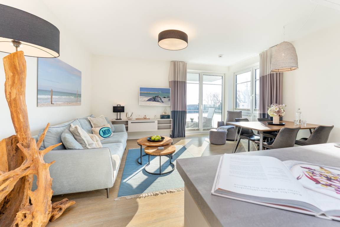 Neben einem großzügigen und lichtdurchfluteten Wohnbereich mit Schlafsofa (160x200 cm) verfügt die Wohnung über ein separates Schlafzimmer mit einem komfortablen Boxspringbett (180x200 cm). Hier finden Sie ausreichend Platz für Ruhe und Erholung. Die voll ausgestattete Küche bietet alles, was Hobbykoch-Herzen höher schlagen lässt. Bereiten Sie problemlos Ihre Mahlzeiten zu und genießen Sie gesellige Kochabende mit Freunden und Familie. Am Esstisch mit ausreichend Platz können Sie dann gemeinsam essen. Für Unterhaltung ist mit einem großen Flat-TV und kostenlosem WLAN-Anschluss ebenfalls gesorgt. Starten Sie Ihren Tag auf dem charmant angelegten Balkon mit einem heißen Kaffee und lassen Sie sich von dem (saisonal) wunderbaren Blick auf die Ostsee verzaubern. Für die tägliche Körperhygiene steht Ihnen ein modernes Badezimmer mit bodentiefer Dusche und Waschmaschine zur Verfügung.