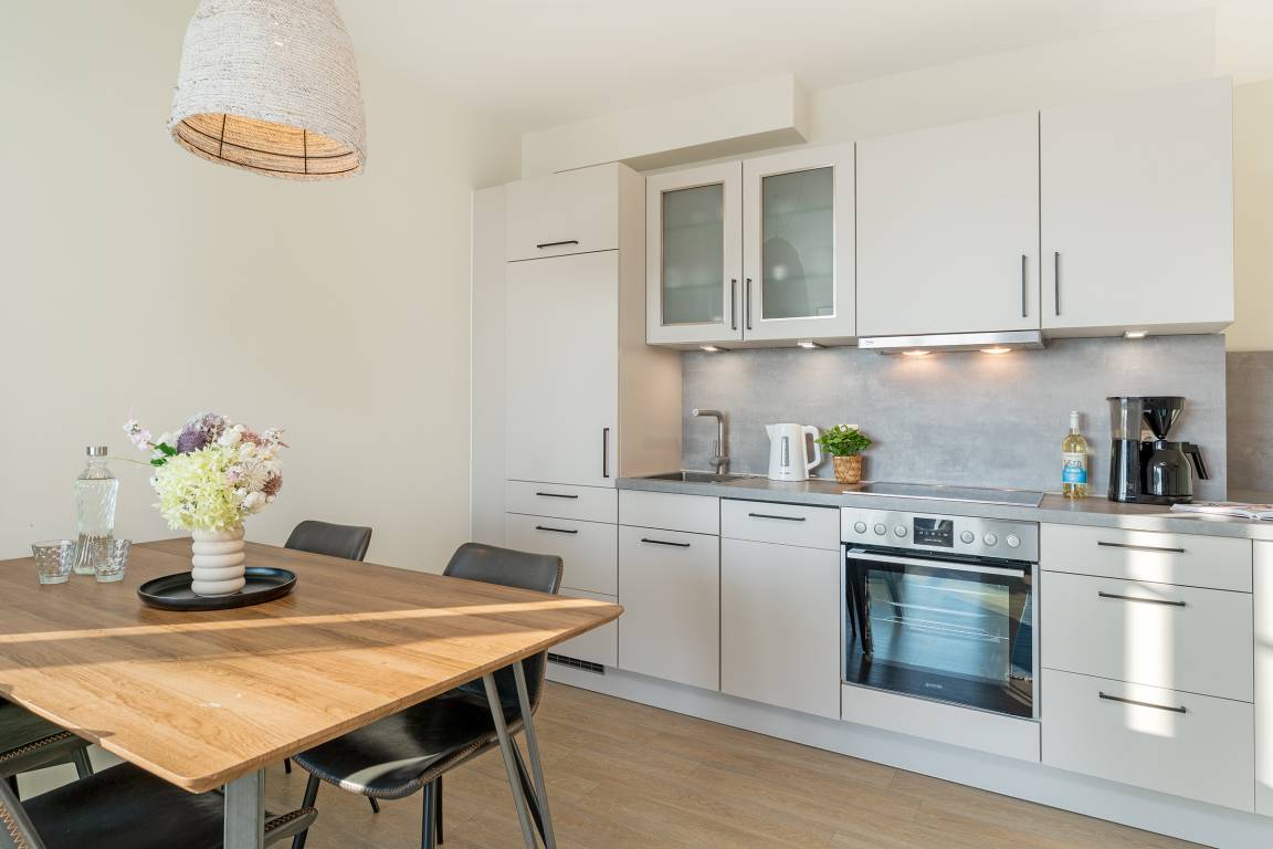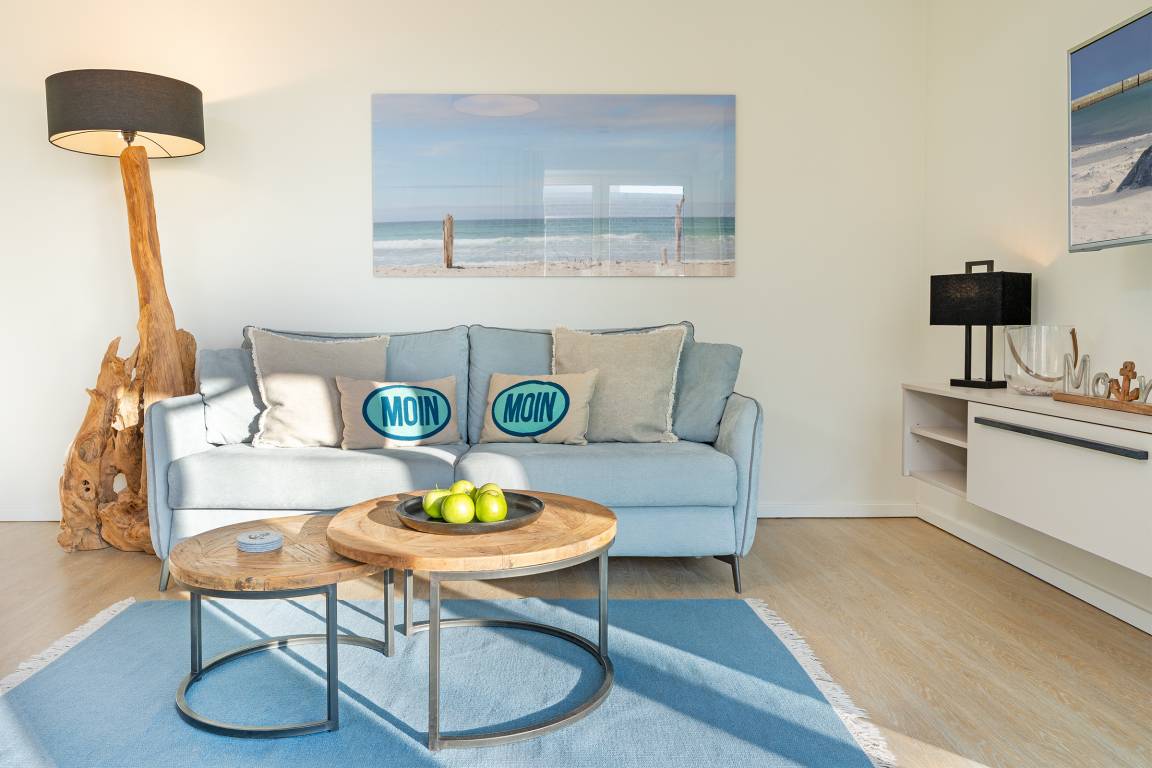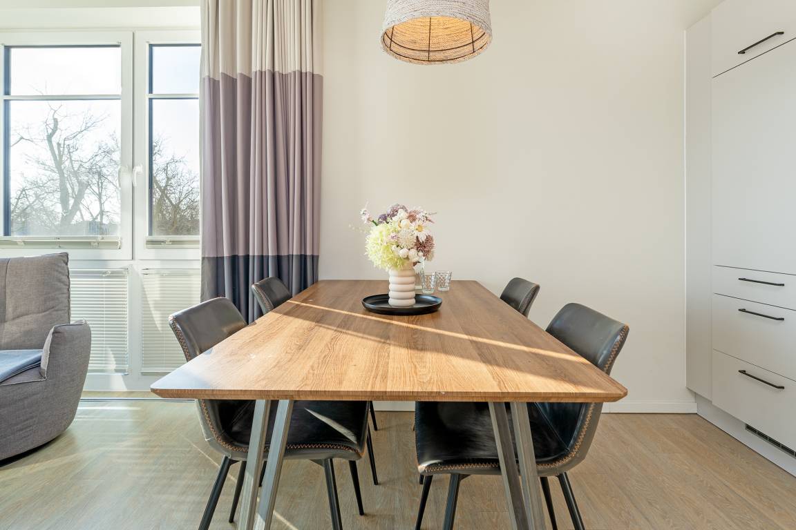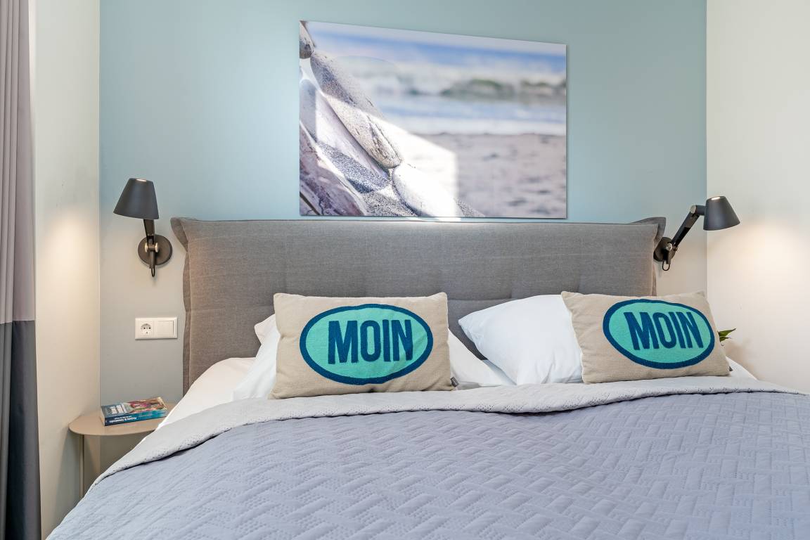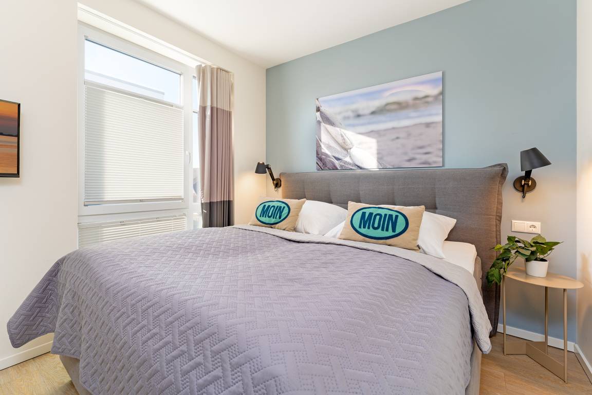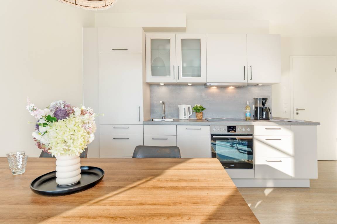 Neben einem großzügigen und lichtdurchfluteten Wohnbereich mit Schlafsofa (160x200 cm) verfügt die Wohnung über ein separates Schlafzimmer mit einem komfortablen Boxspringbett (180x200 cm). Hier finden Sie ausreichend Platz für Ruhe und Erholung. Die voll ausgestattete Küche bietet alles, was Hobbykoch-Herzen höher schlagen lässt. Bereiten Sie problemlos Ihre Mahlzeiten zu und genießen Sie gesellige Kochabende mit Freunden und Familie. Am Esstisch mit ausreichend Platz können Sie dann gemeinsam essen. Für Unterhaltung ist mit einem großen Flat-TV und kostenlosem WLAN-Anschluss ebenfalls gesorgt. Starten Sie Ihren Tag auf dem charmant angelegten Balkon mit einem heißen Kaffee und lassen Sie sich von dem (saisonal) wunderbaren Blick auf die Ostsee verzaubern. Für die tägliche Körperhygiene steht Ihnen ein modernes Badezimmer mit bodentiefer Dusche und Waschmaschine zur Verfügung.