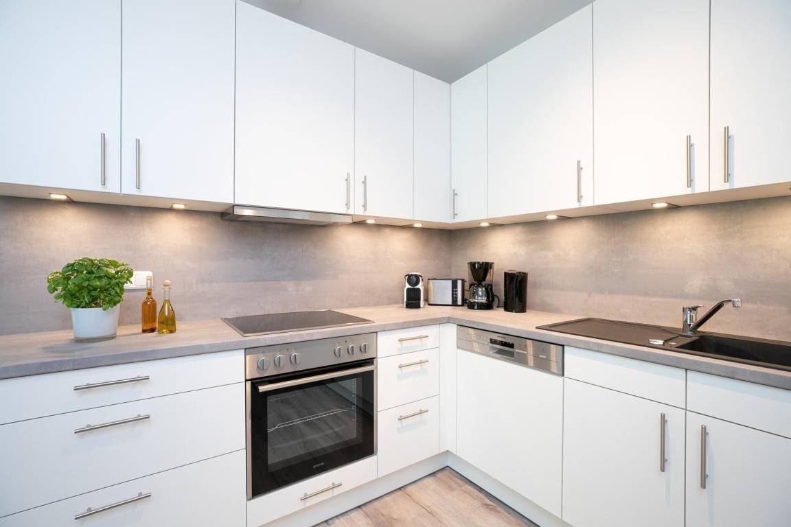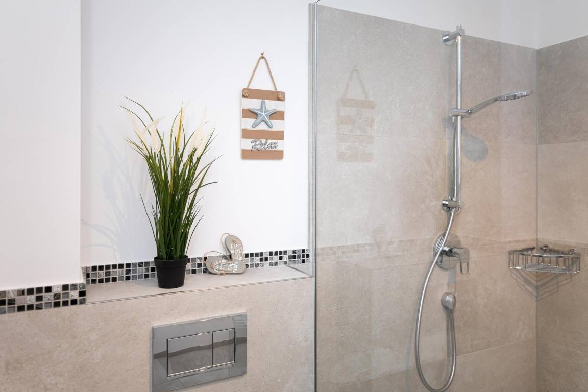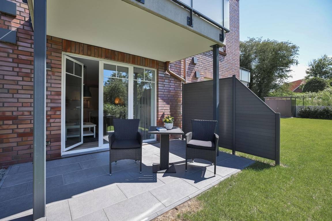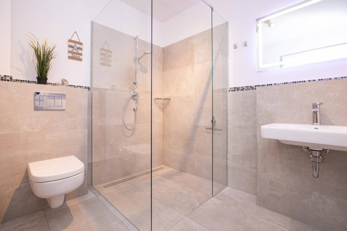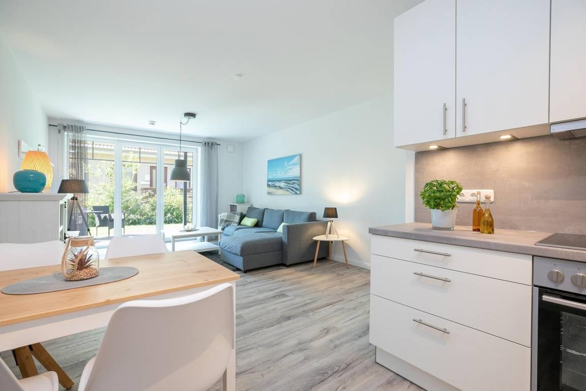 Über das Wohnzimmer gelangen Sie auf die möblierte Terrasse. Hier steht Wohlfühlen im Mittelpunkt... ein ausgiebiges Frühstück oder ein gemütlicher Abend mit Wein und Käse, lassen Sie den Alltag vergessen. Im offen gestalteten Wohnraum fügt sich die moderne Küche optimal ein. Ausgestattet mit Backofen, Herd, Kühl – und Gefrierschrank, Spülmaschine und Nespresso Kaffee-Kapselmaschine lassen sich hier zahlreiche Gerichte zaubern. Das Badezimmer überzeugt mit Fußbodenheizung, beheizbarem Handtuchhalter und Dusche mit bodentiefem Einstieg. Lassen Sie es sich in dieser Ferienoase gut gehen...