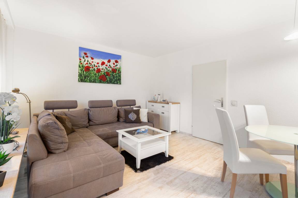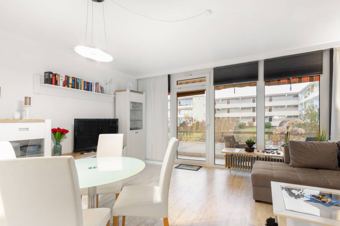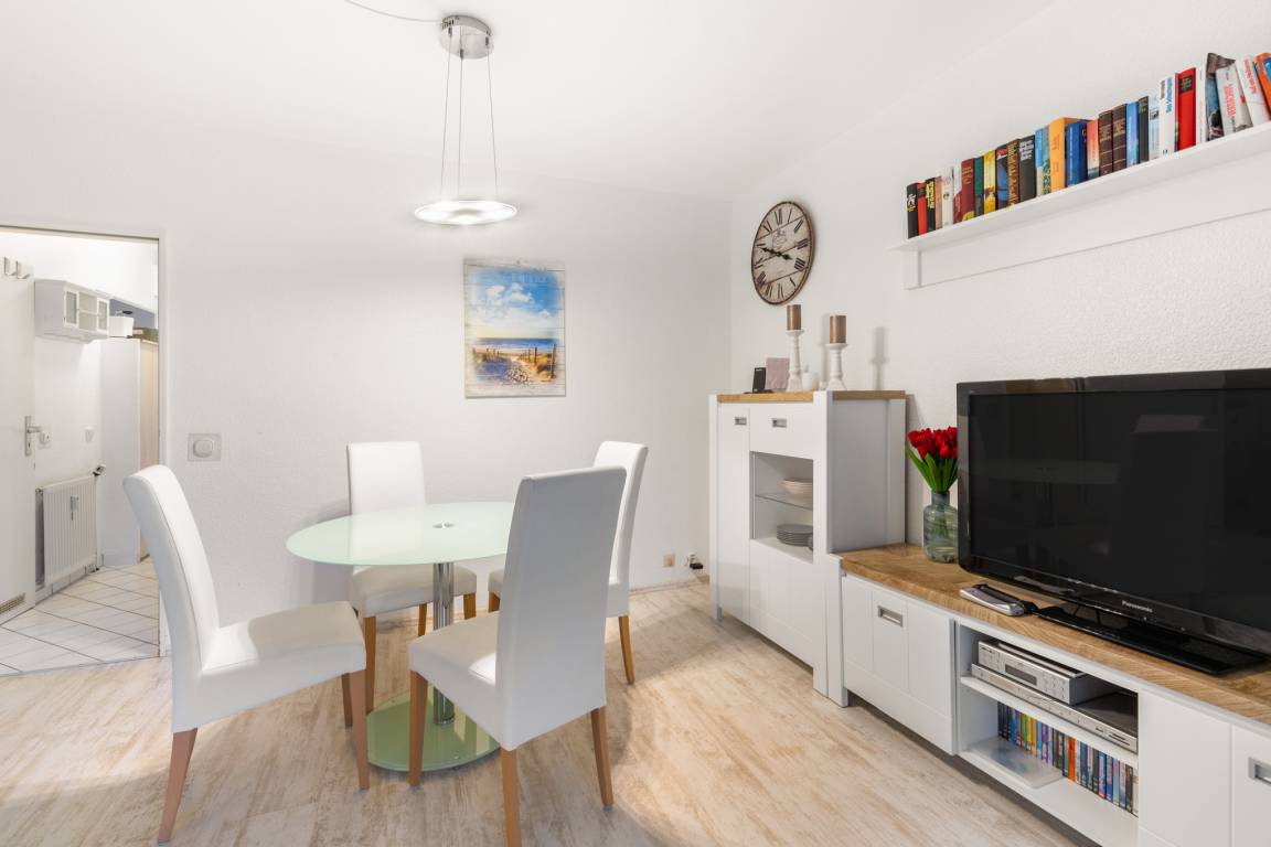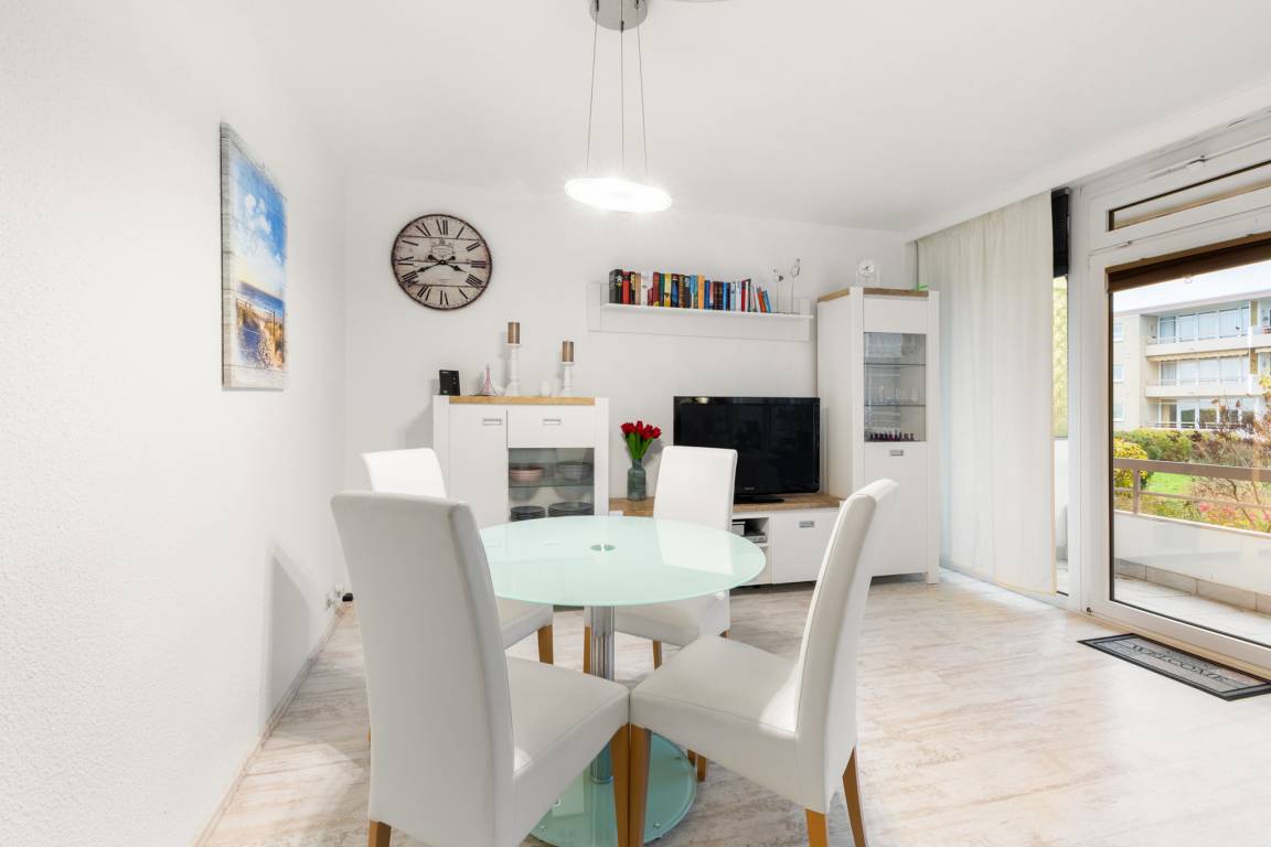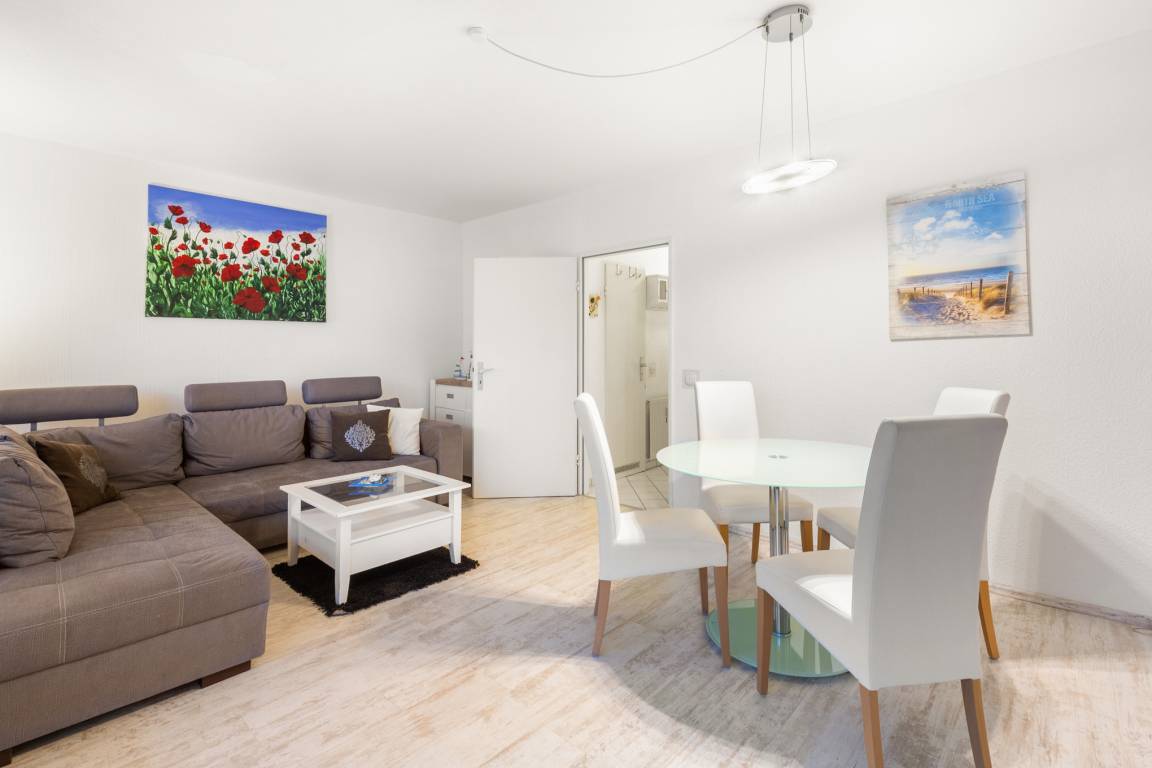 Helles, freundliches Wohn- und Esszimmer mit direktem Zugang zum Balkon. Das Wohn- und Esszimmer ist mit einem Essplatz für 4 Personen, einer Eckcouch (Schlafsofa 140x190cm) und einem Wohnzimmerschrank ausgestattet. Zur Unterhaltung stehen ein Fernseher, ein DVD-Player und eine Mini-Stereoanlage zur Verfügung. Das Wohn- und Esszimmer ist mit Laminat ausgelegt. Die Fenster lassen sich durch eine Jalousie etwas abdunkeln.