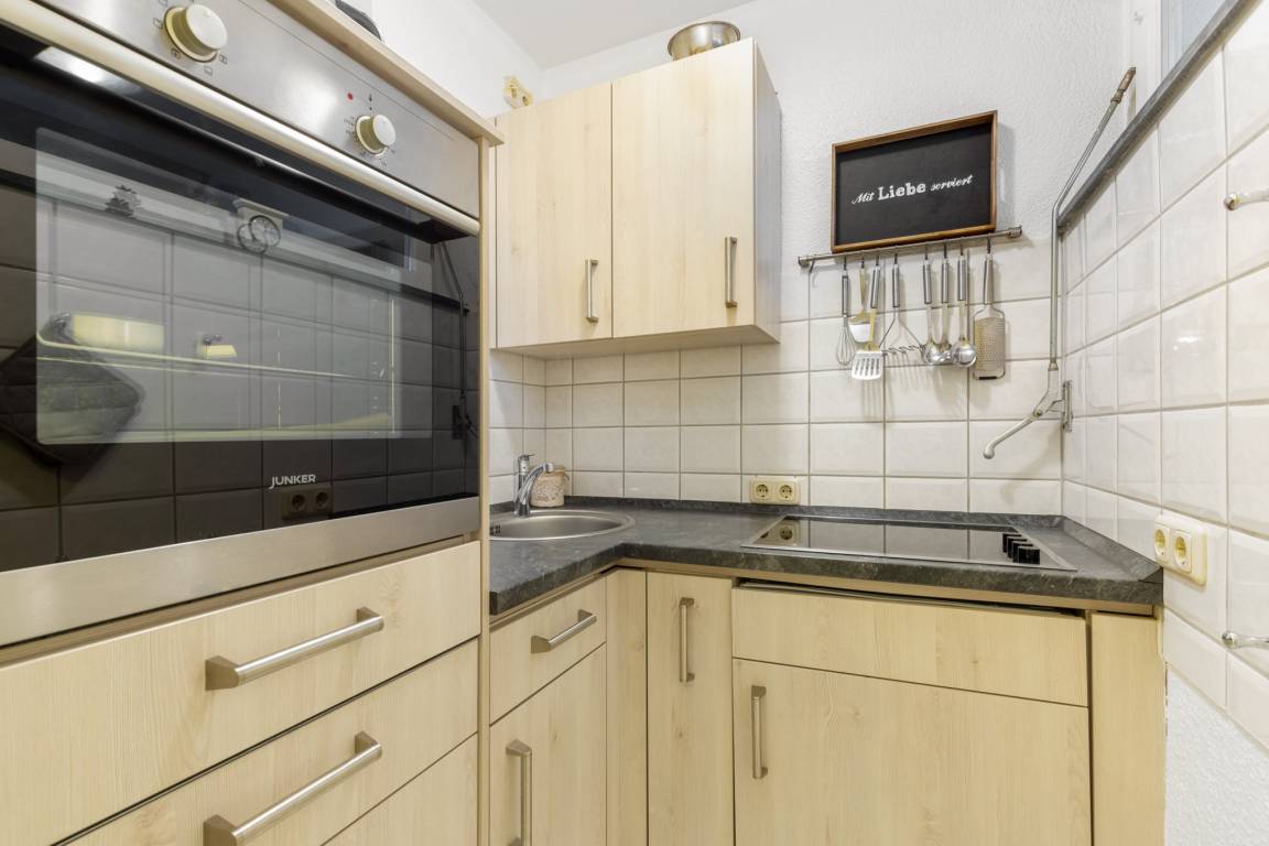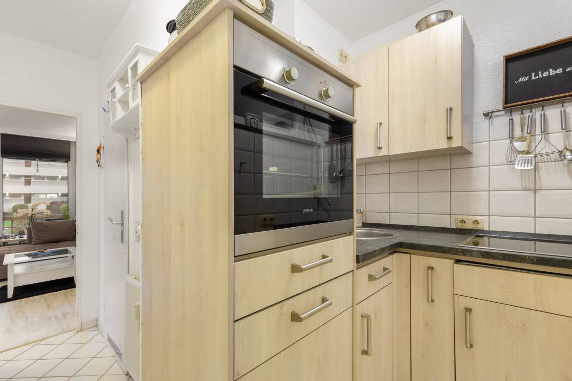 Komplett ausgestattete offene Küche mit Fenster zum Laubengang. Die Küche ist mit einem 4-Platten Cerankochfeld, einem Backofen und einer Spülmaschine ausgestattet. Außerdem stehen eine Kaffeemaschine, ein Toaster sowie ein Wasserkocher zur Verfügung.