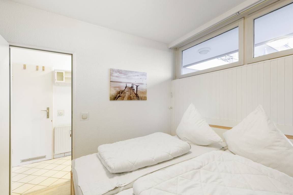 Freundliches, separates Schlafzimmer mit einem Doppelbett, einer Kommode und einem Kleiderschrank. Das Schlafzimmer ist mit Laminat ausgelegt. Die schmalen Fenster zum Laubengang lassen sich durch Rollos verdunkeln.