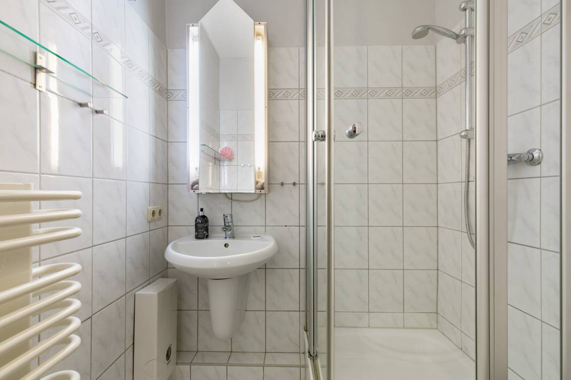 Modernes, hell gefliestes Bad mit Dusche, WC und Waschbecken.
